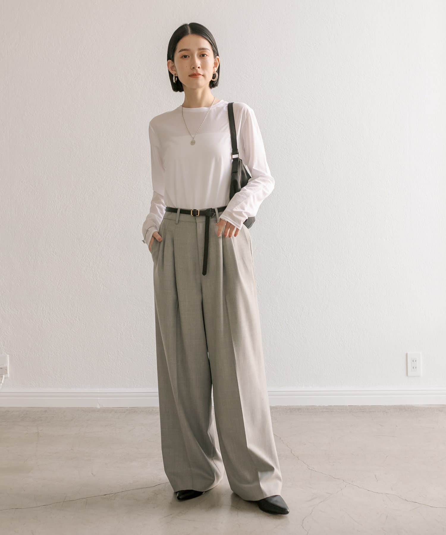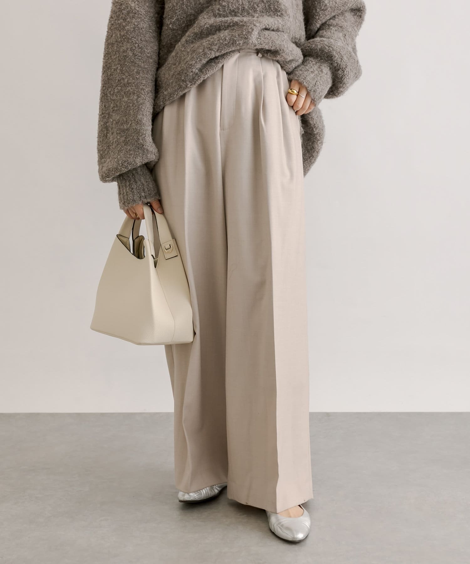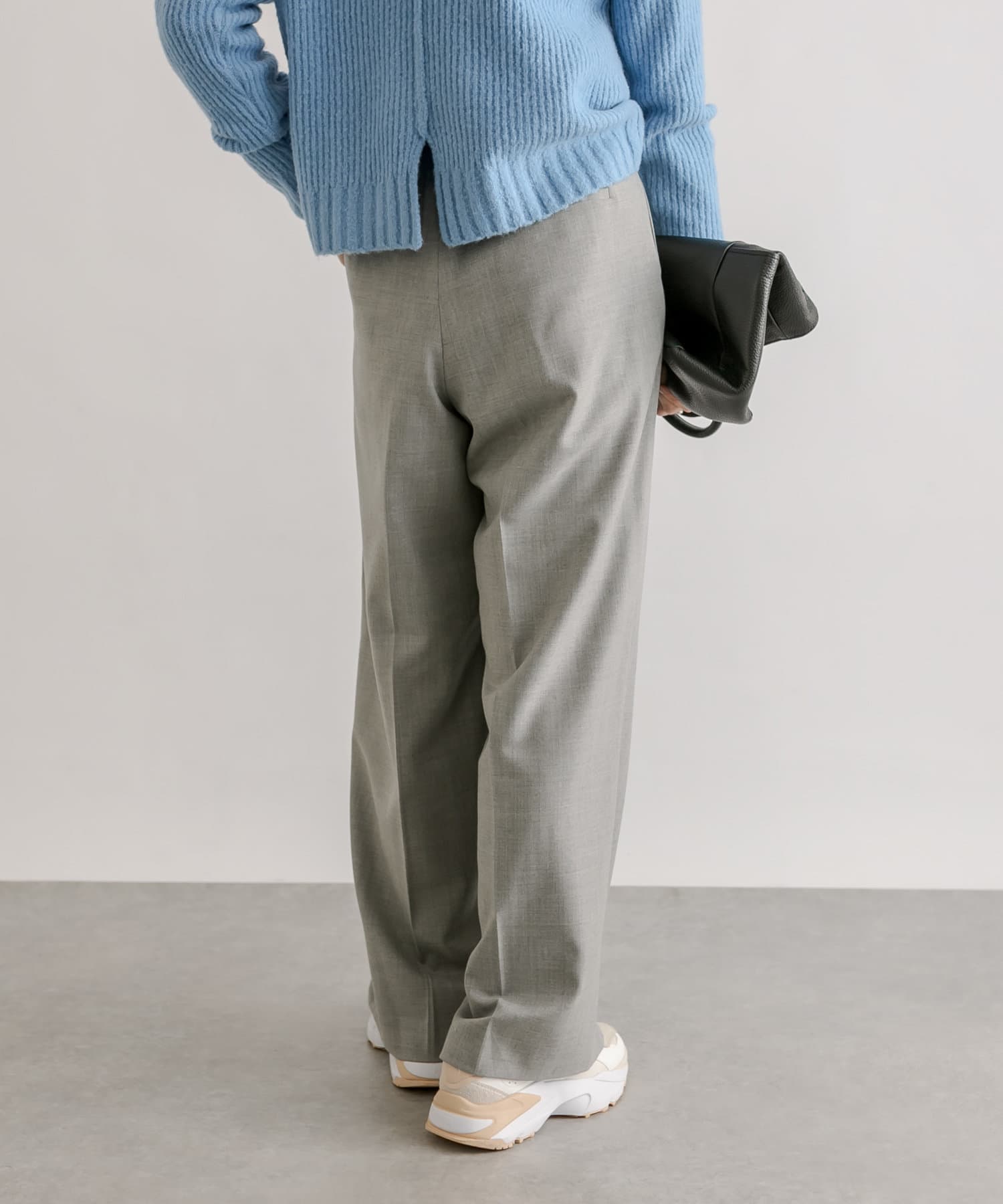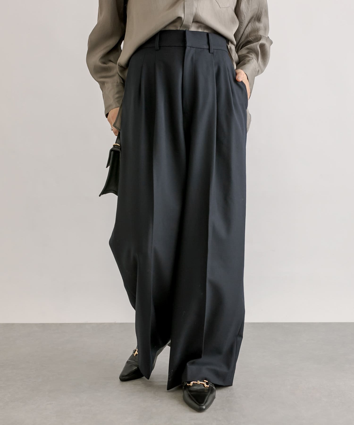 少し太めの2タックを入れたワイドシルエット。センタープレスも入ったマニッシュな印象が今年らしい雰囲気に。