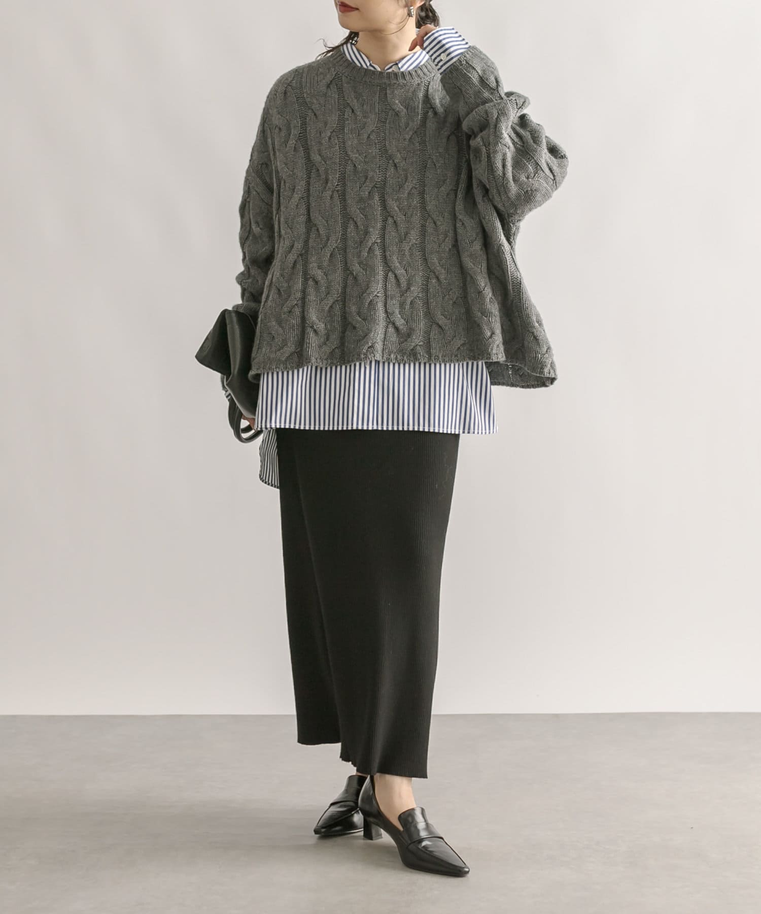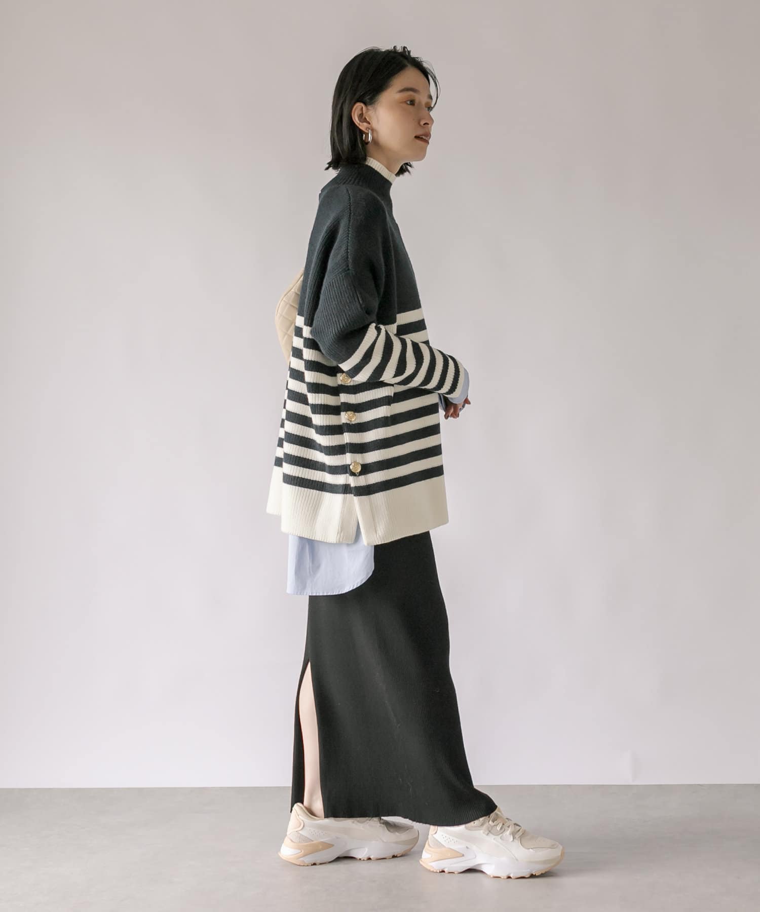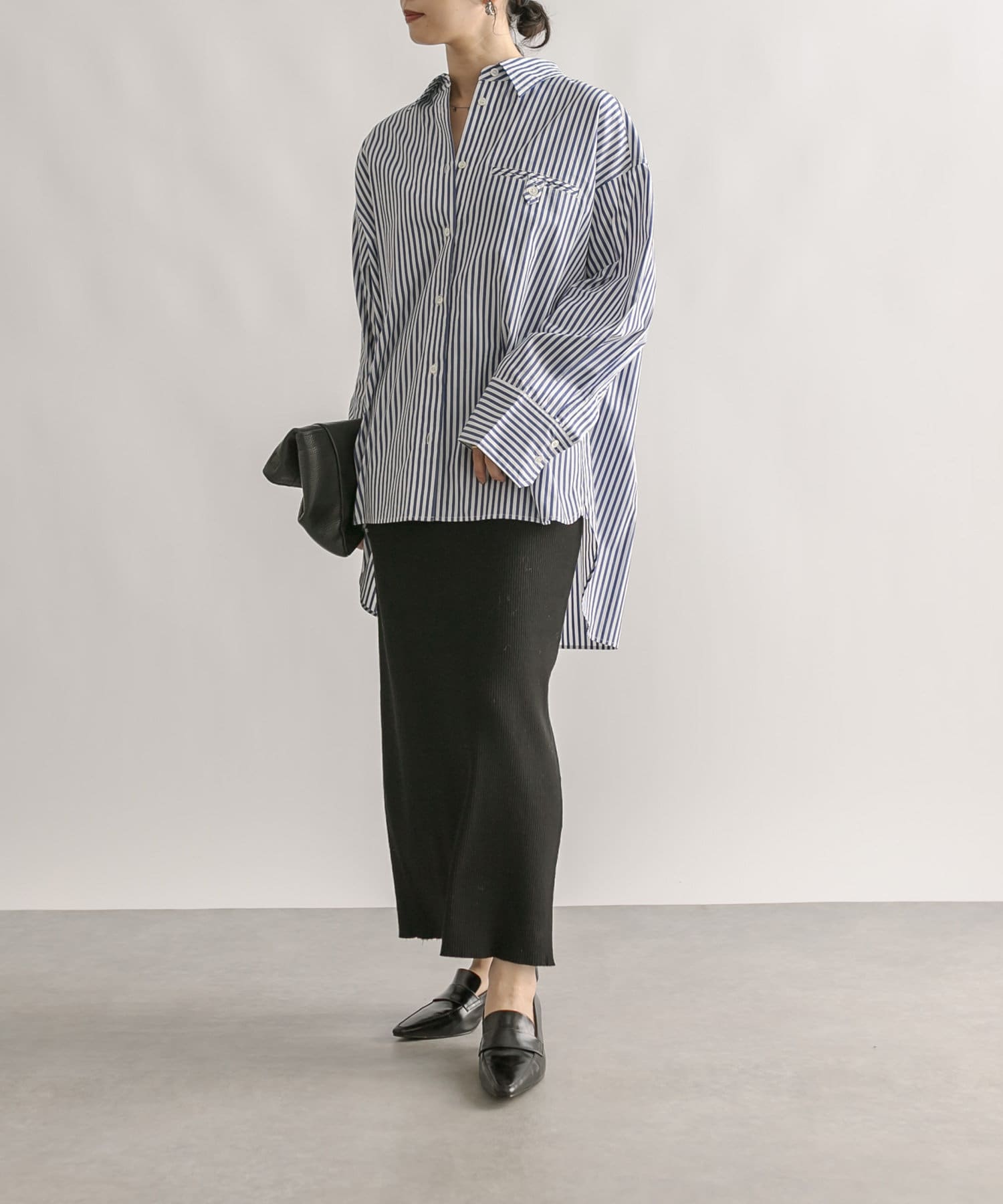 長めの着丈でお尻がすっぽりと隠れるため、腰回りのカバーが出来る安心感のある一着。