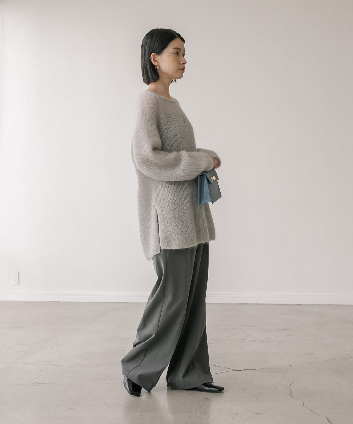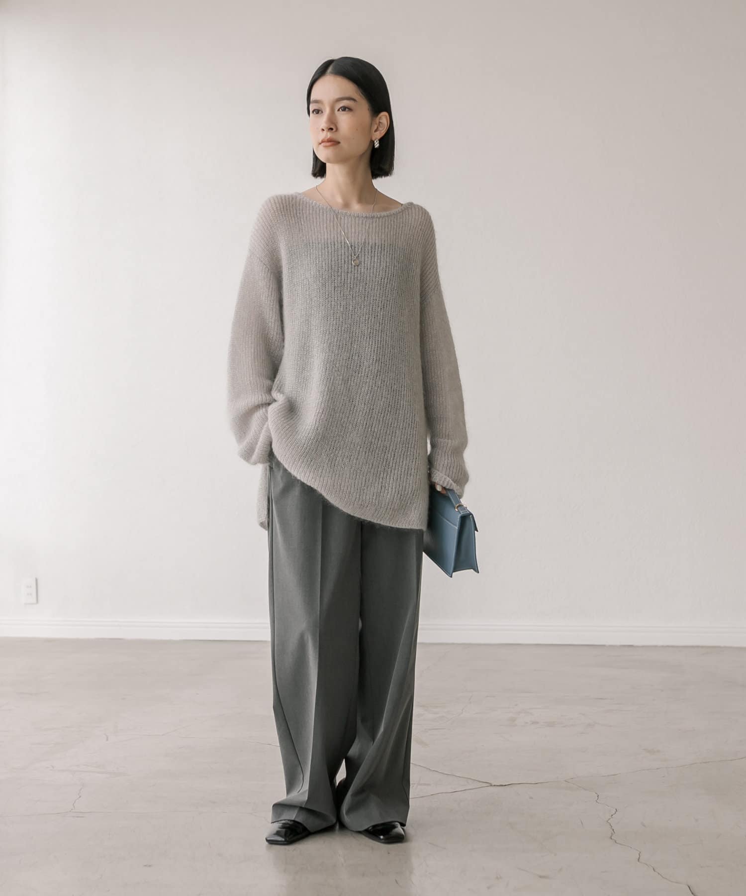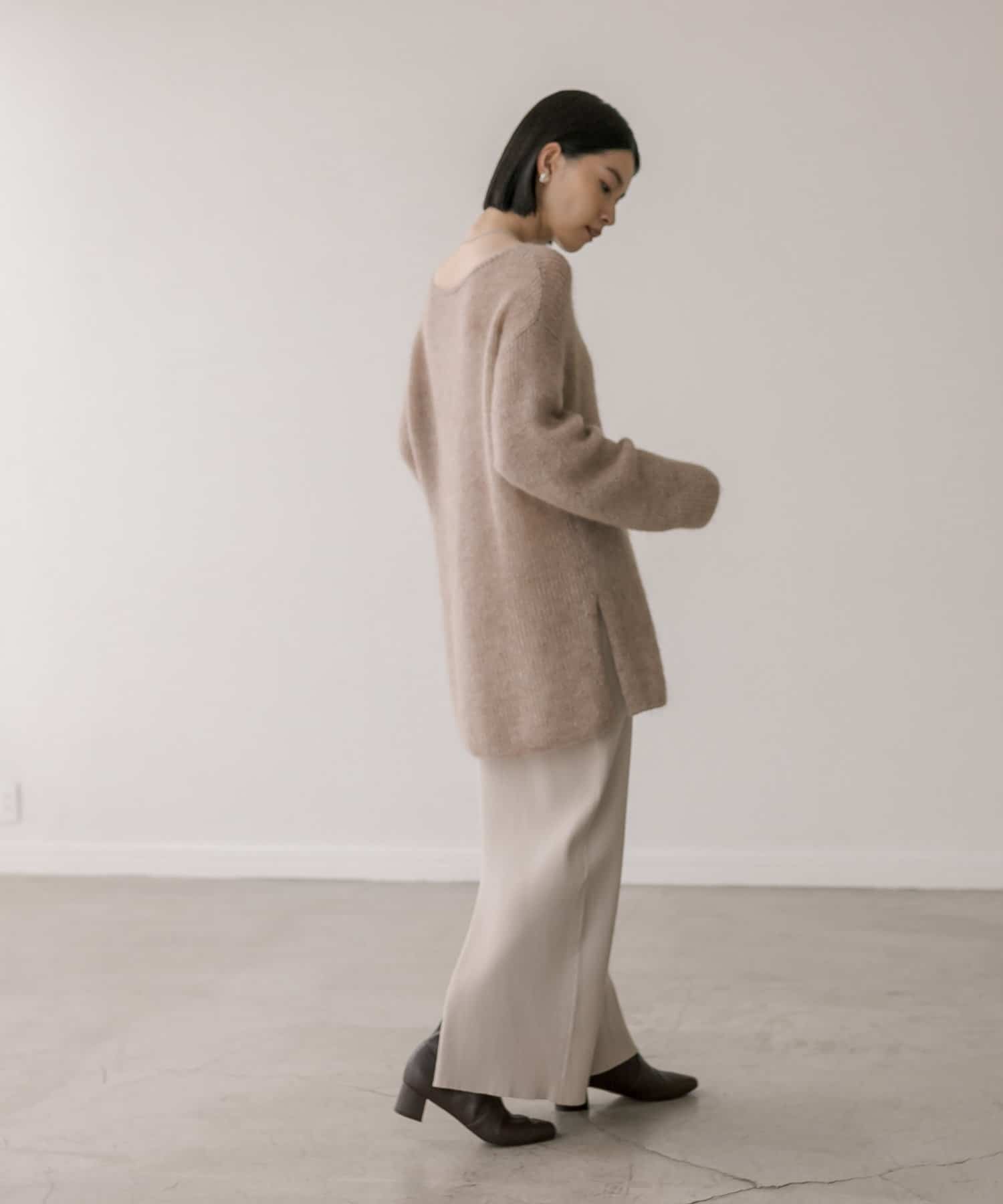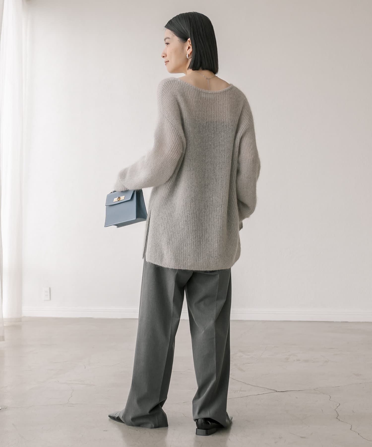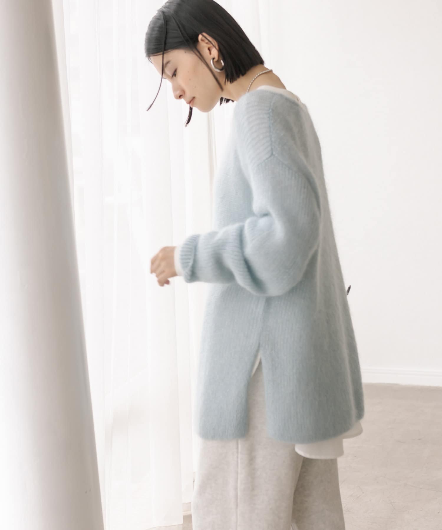 ※こちらの商品はモヘア素材を使用しております。モヘアのデリケートな風合いを生かし、柔らかい素材感を損なわないため、糸同士がゆるく結ばれておりますので、毛抜けが出る商品となっております。予めご了承くださいますようお願い申し上げます。