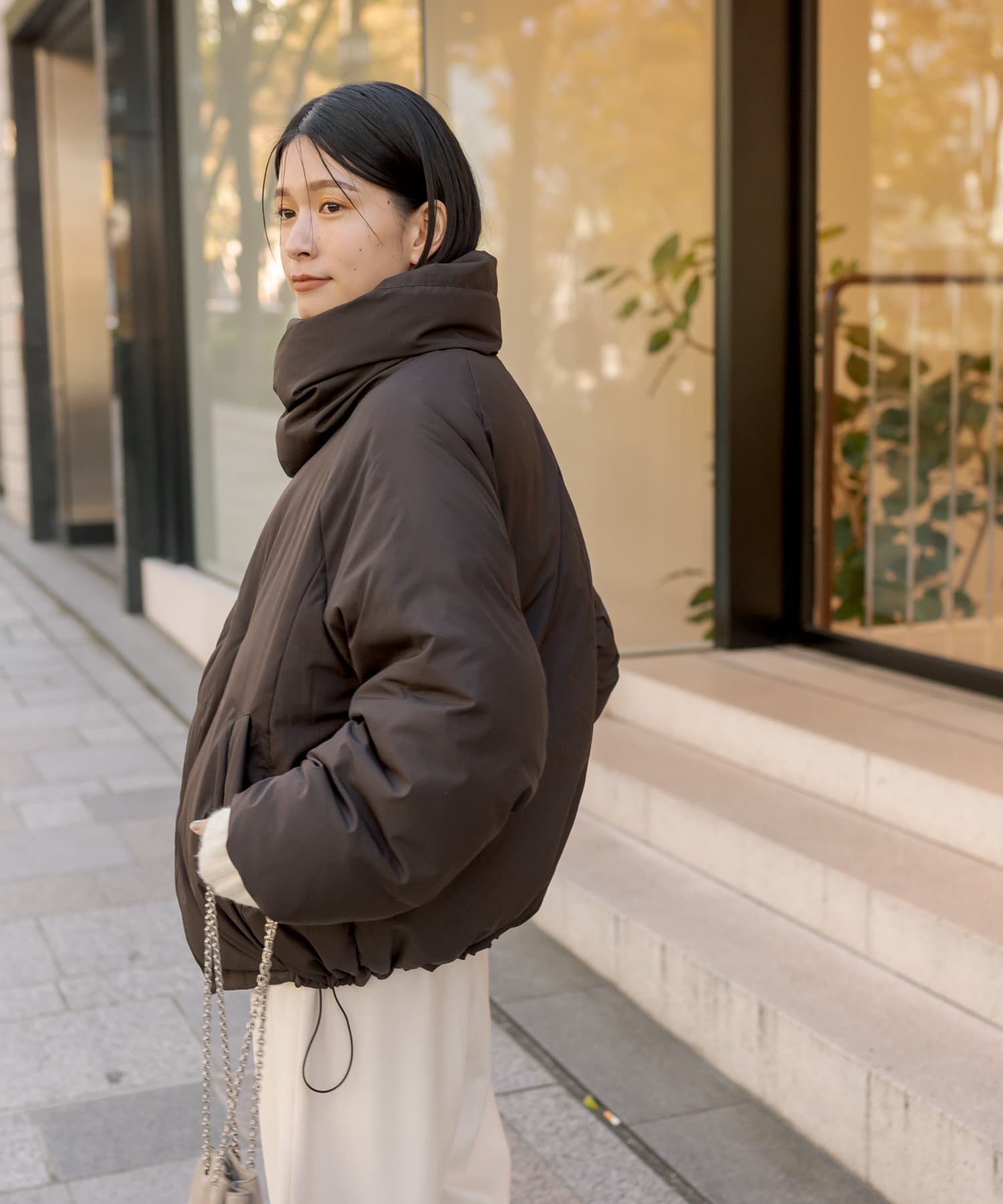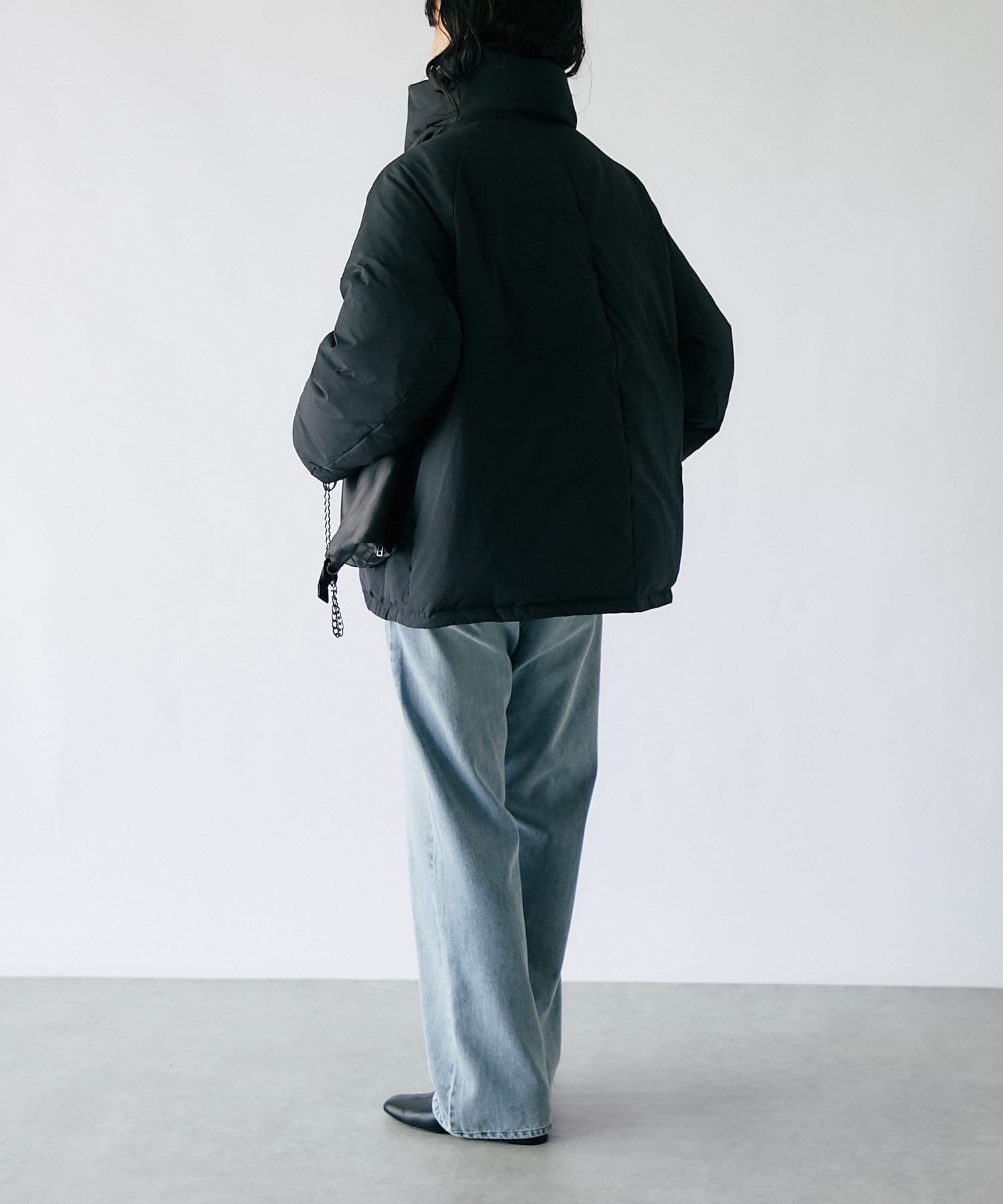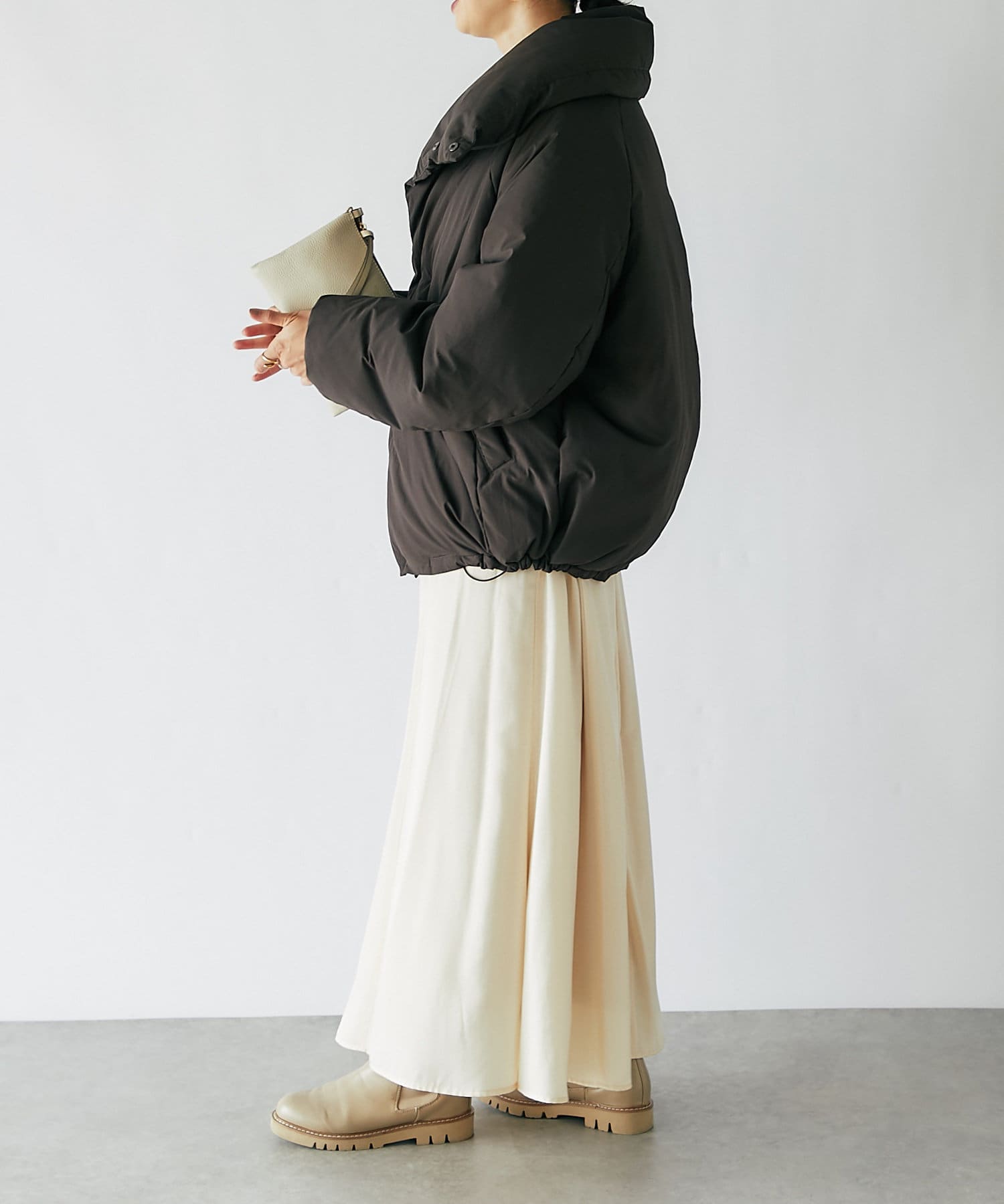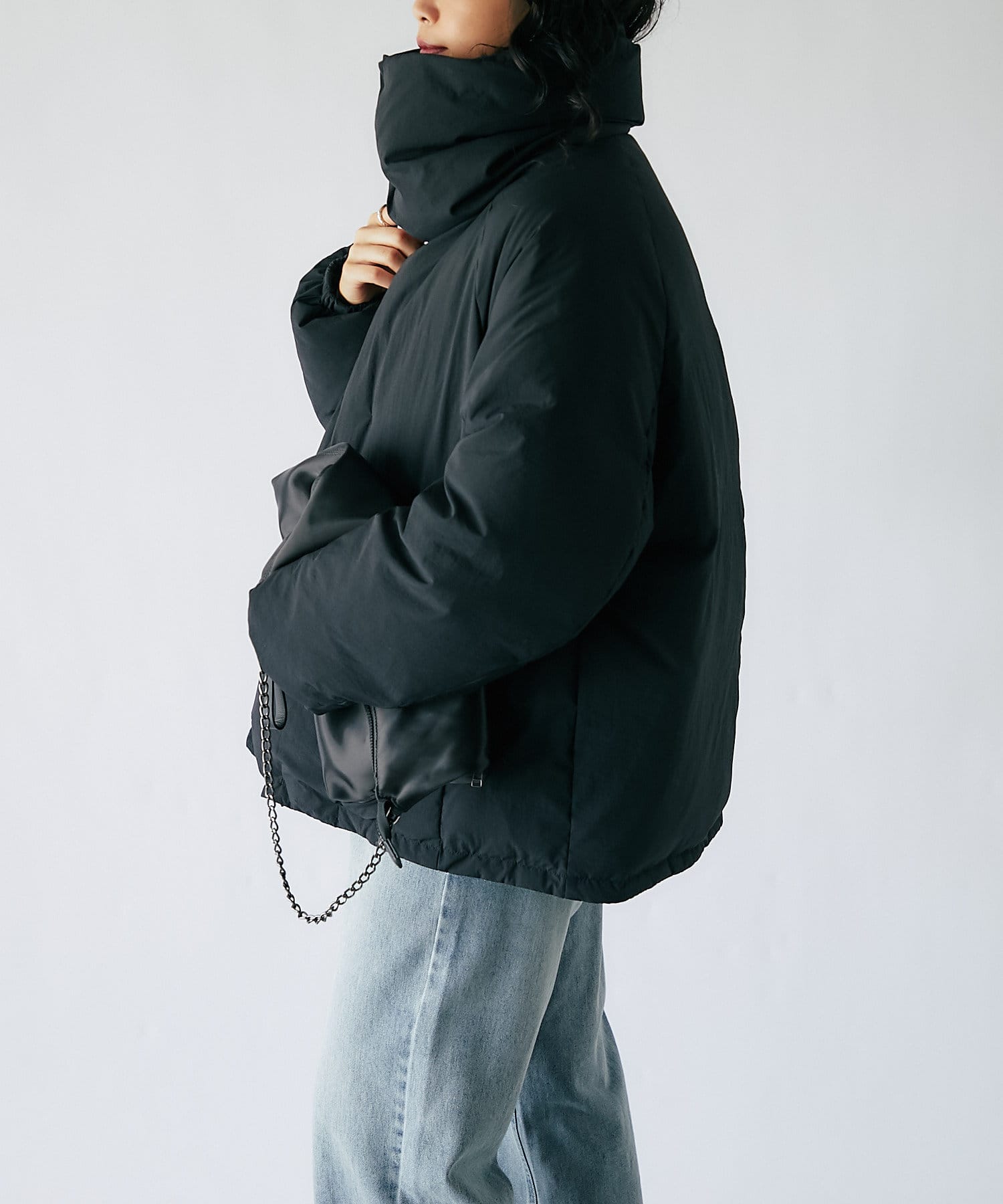 マフラーいらずのハイネック仕様、ゴム入りの袖口、ヒップが隠れる程度の着丈と、風の強い日にも安心の設計。