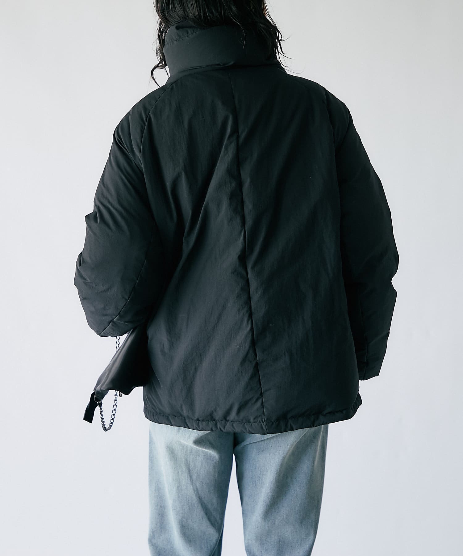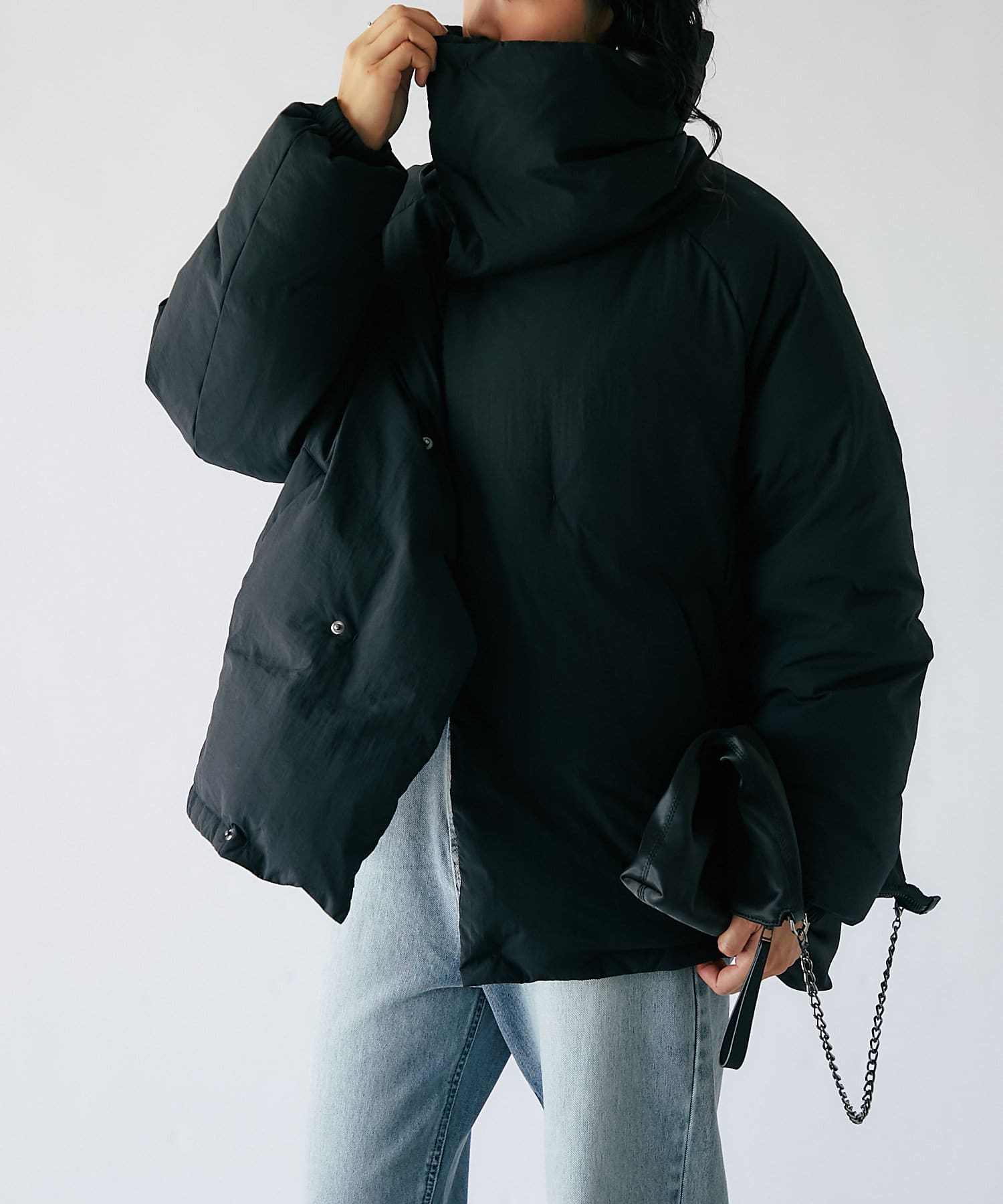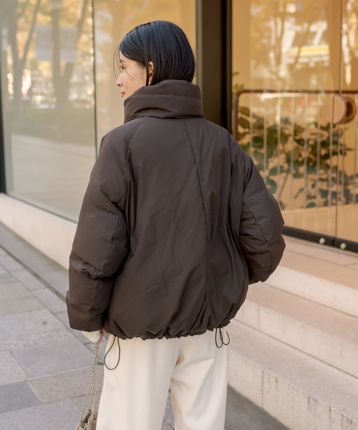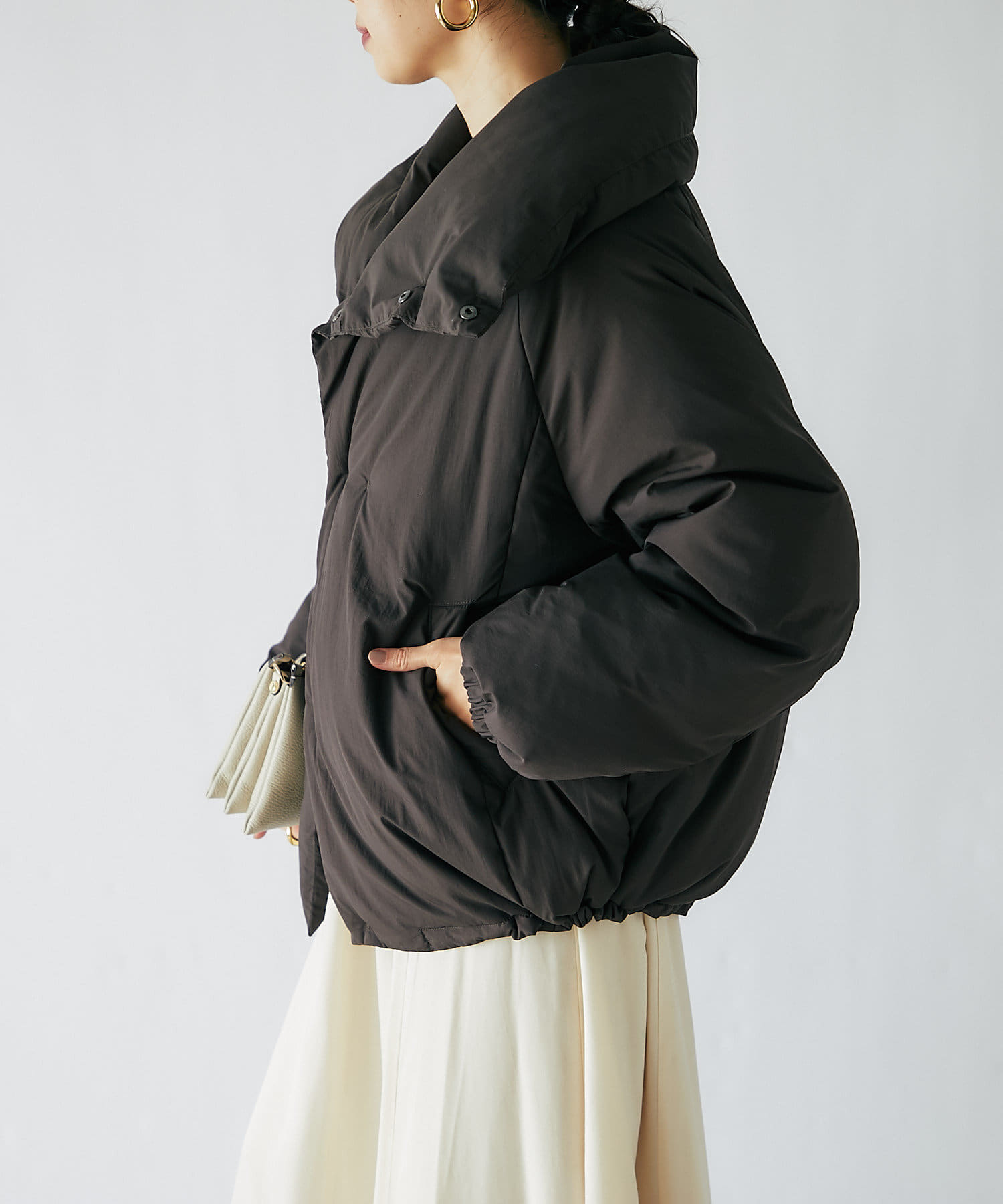 マフラーいらずのハイネック仕様、ゴム入りの袖口、ヒップが隠れる程度の着丈と、風の強い日にも安心の設計。