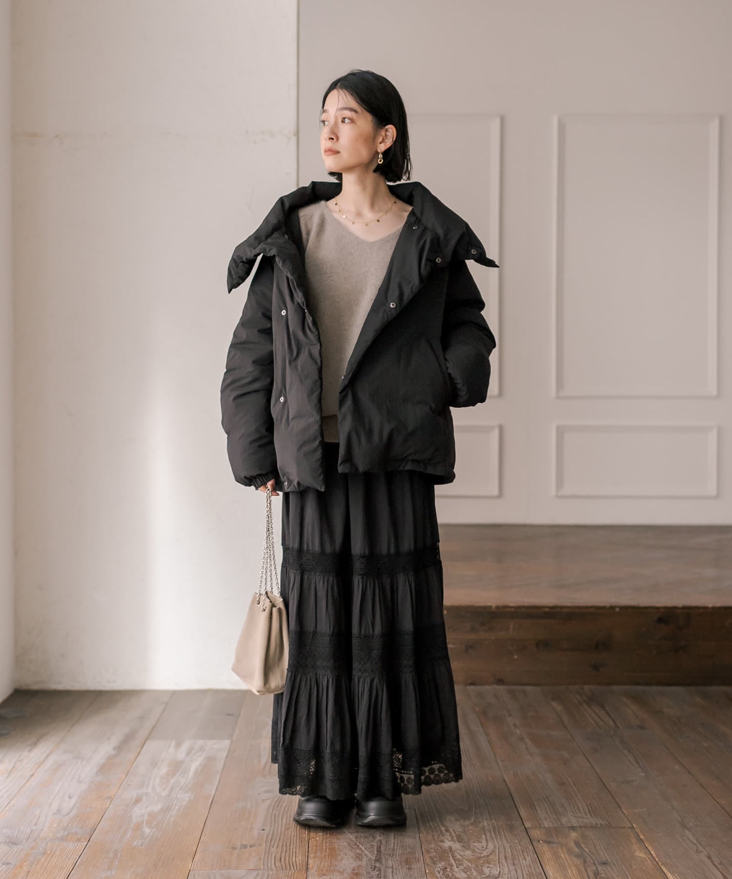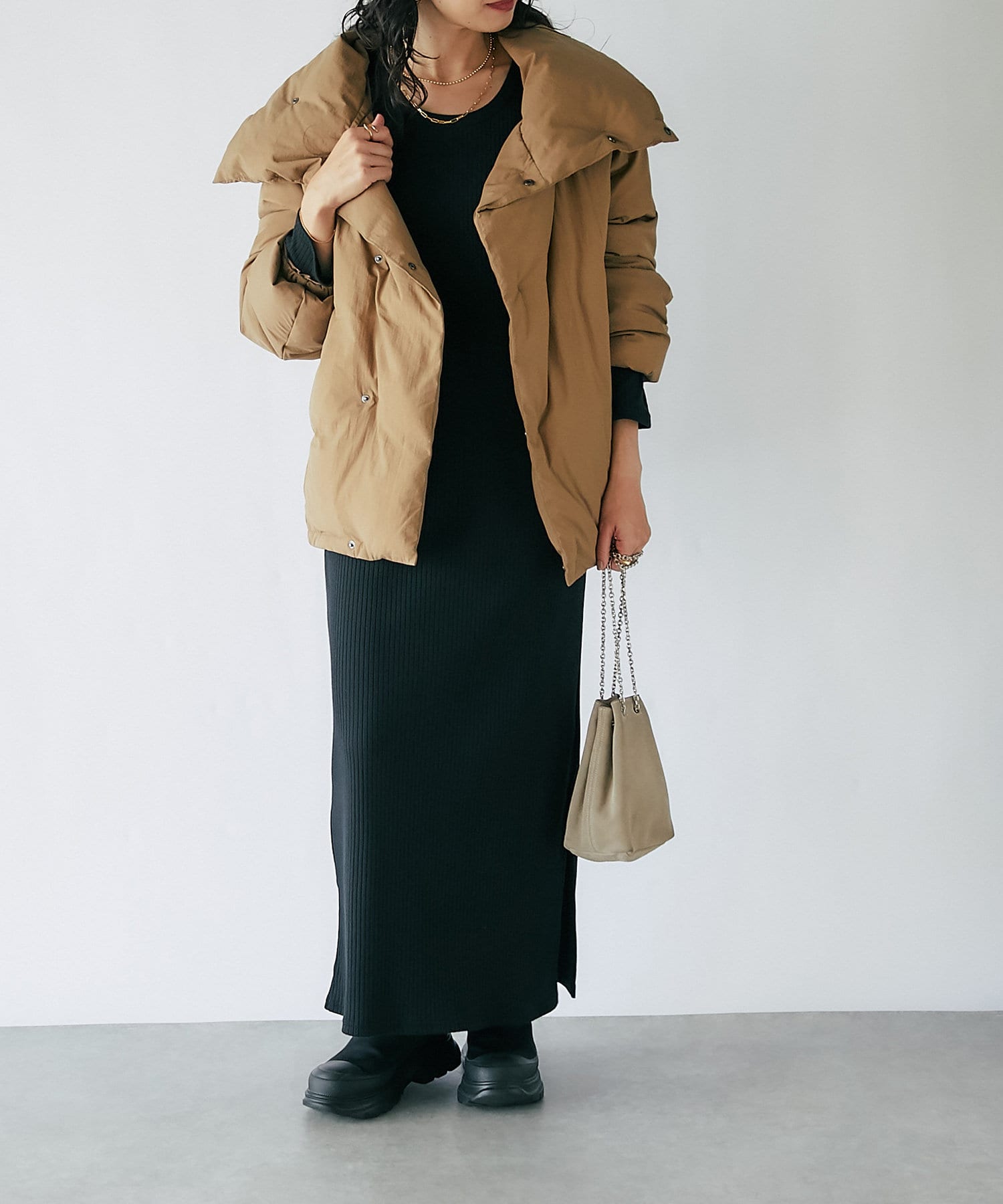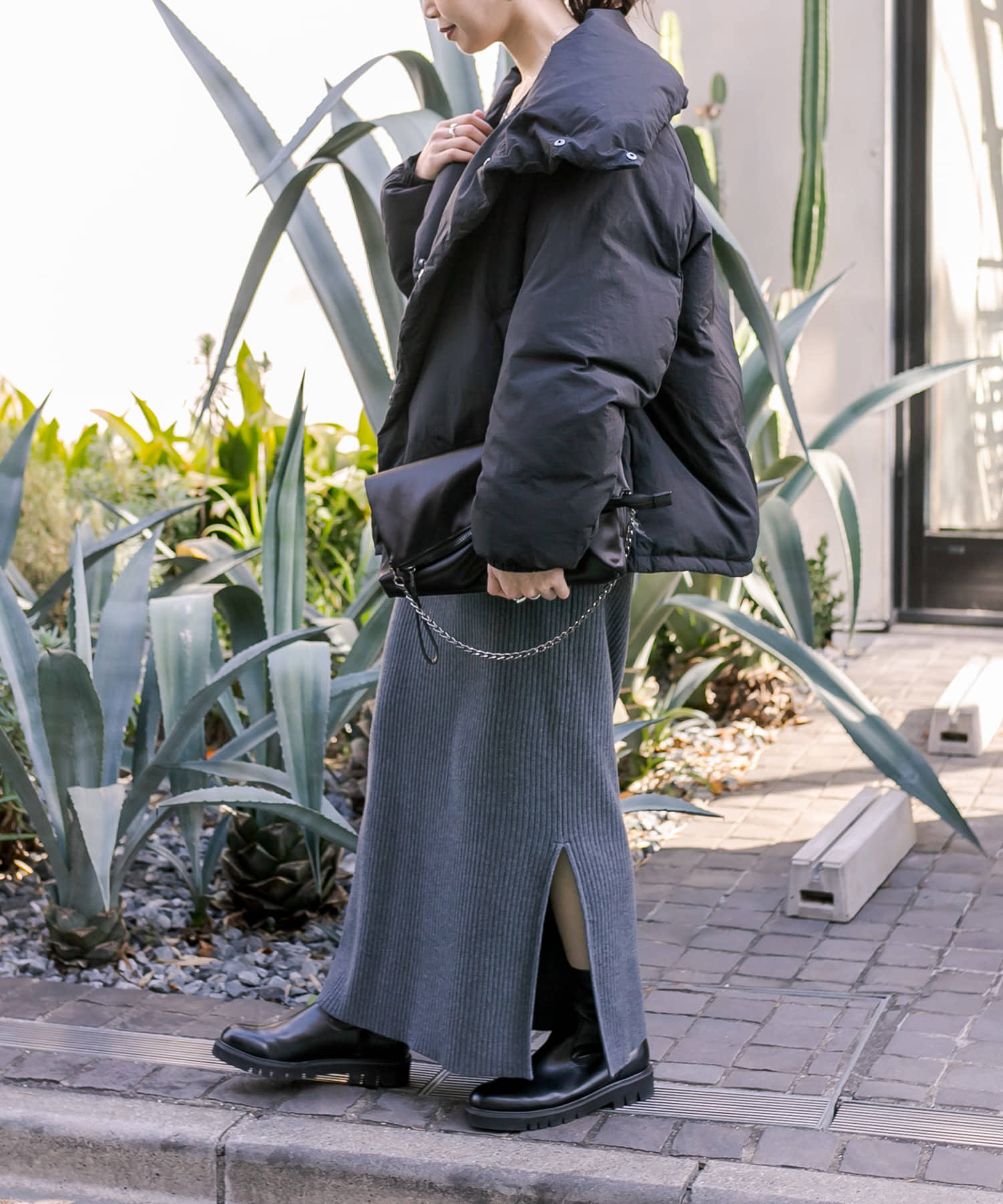 ゆったりとしたサイズ感なので、厚手のニットも中に着こみやすいです。