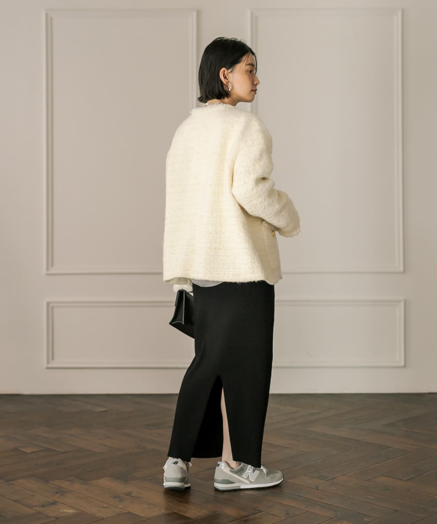 トレンドのツイード素材が程よく品の良さを引き立て、フリンジ使いがコーディネートのポイントに◎