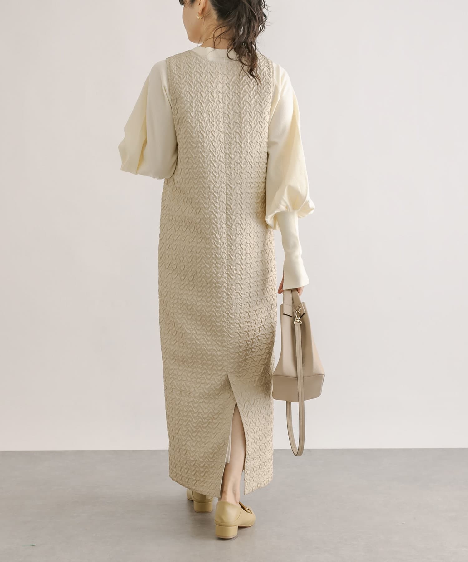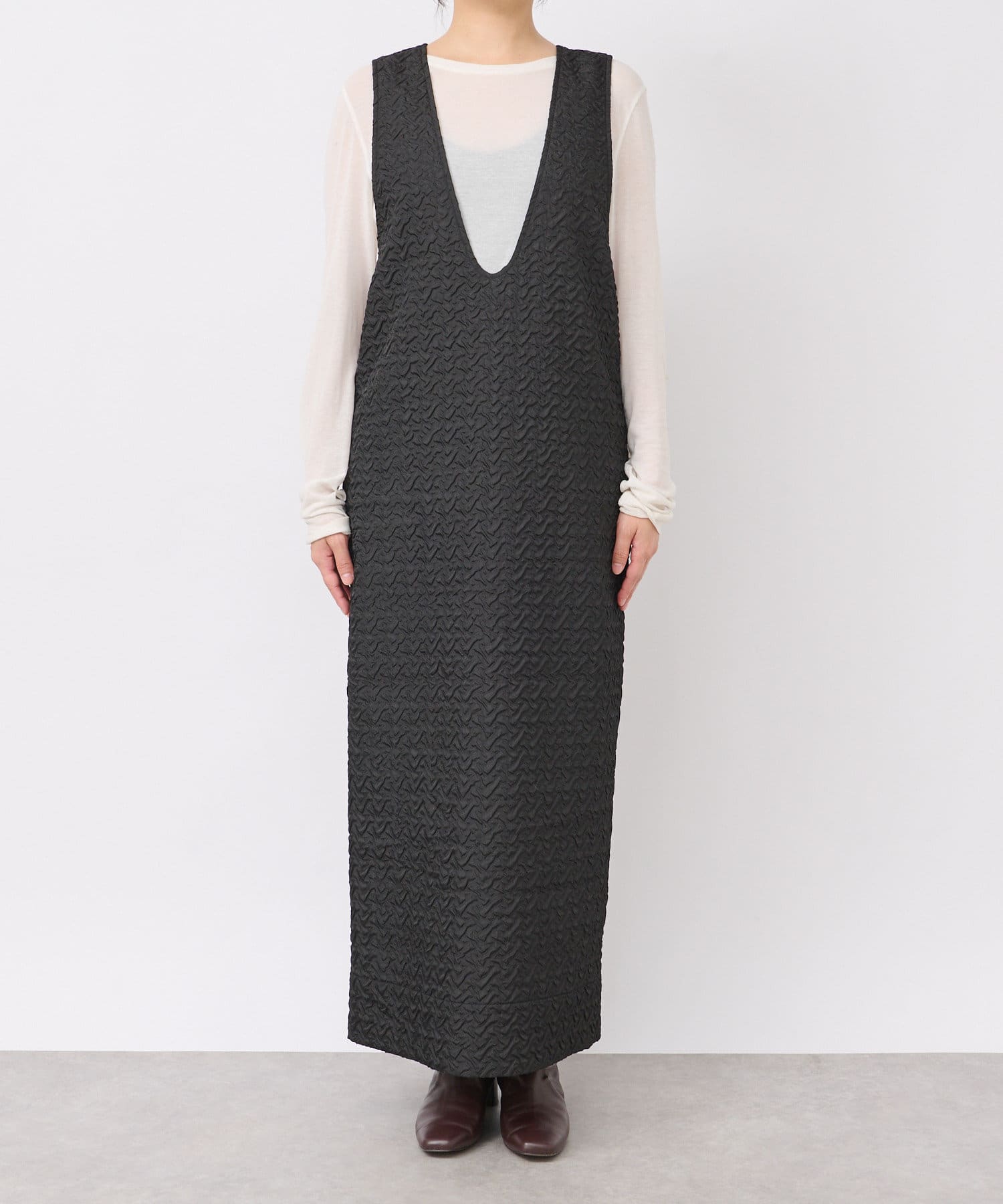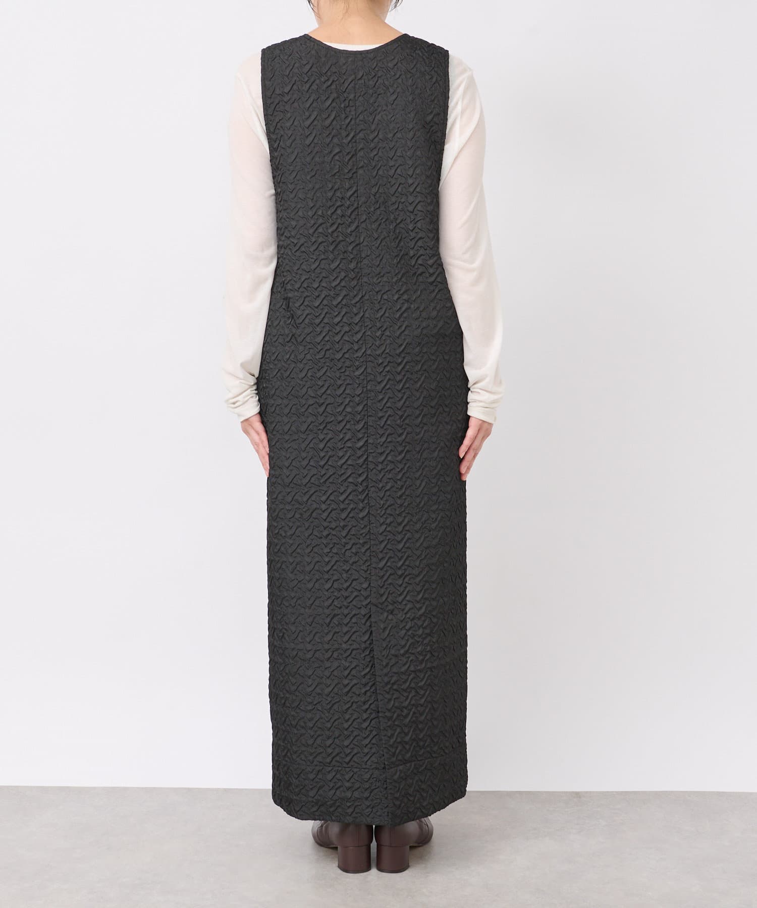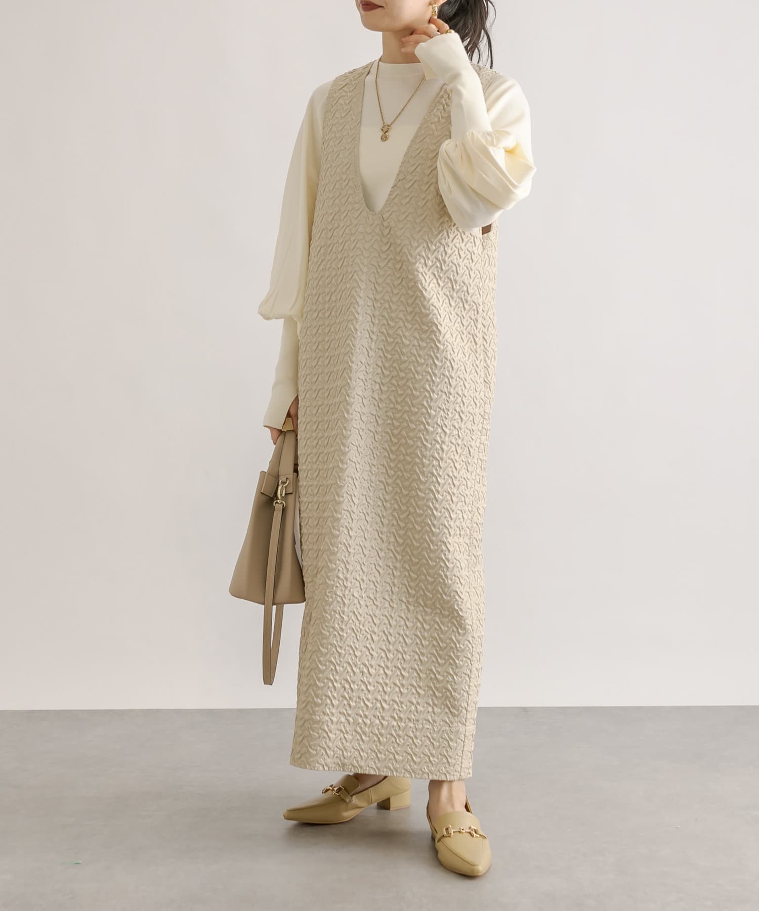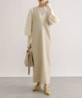 ポコポコした素材感が着映えするシンプルなIラインワンピース。