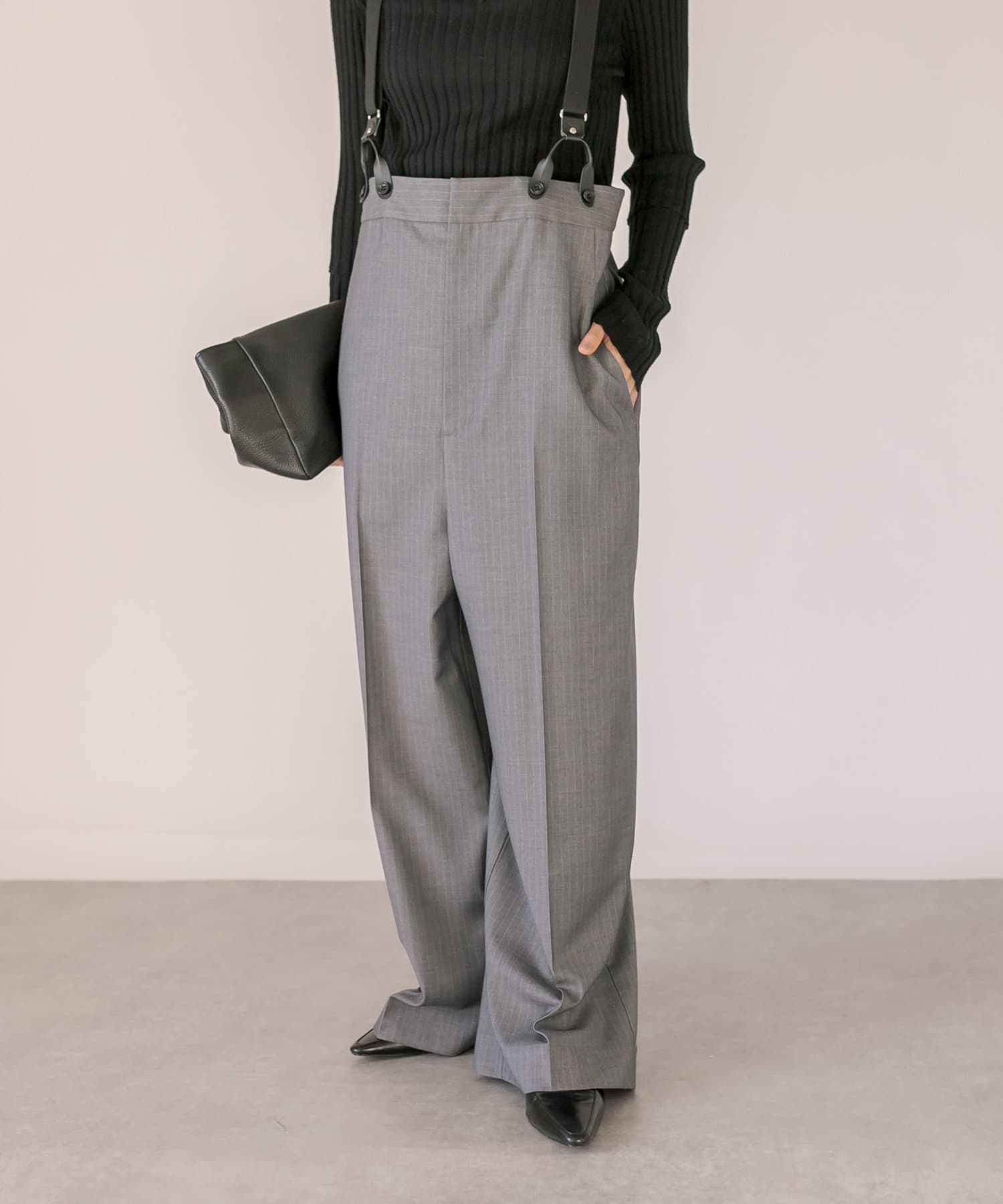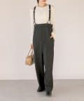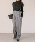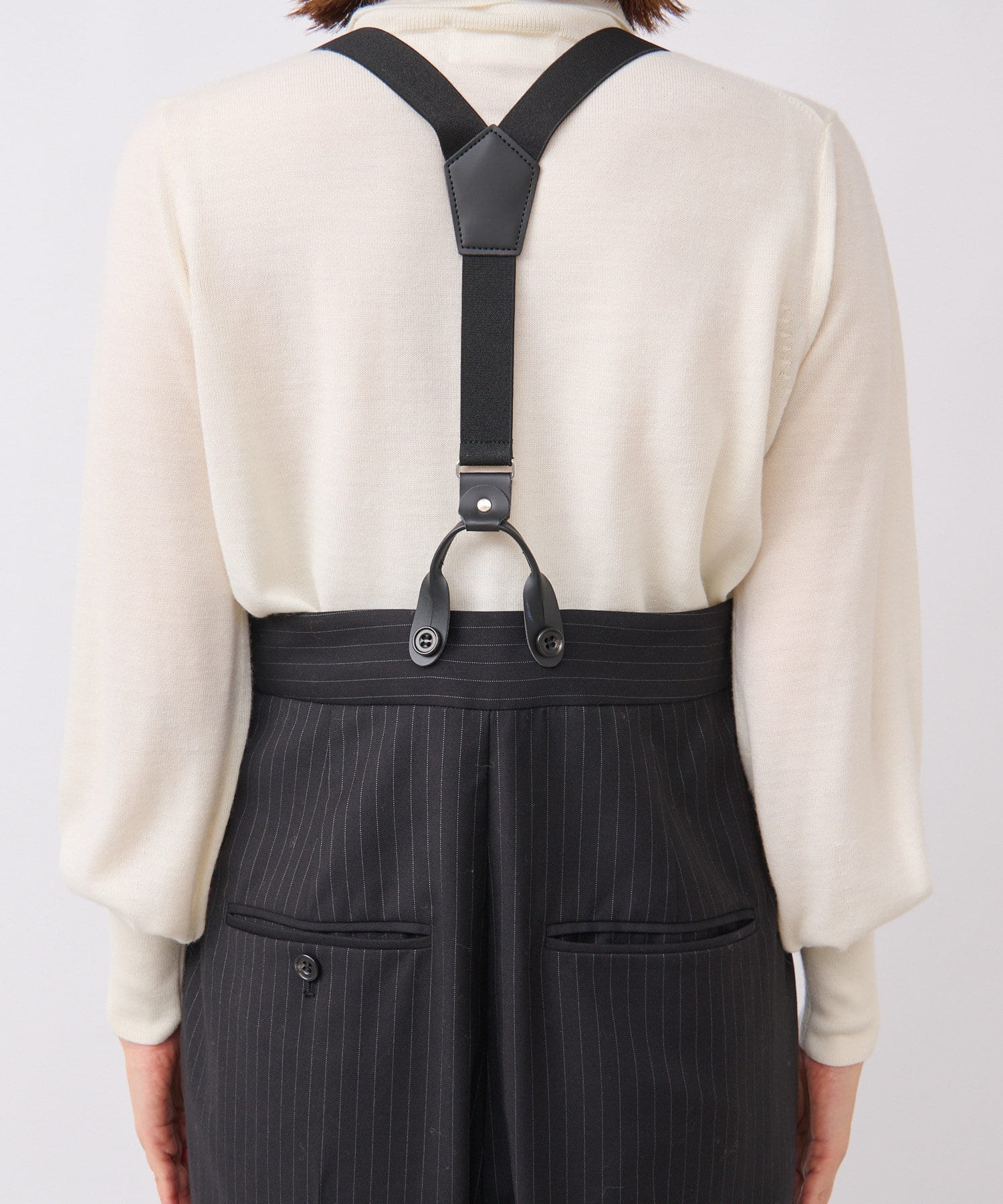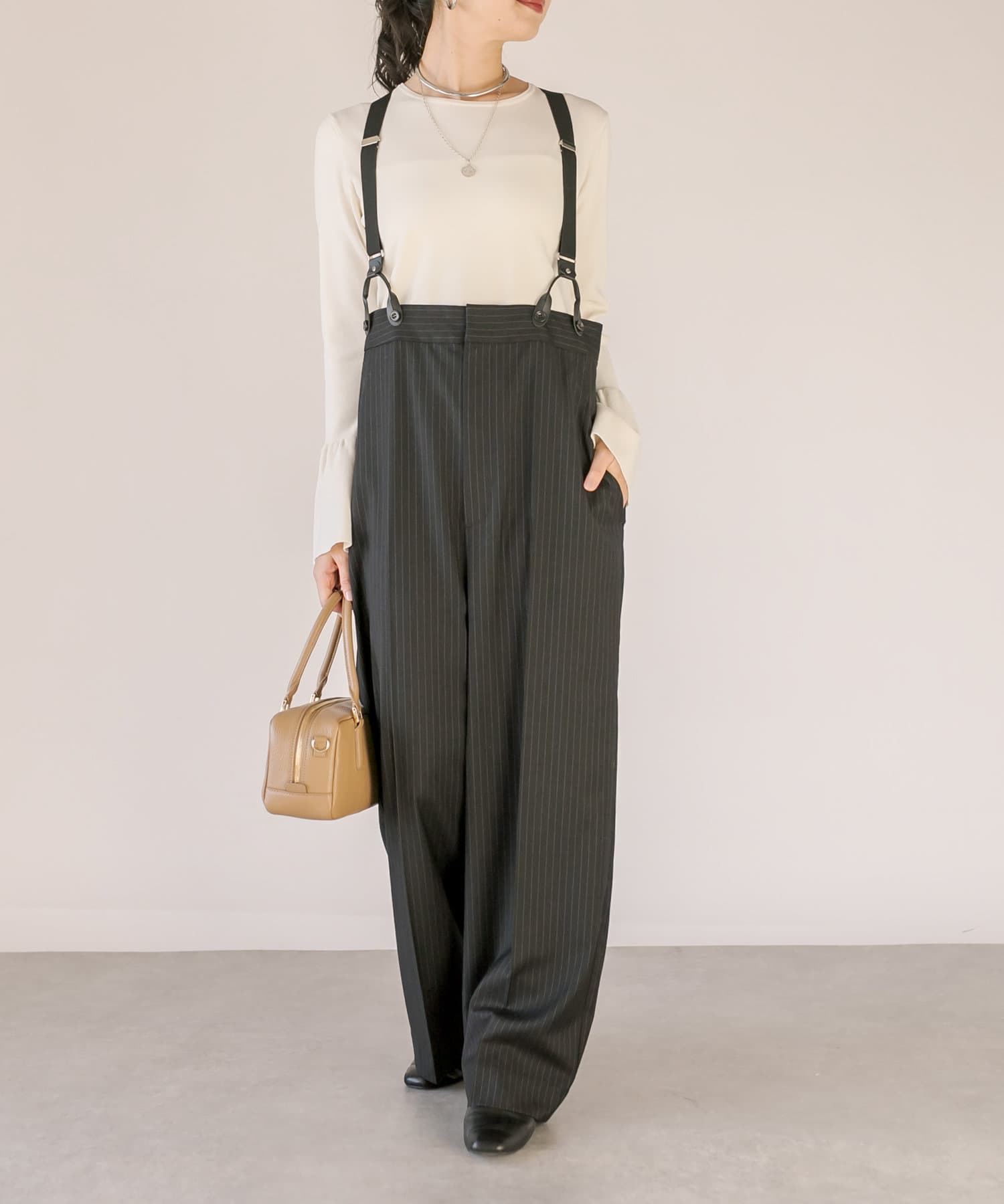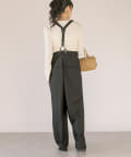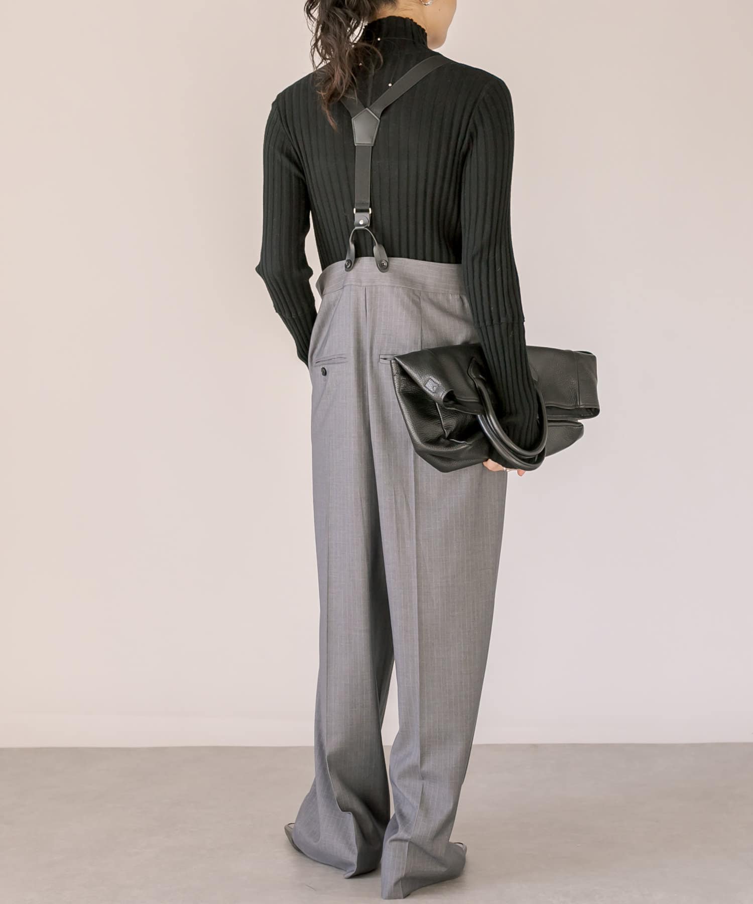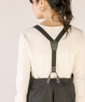 付属のサスペンダーで吊った状態で履いたり、ウエスト部分のドロストをきゅっとしめてジャストウエストで着たりと着こなし次第で様々な雰囲気を楽しめます。
