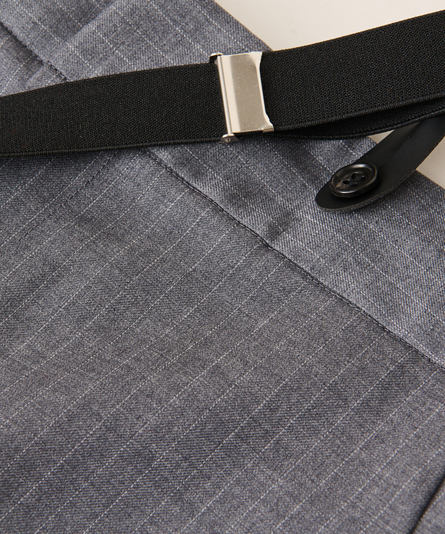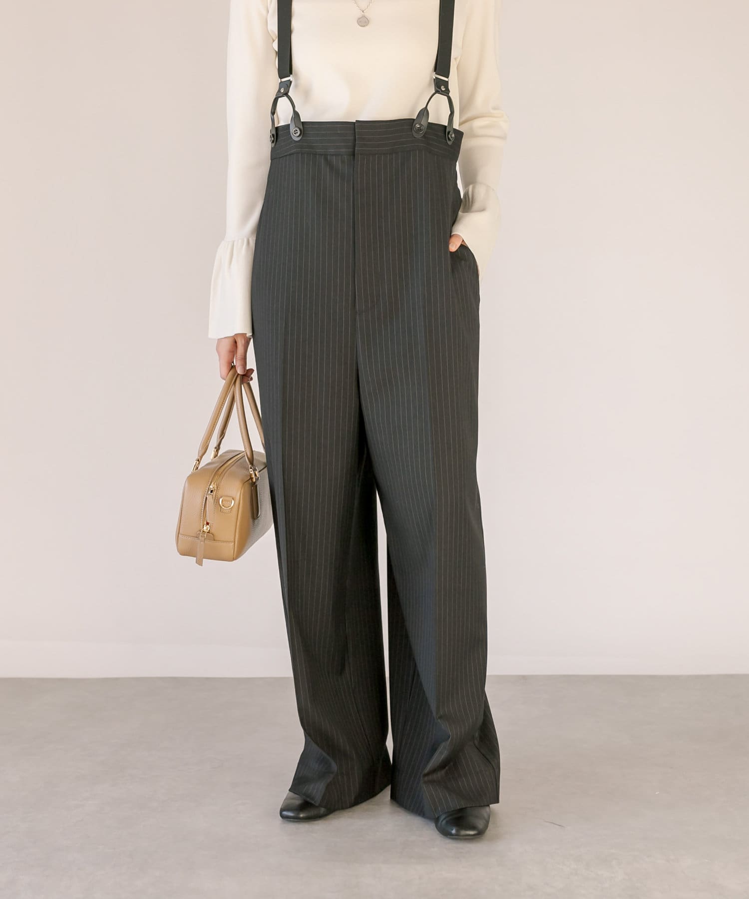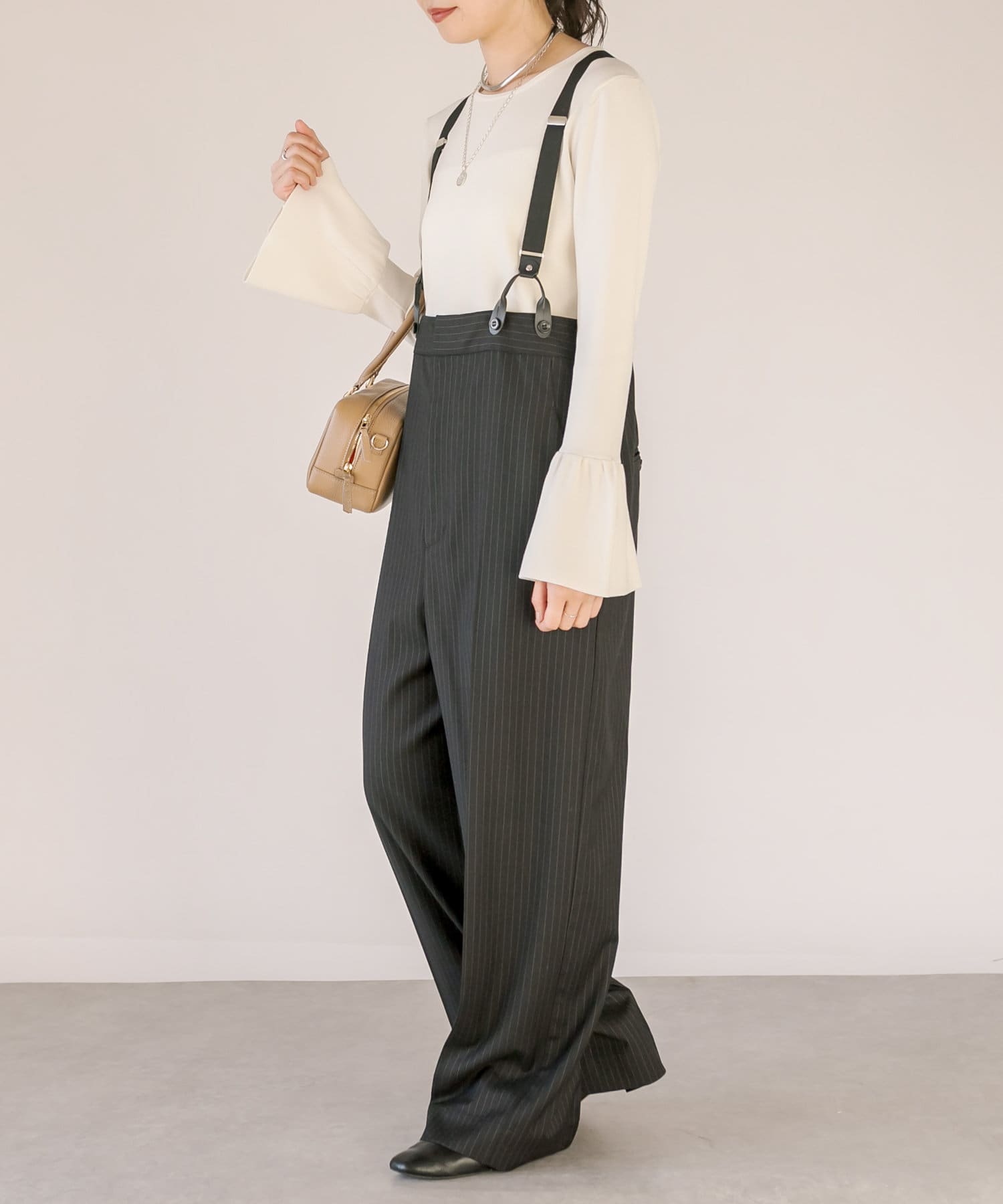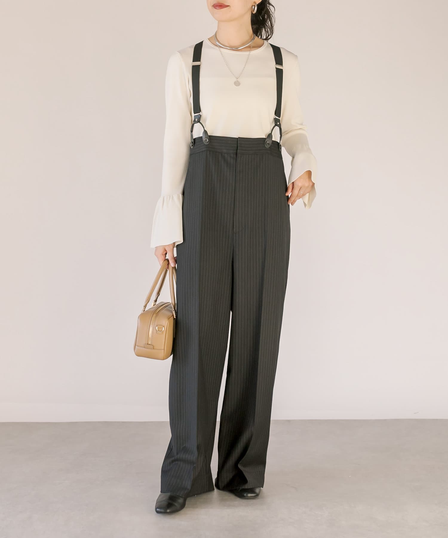 付属のサスペンダーで吊った状態で履いたり、ウエスト部分のドロストをきゅっとしめてジャストウエストで着たりと着こなし次第で様々な雰囲気を楽しめます。