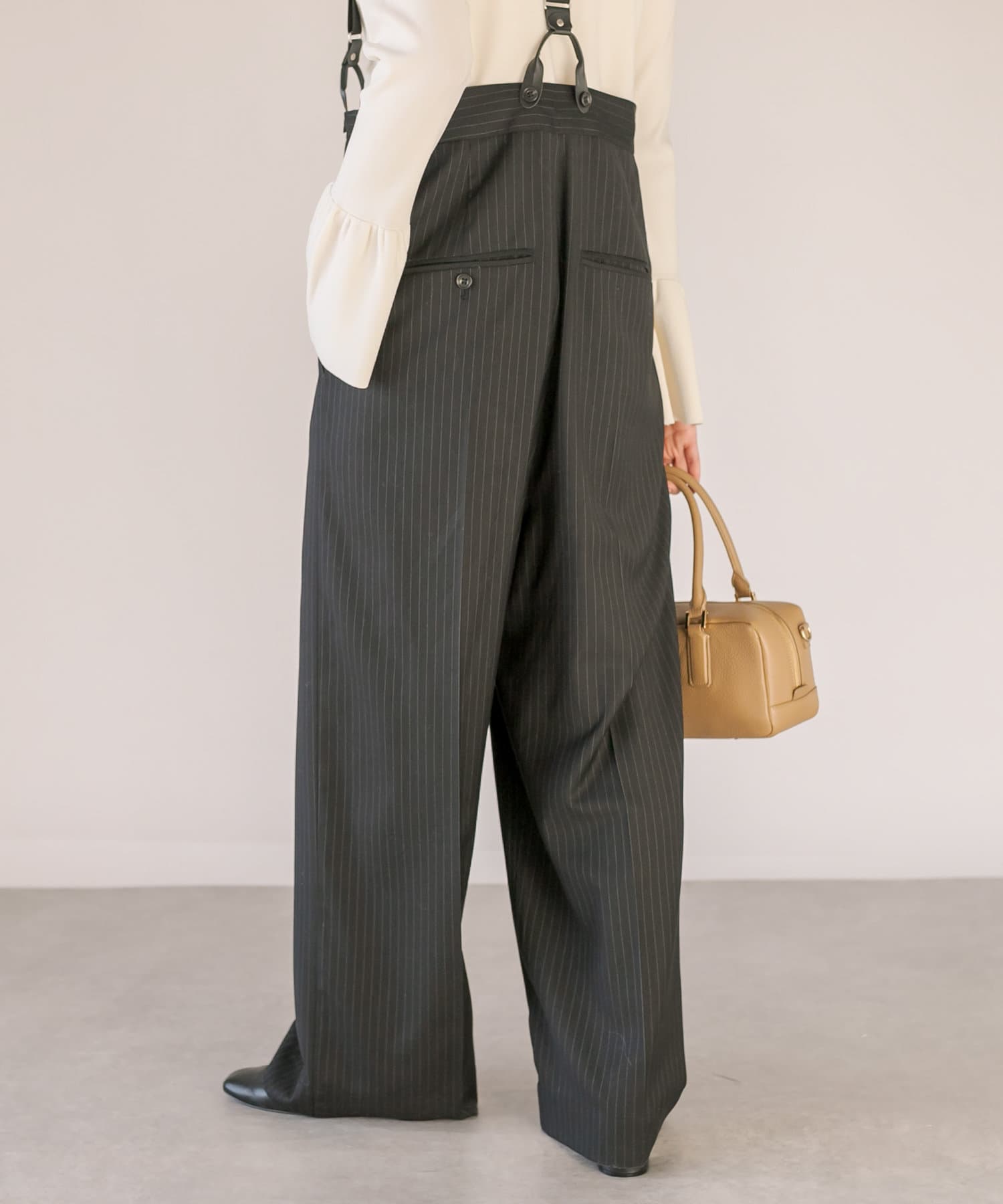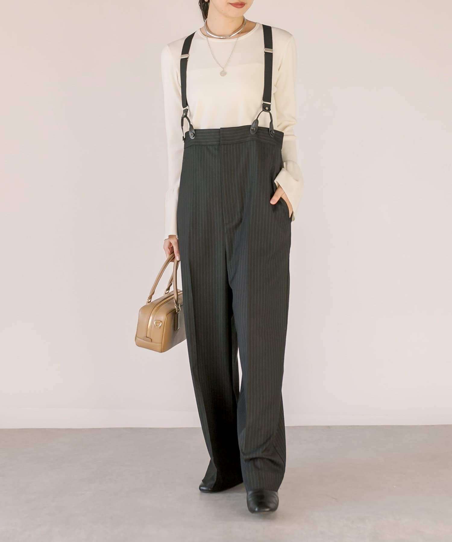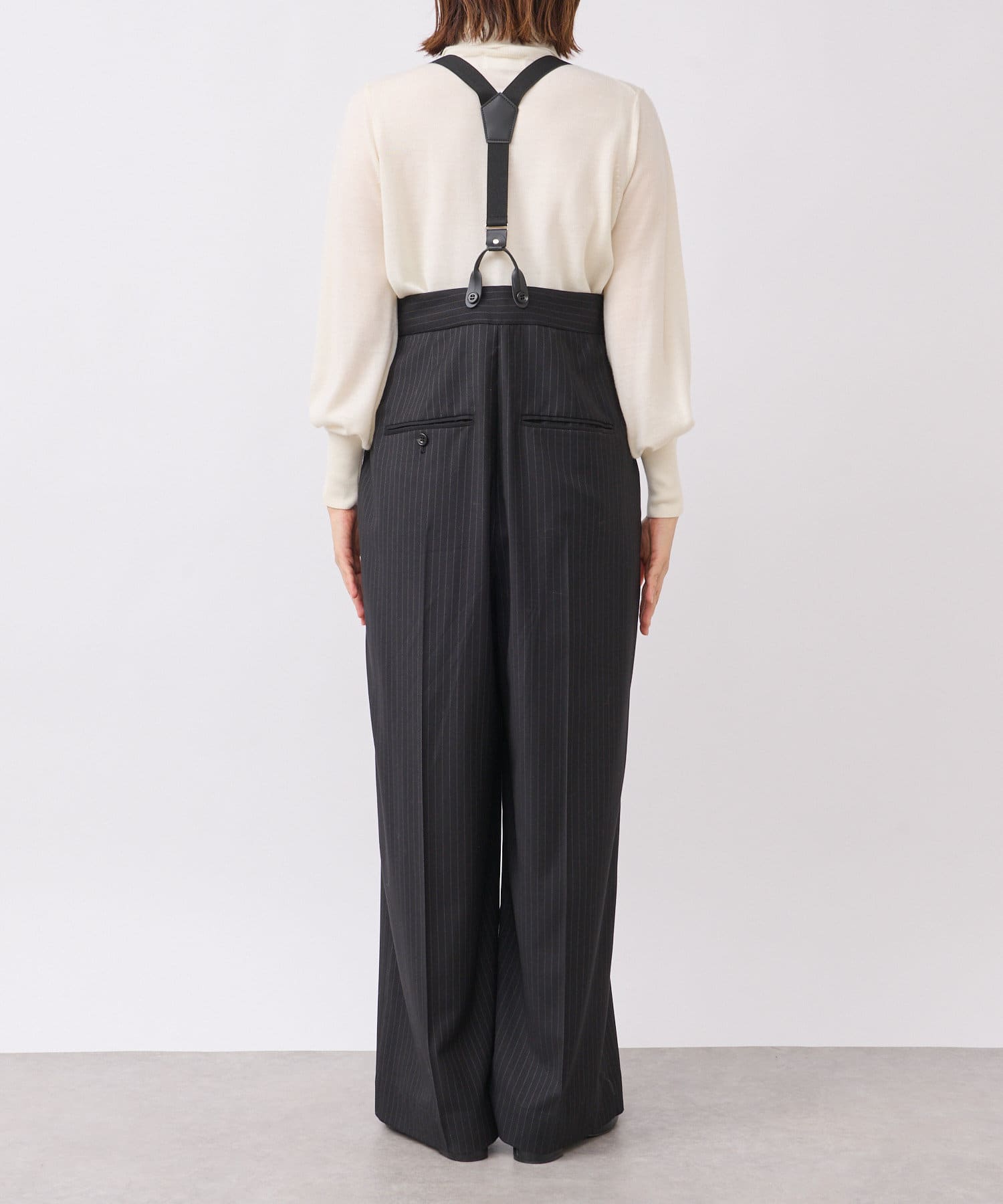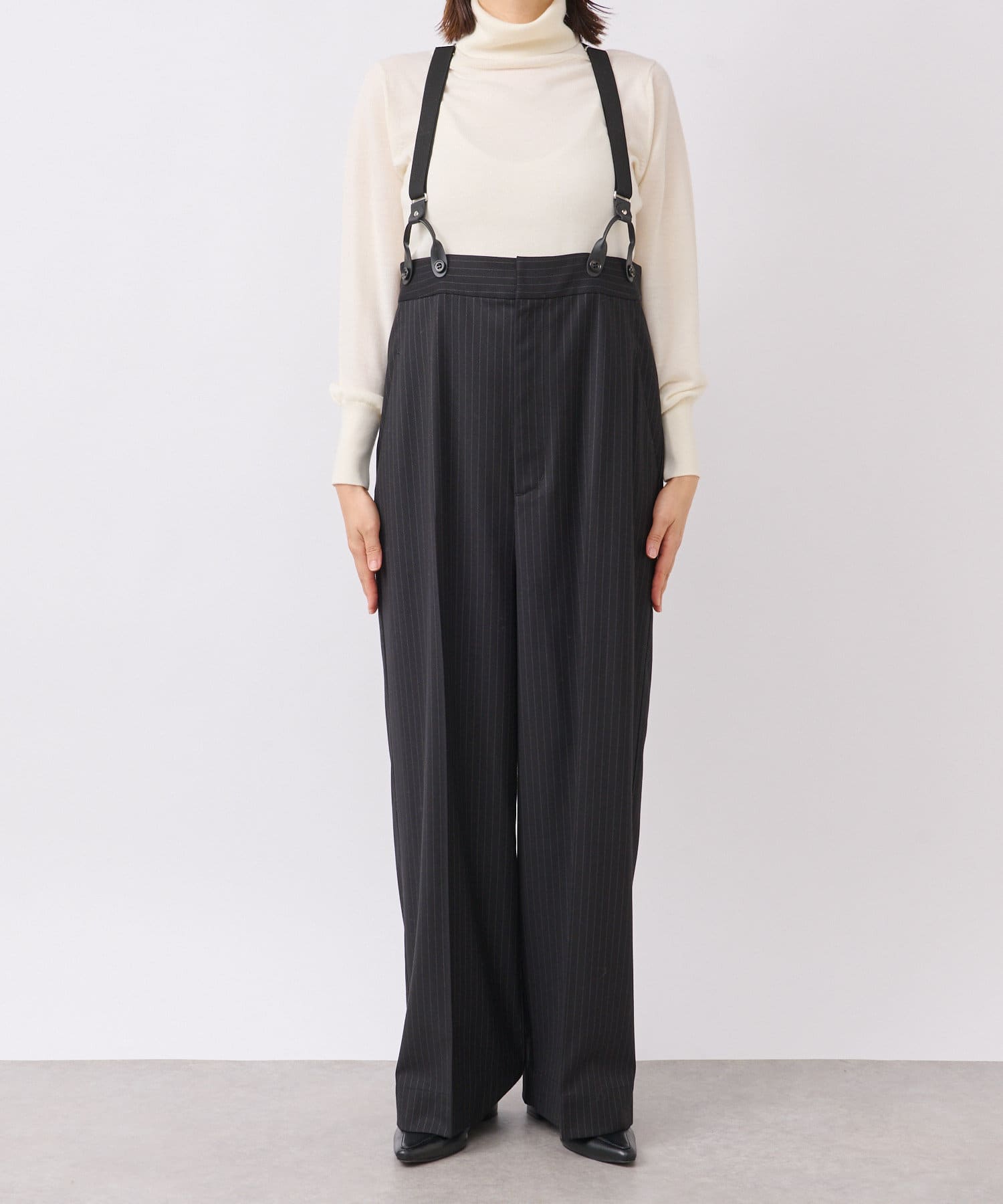 付属のサスペンダーで吊った状態で履いたり、ウエスト部分のドロストをきゅっとしめてジャストウエストで着たりと着こなし次第で様々な雰囲気を楽しめます。