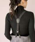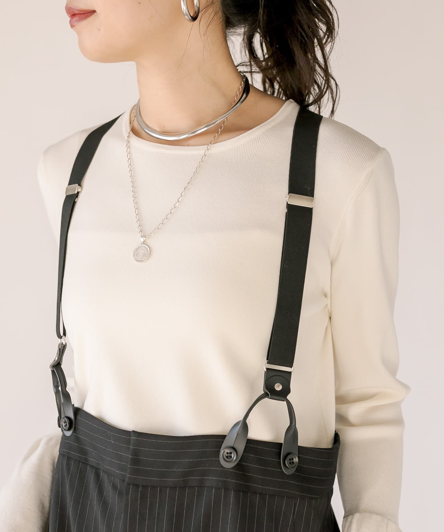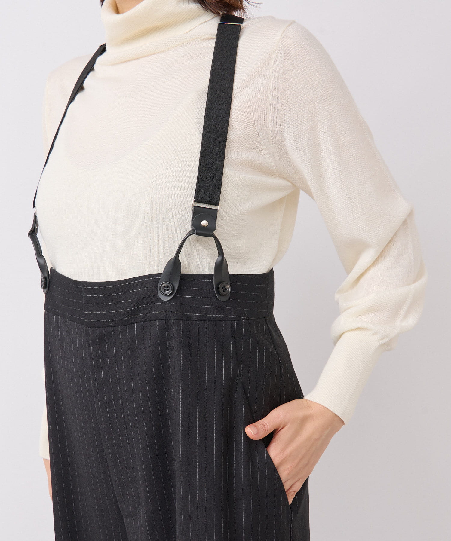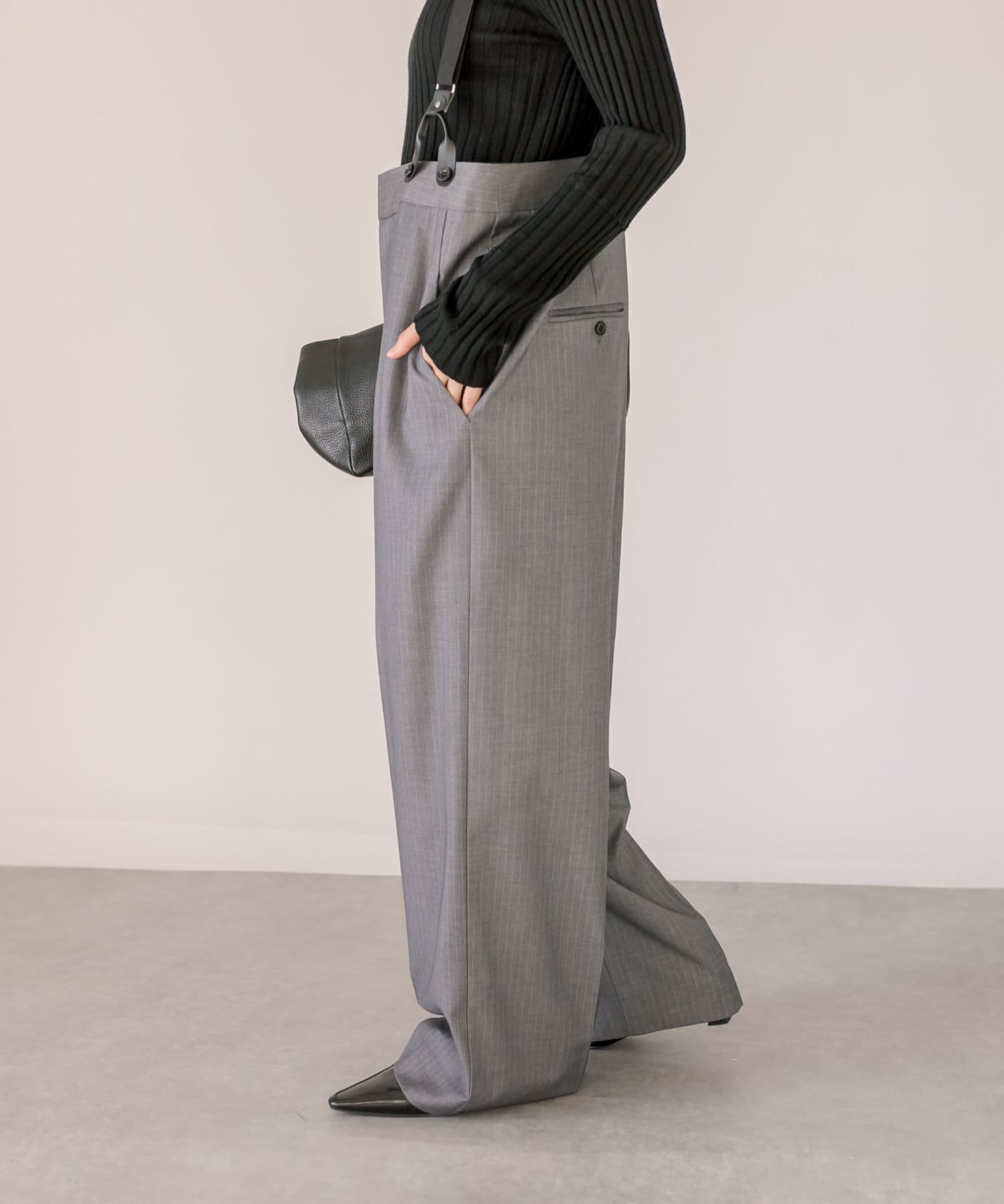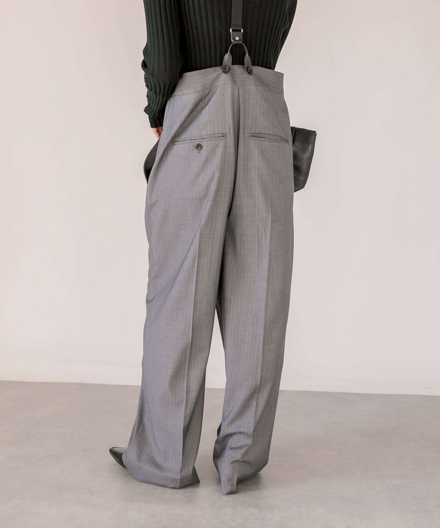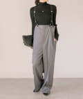 付属のサスペンダーで吊った状態で履いたり、ウエスト部分のドロストをきゅっとしめてジャストウエストで着たりと着こなし次第で様々な雰囲気を楽しめます。