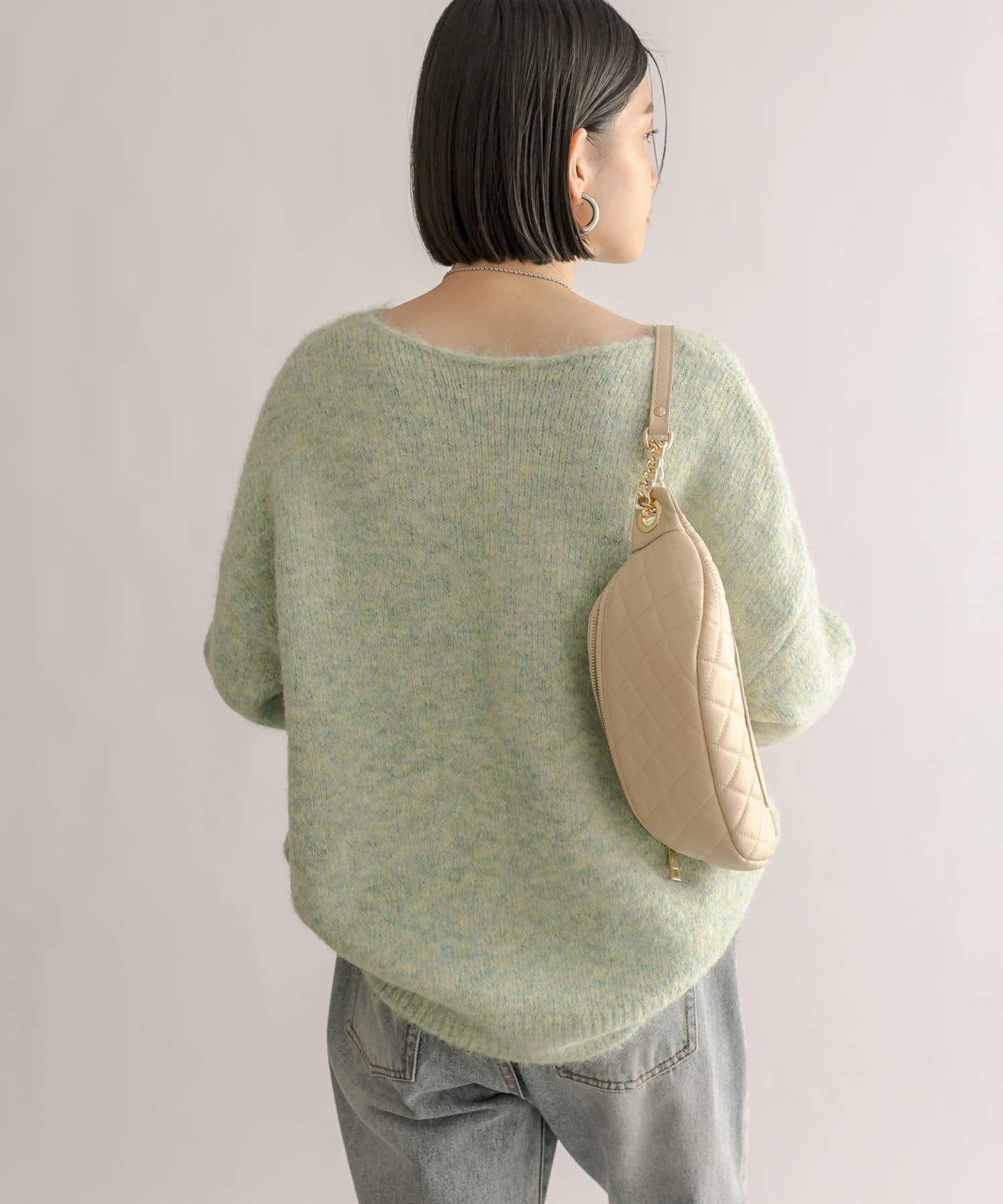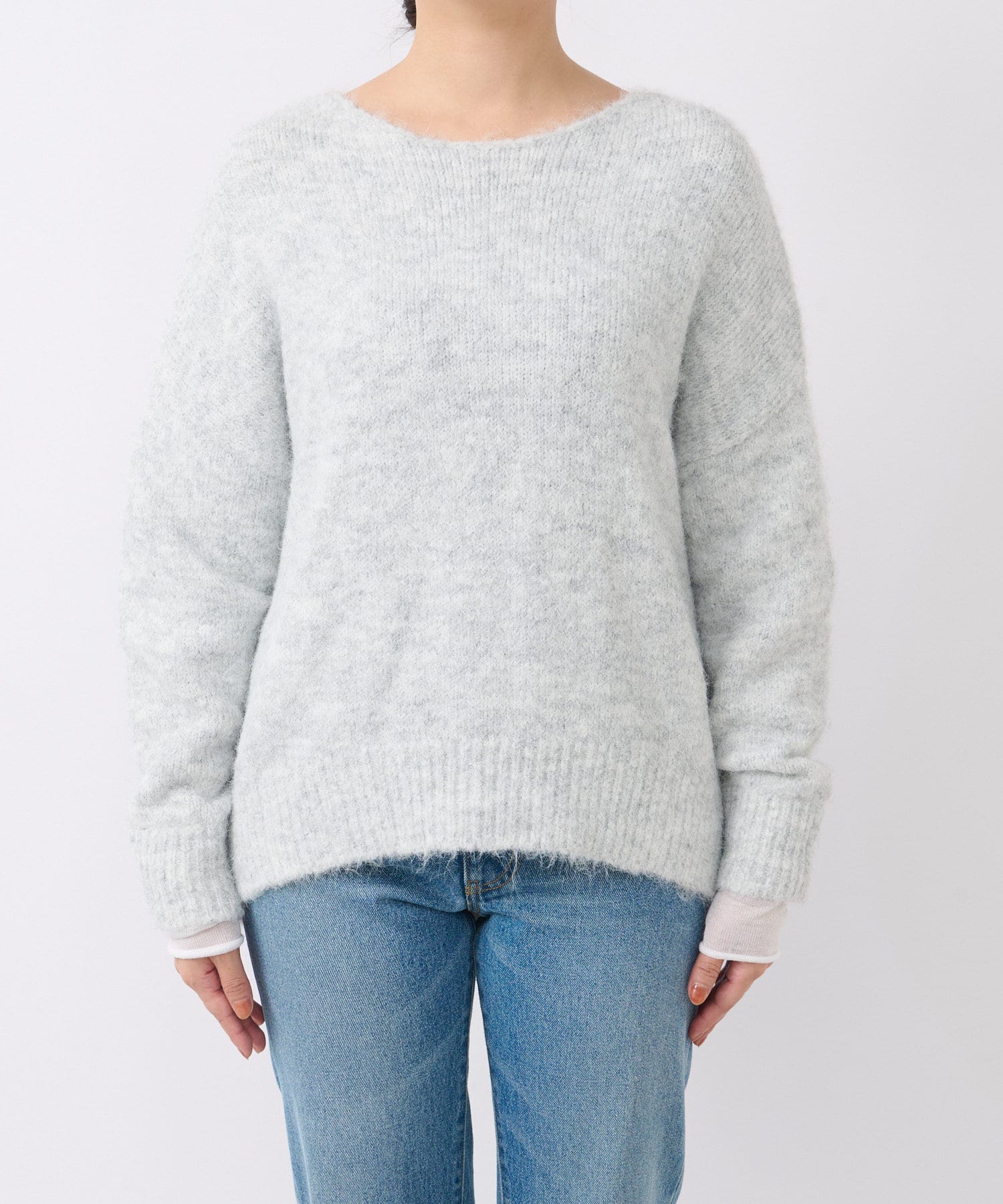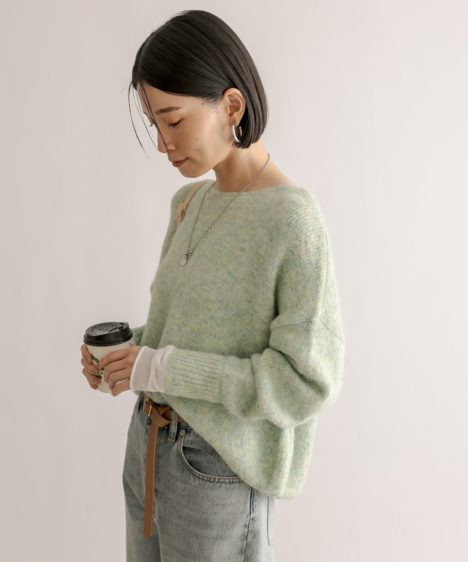 毛糸自体にたくさんの色味がミックスされているので、単色より深みが出ます。デニムに合わせて、腰回りが少し隠れるくらい、長さも絶妙です。