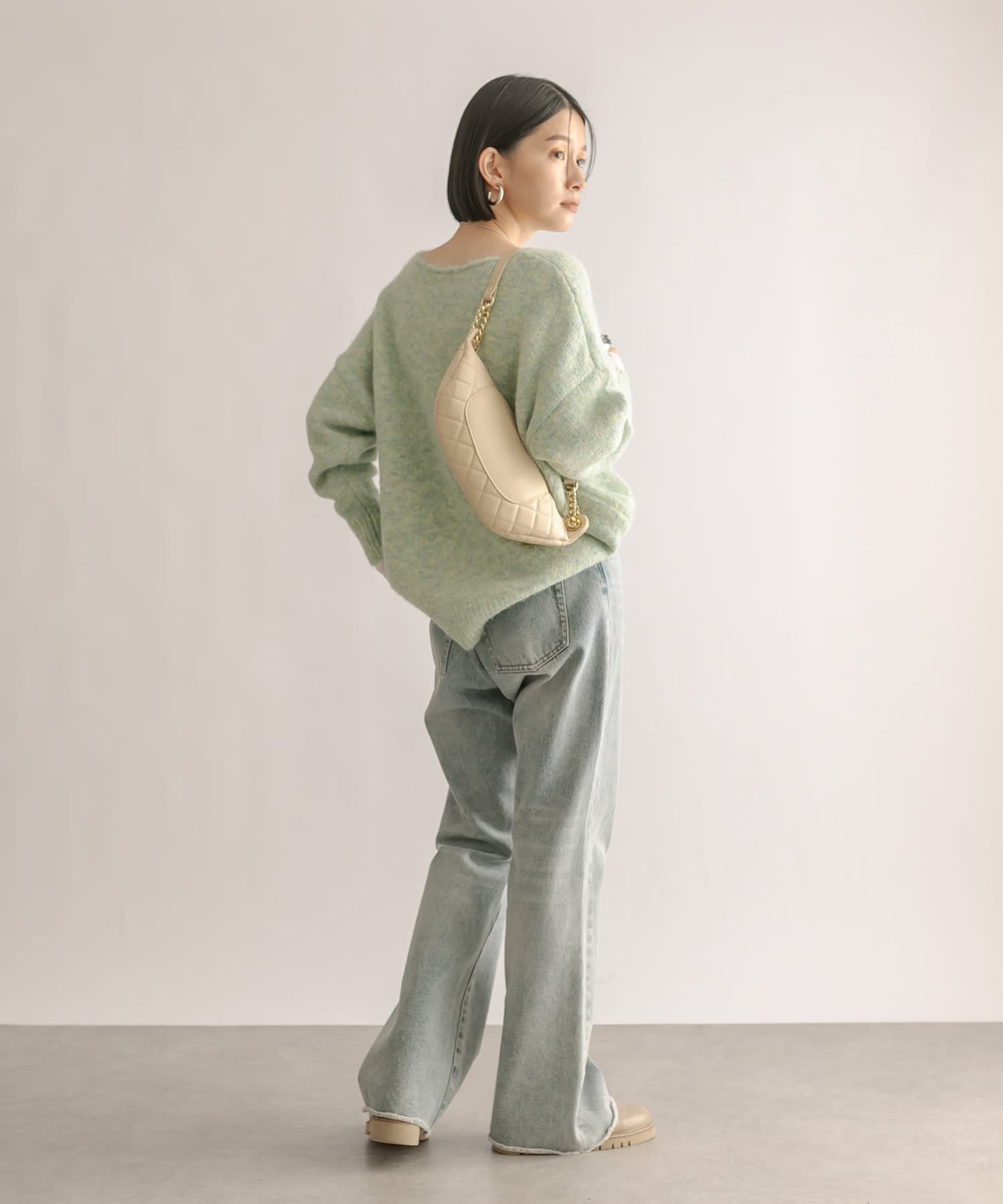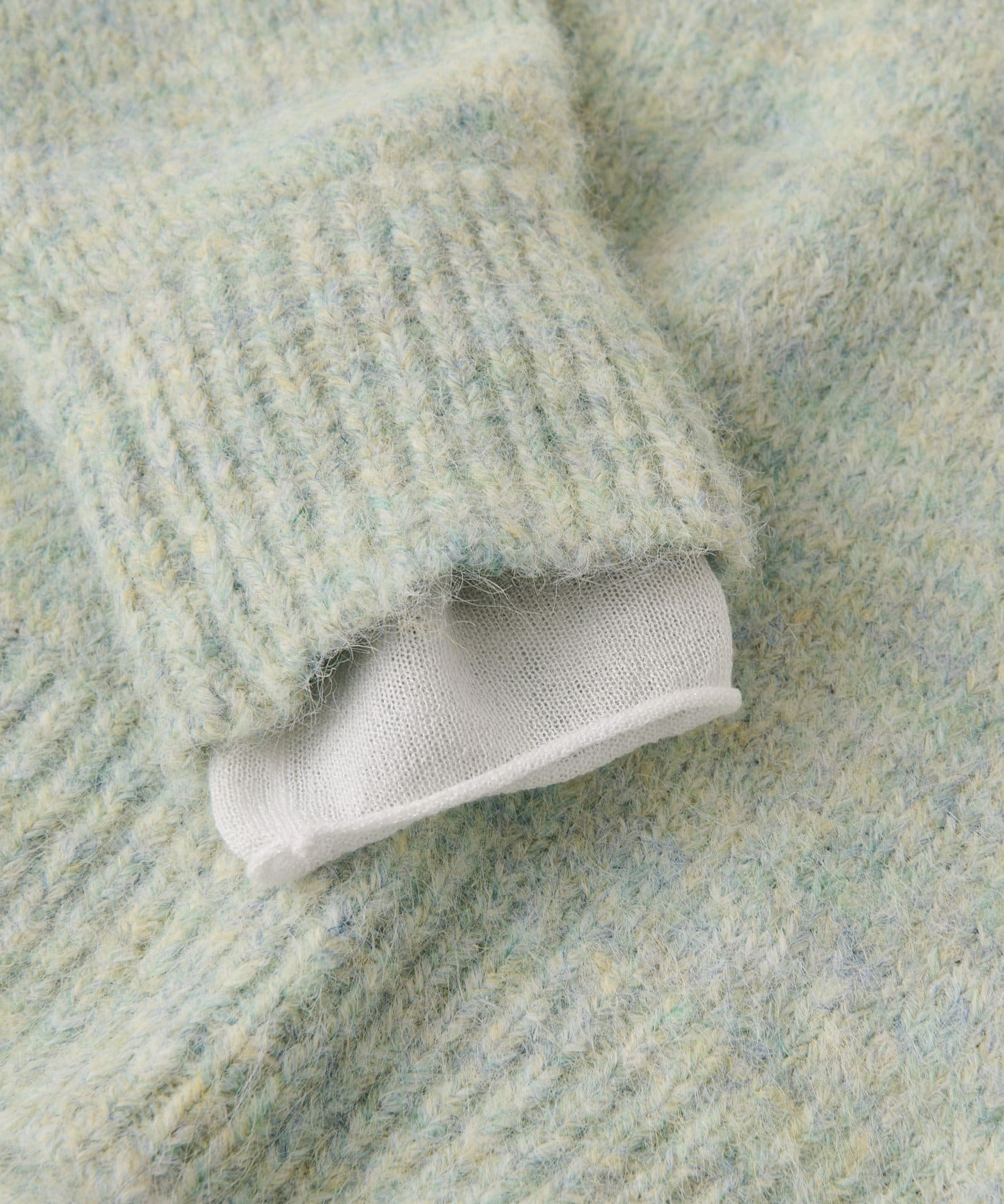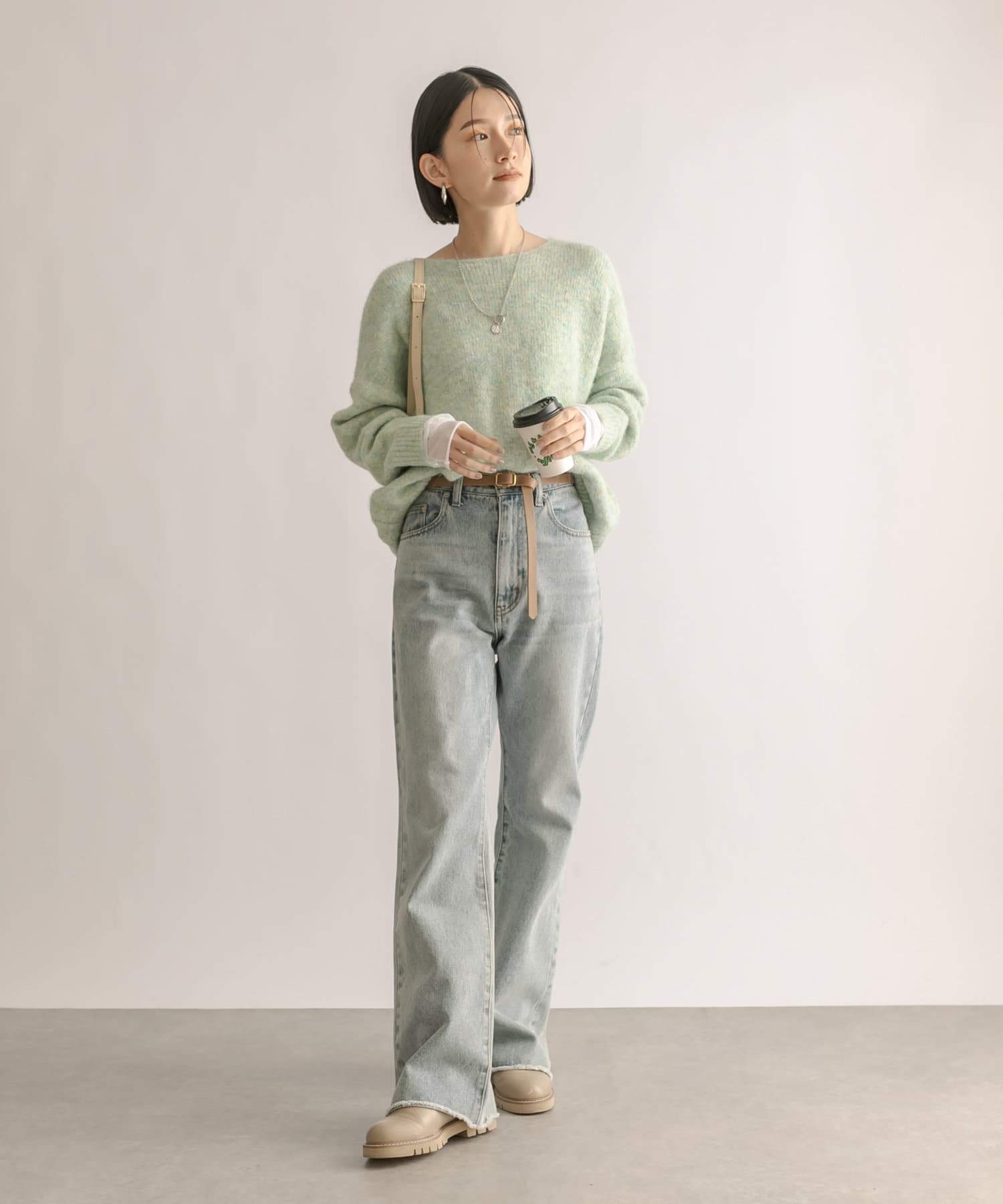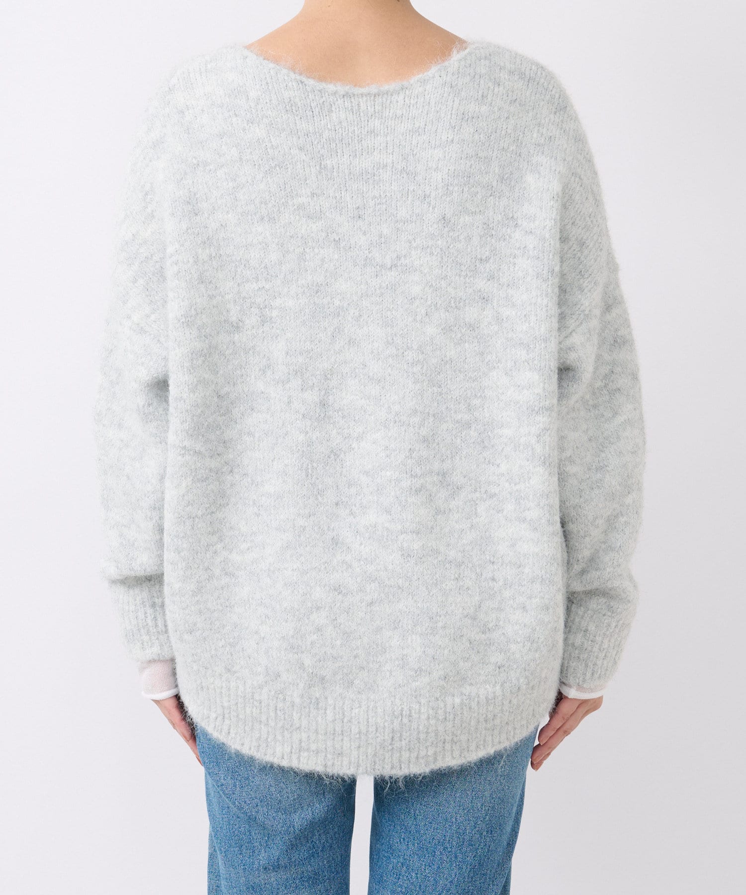 毛糸自体にたくさんの色味がミックスされているので、単色より深みが出ます。デニムに合わせて、腰回りが少し隠れるくらい、長さも絶妙です。