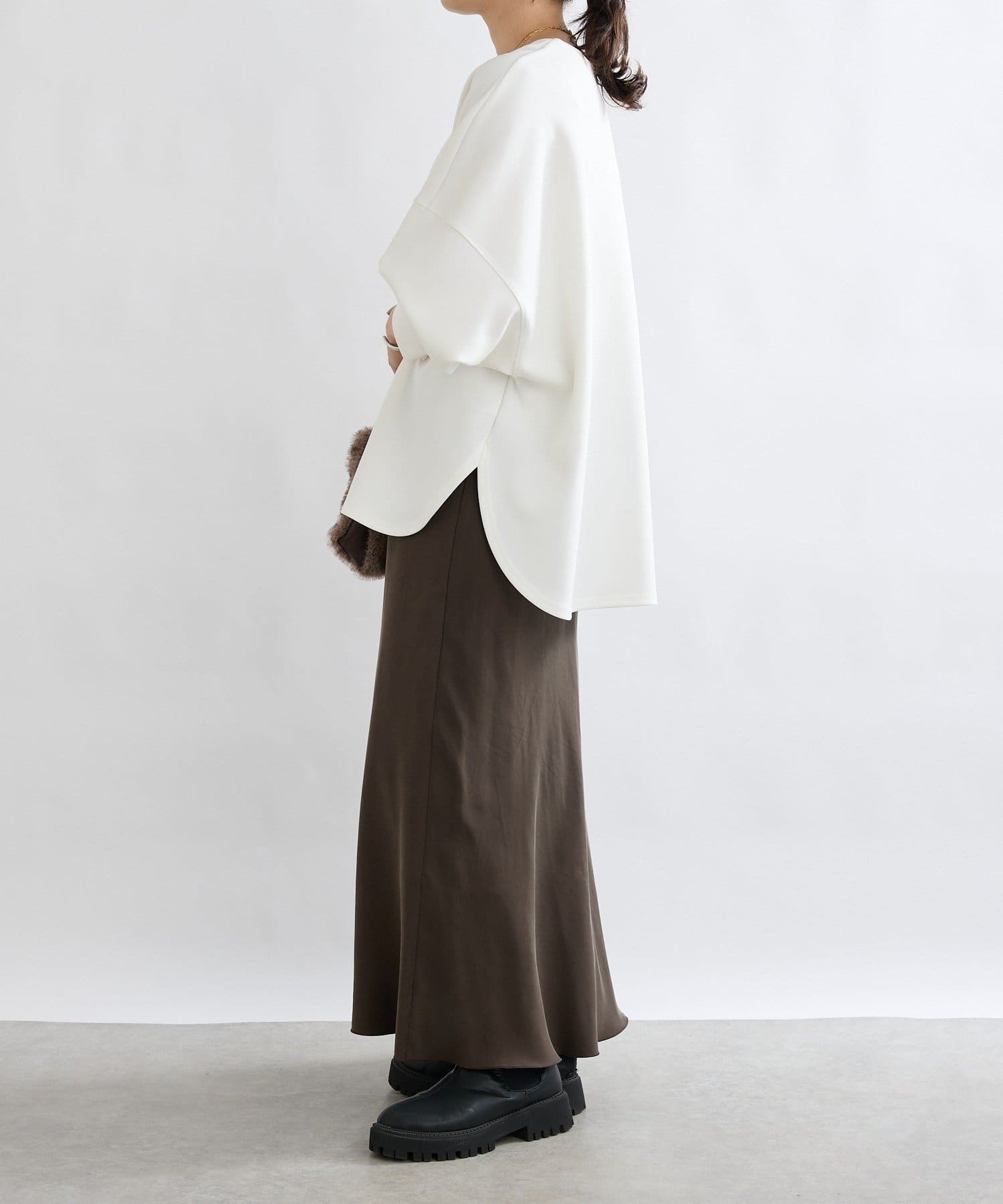 お尻がすっぽりと隠れる着丈でパンツ、スカート共に相性抜群。