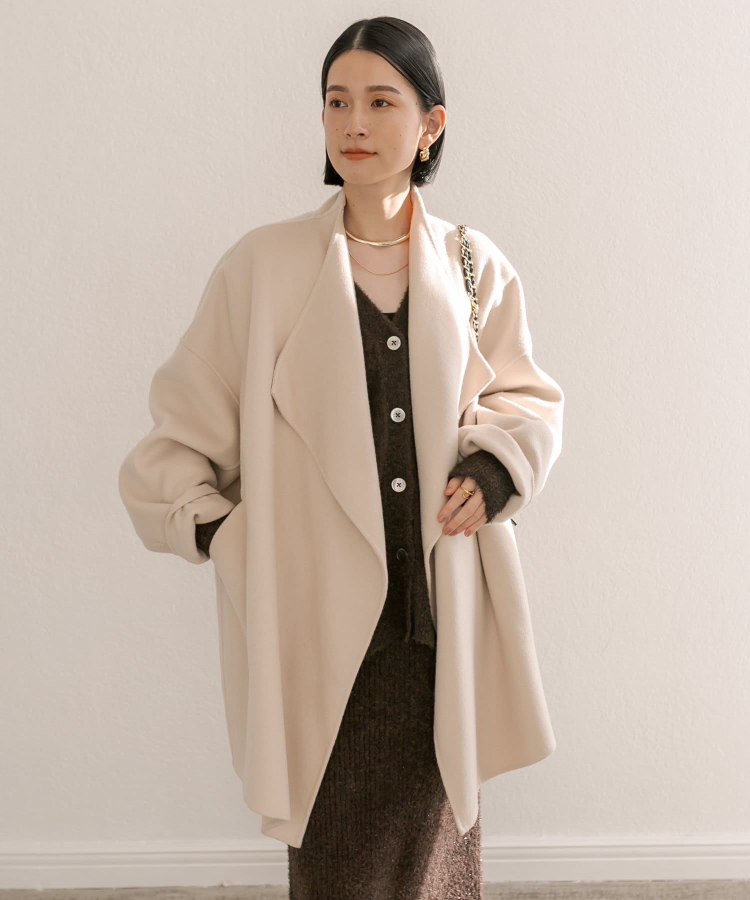 上品で女性らしい印象のショールカラーで、カジュアルなコーディネートと合わせてもラフになりすぎません。