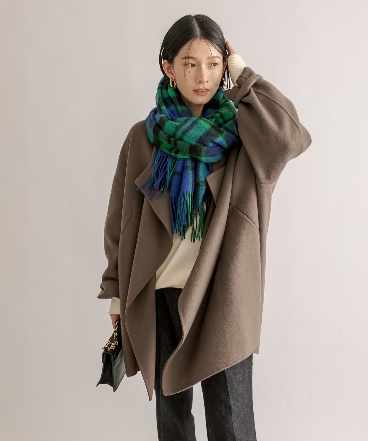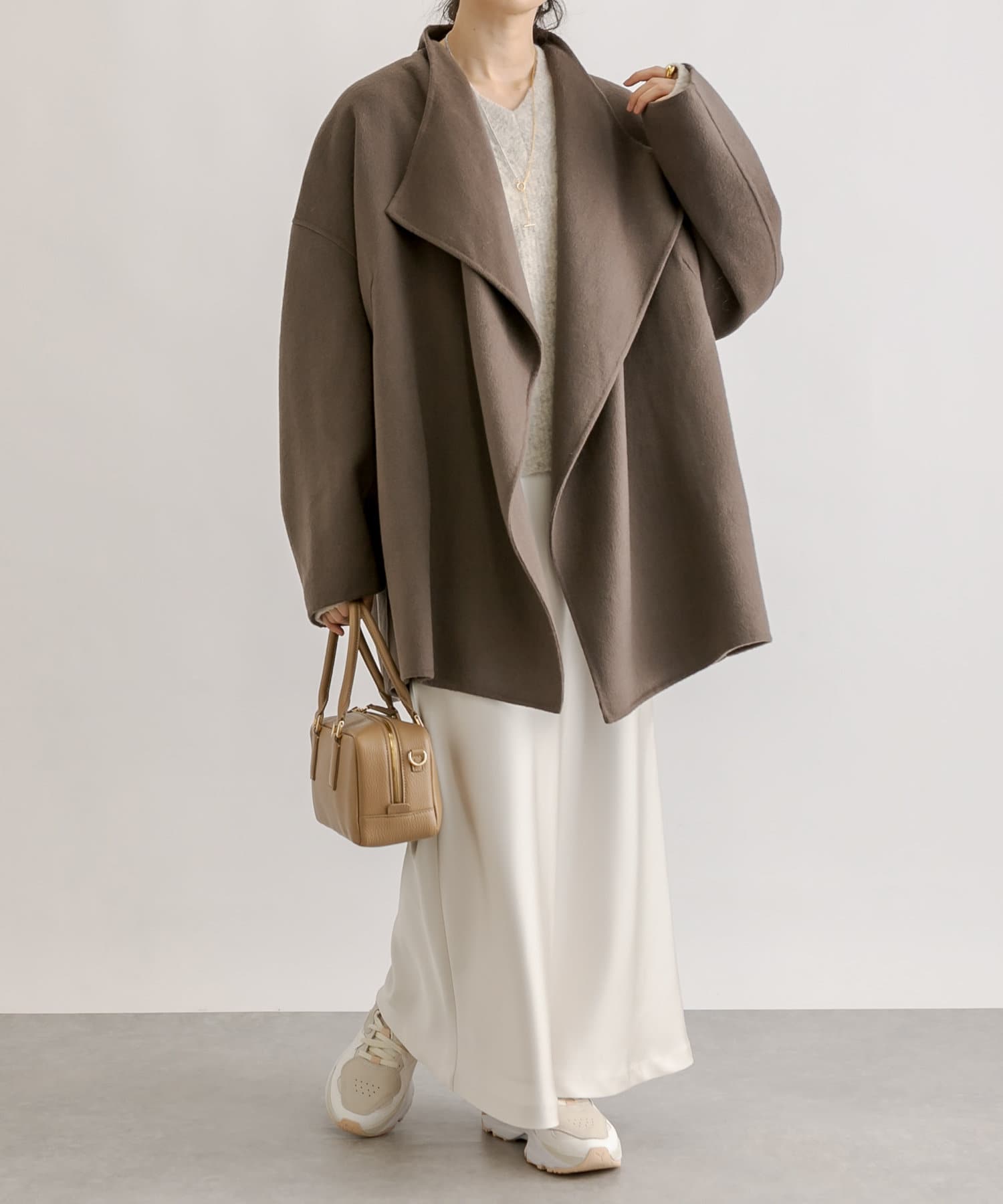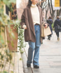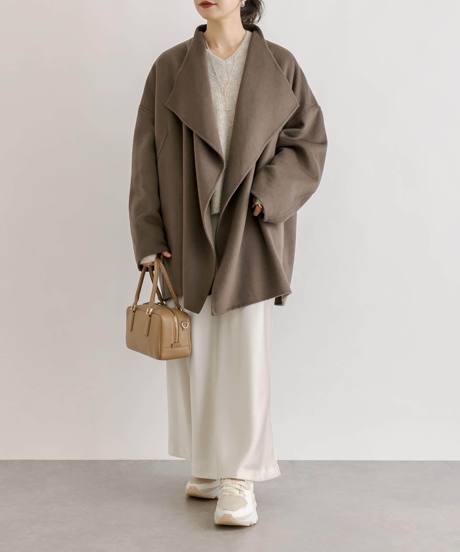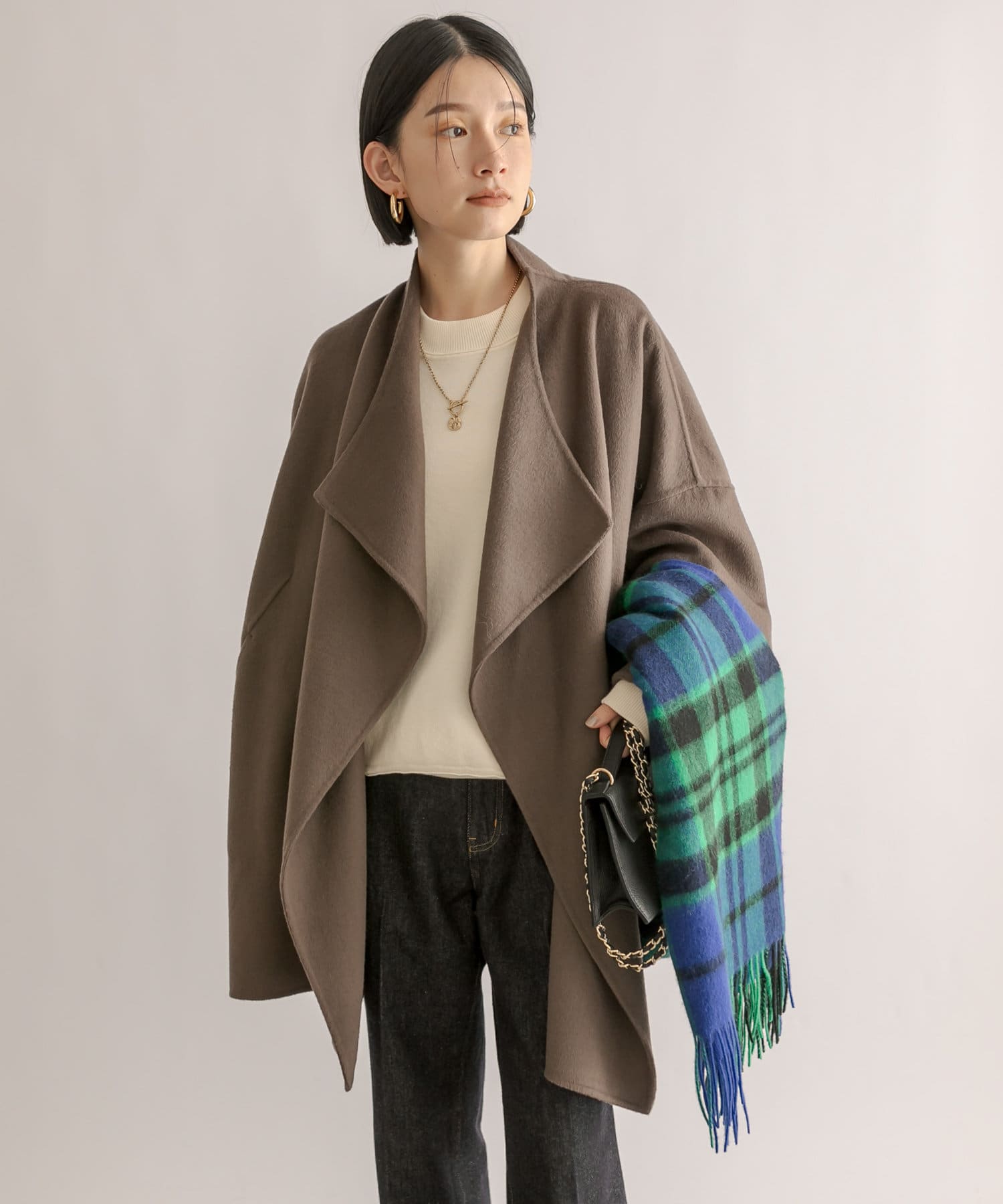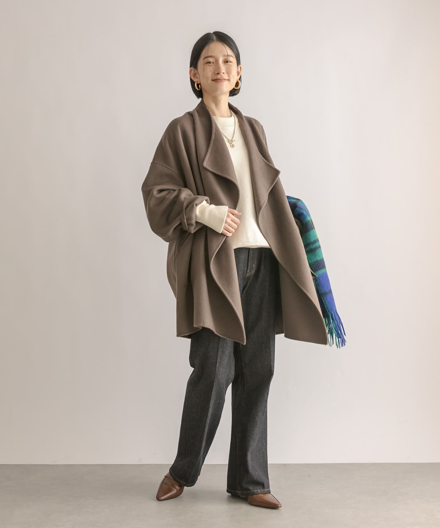 上品で女性らしい印象のショールカラーで、カジュアルなコーディネートと合わせてもラフになりすぎません。