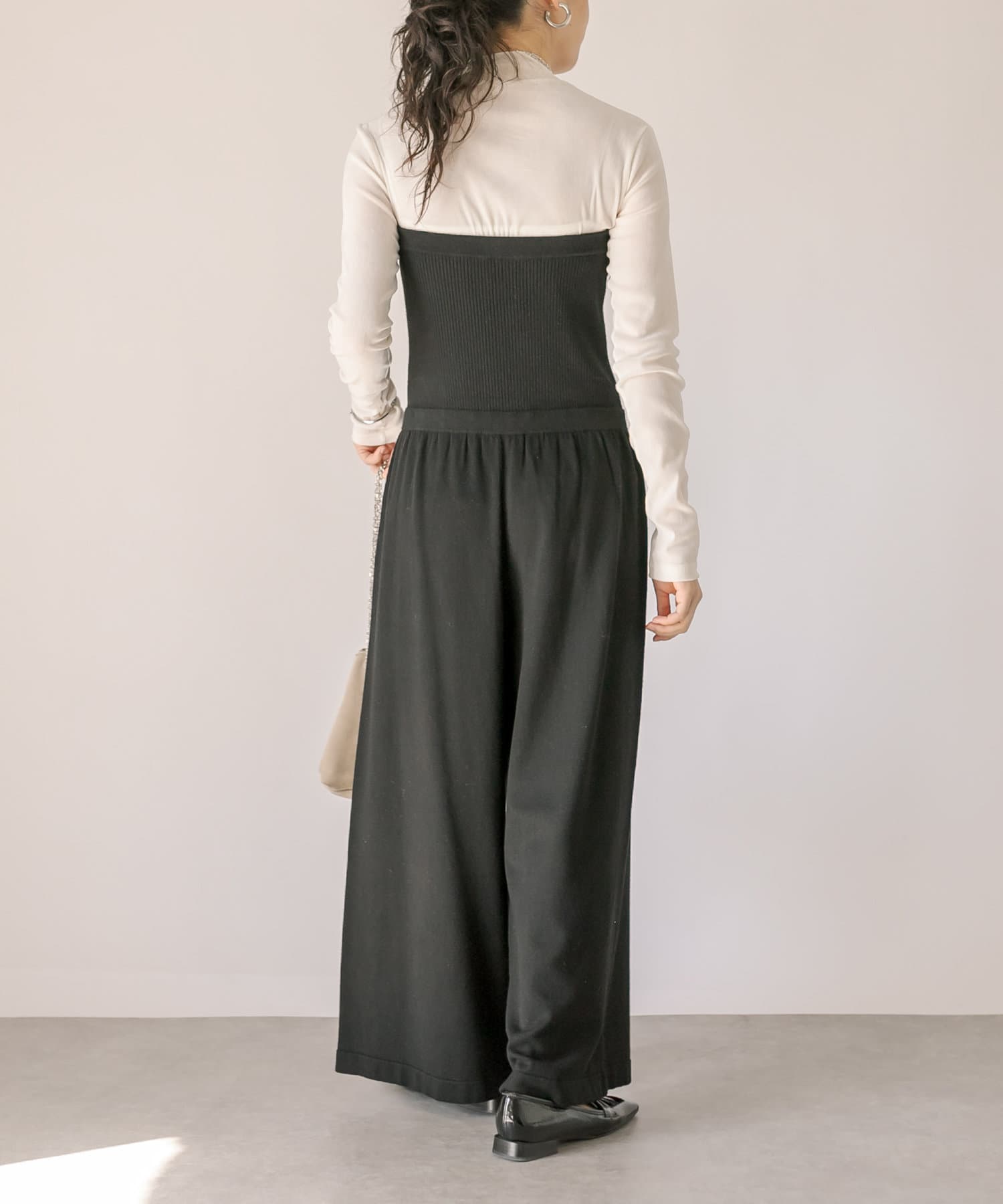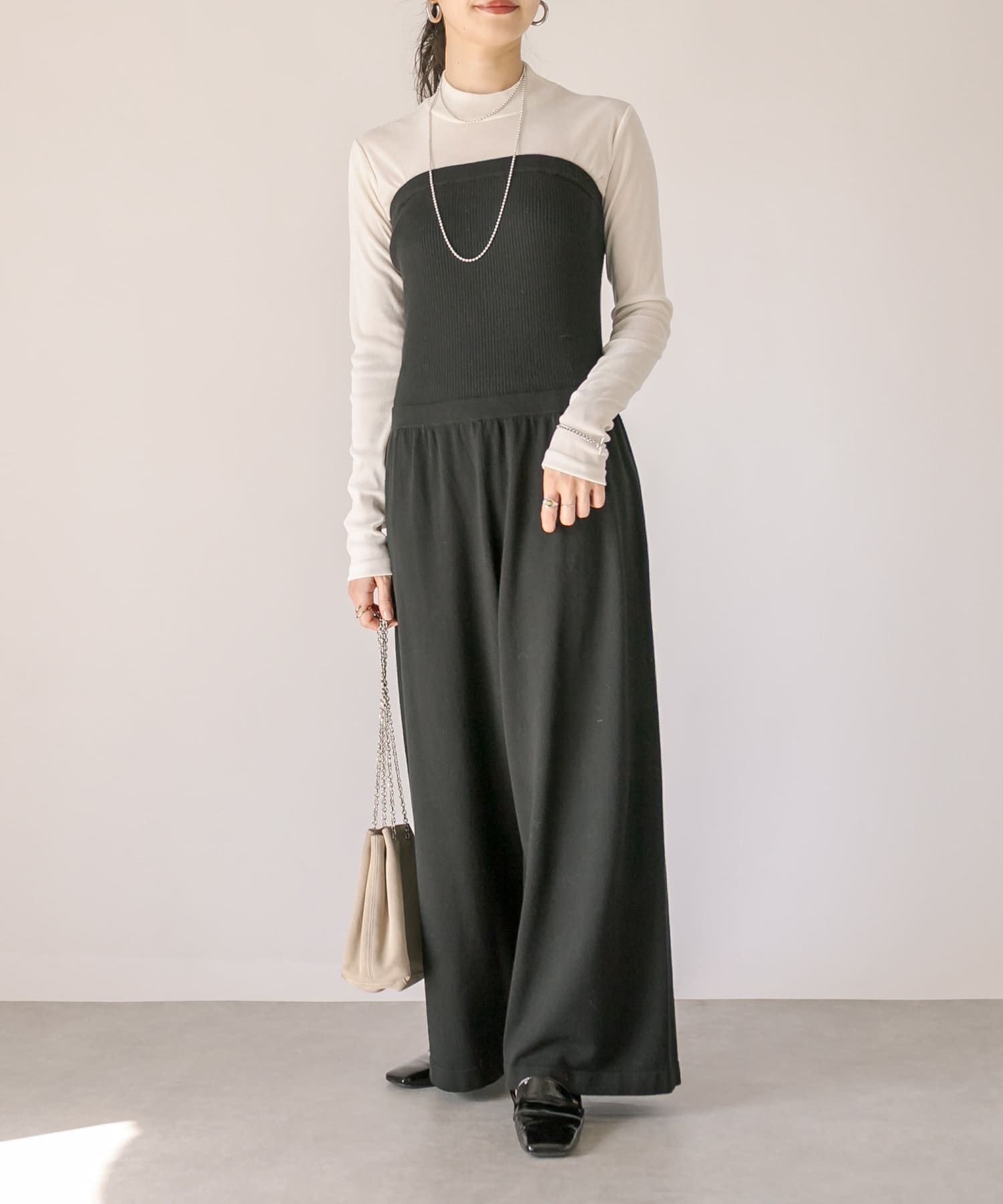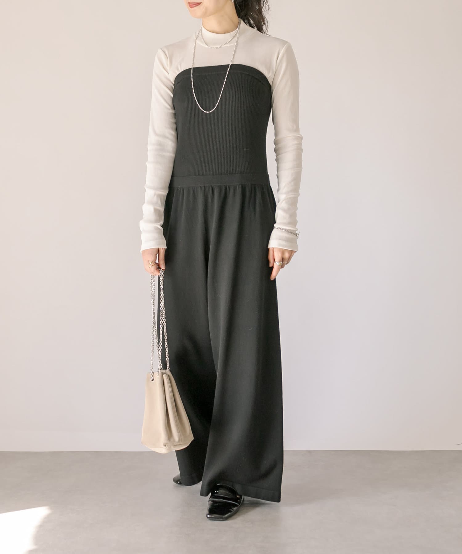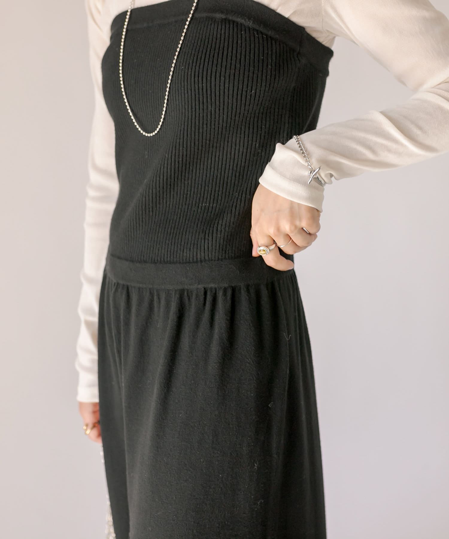 ストラップナシで着用できるベアタイプのニットサロペットが新登場。