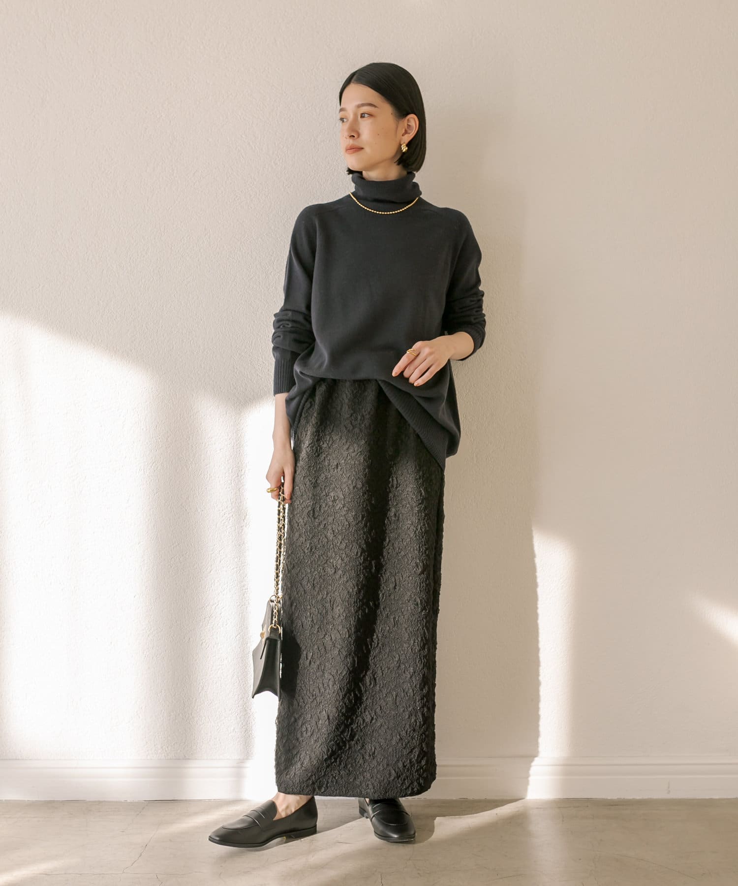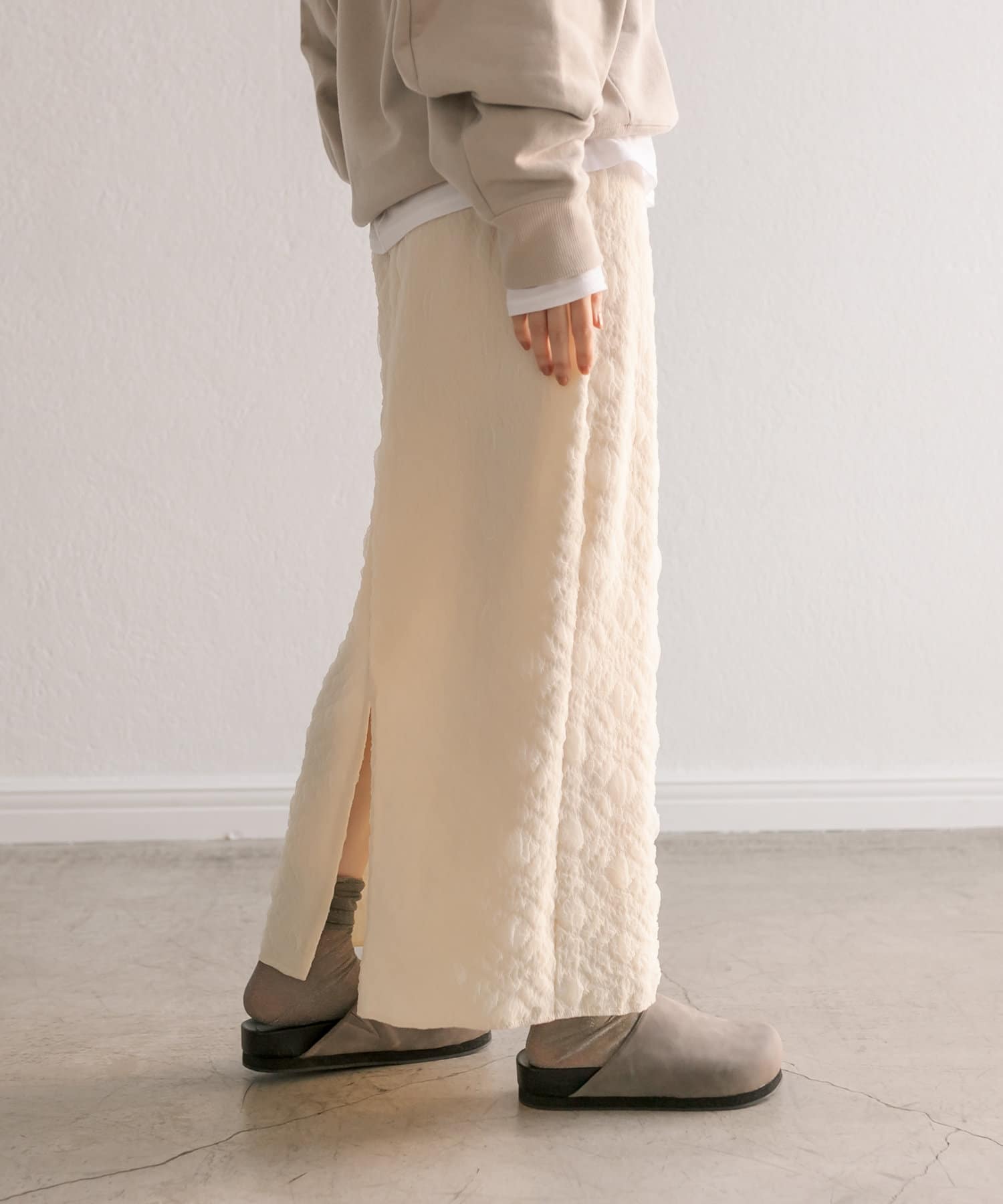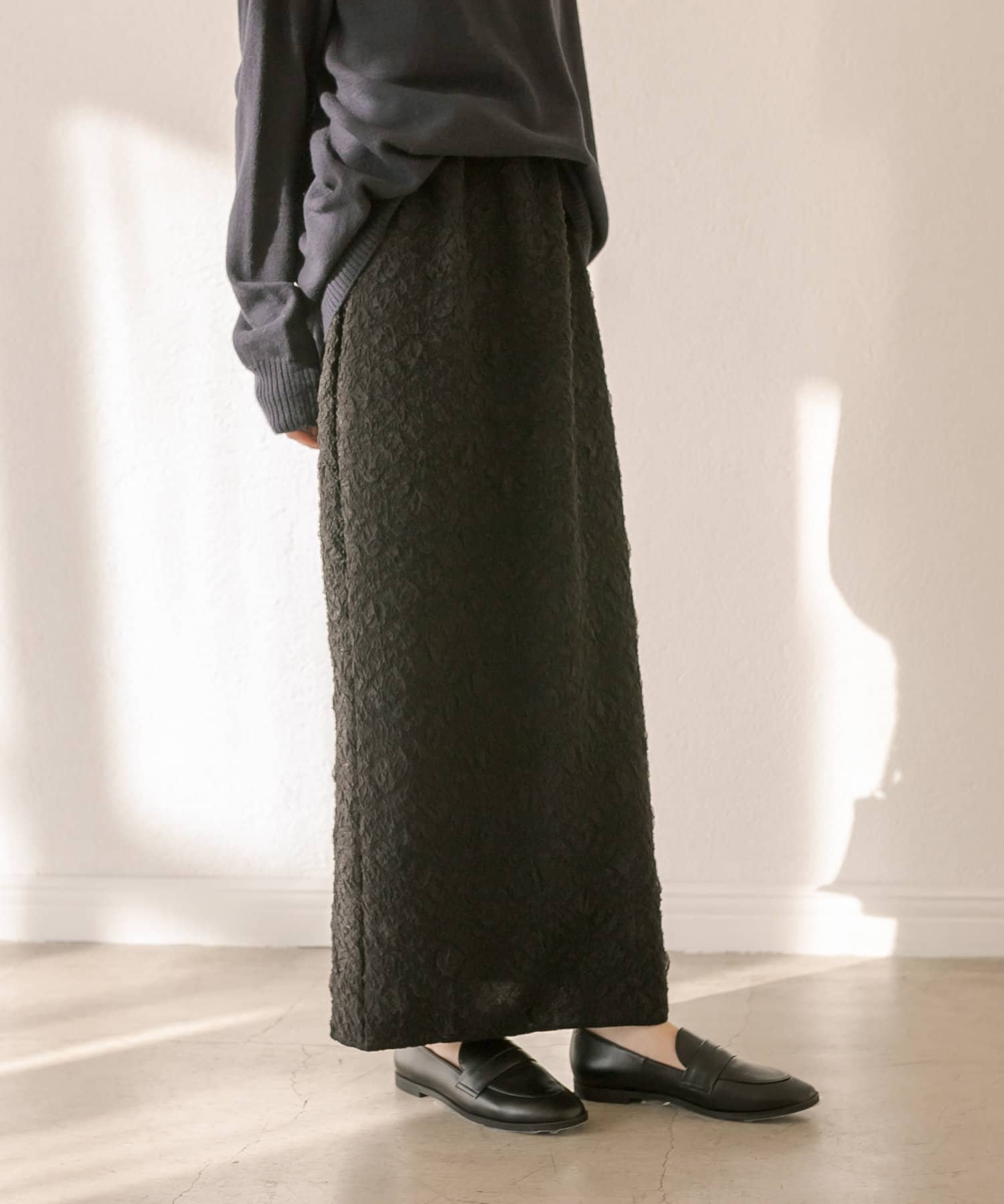 ジャガード特有の立体感が表情豊かで、シンプルなコーデでも着映えするスカートです。