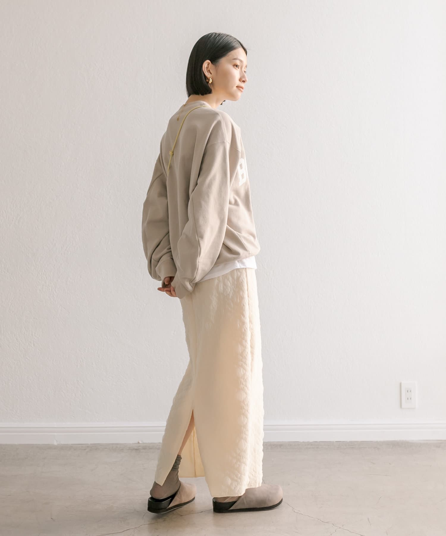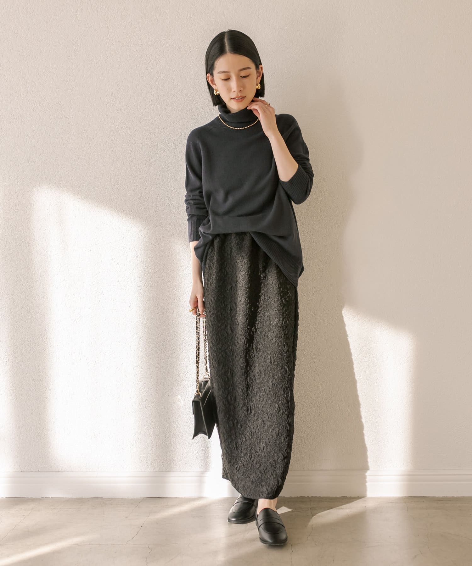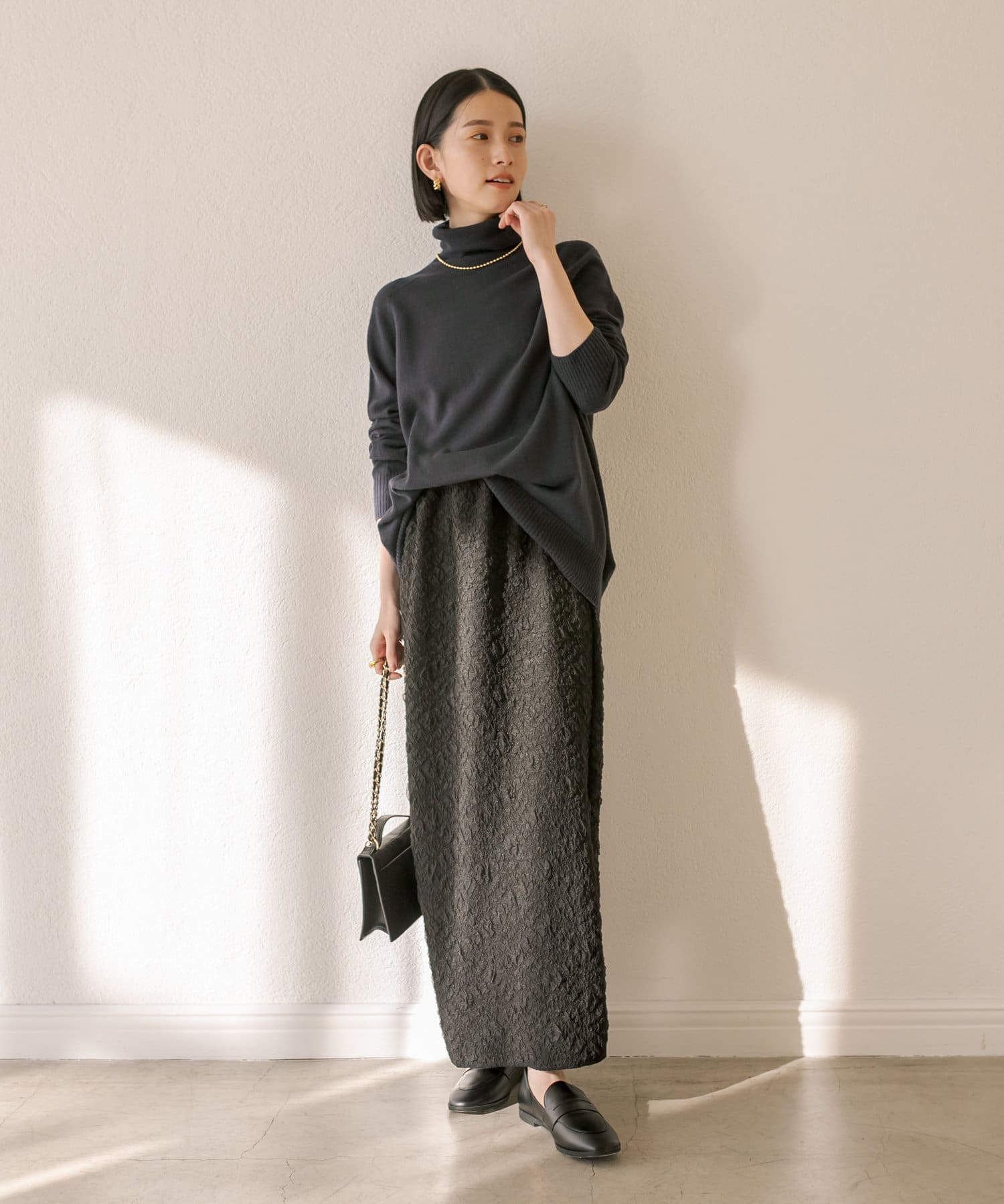 ジャガード特有の立体感が表情豊かで、シンプルなコーデでも着映えするスカートです。