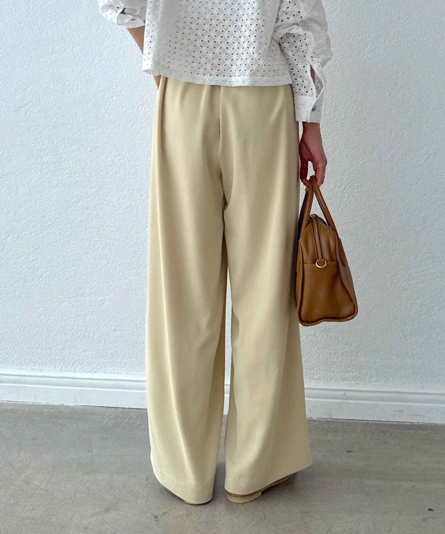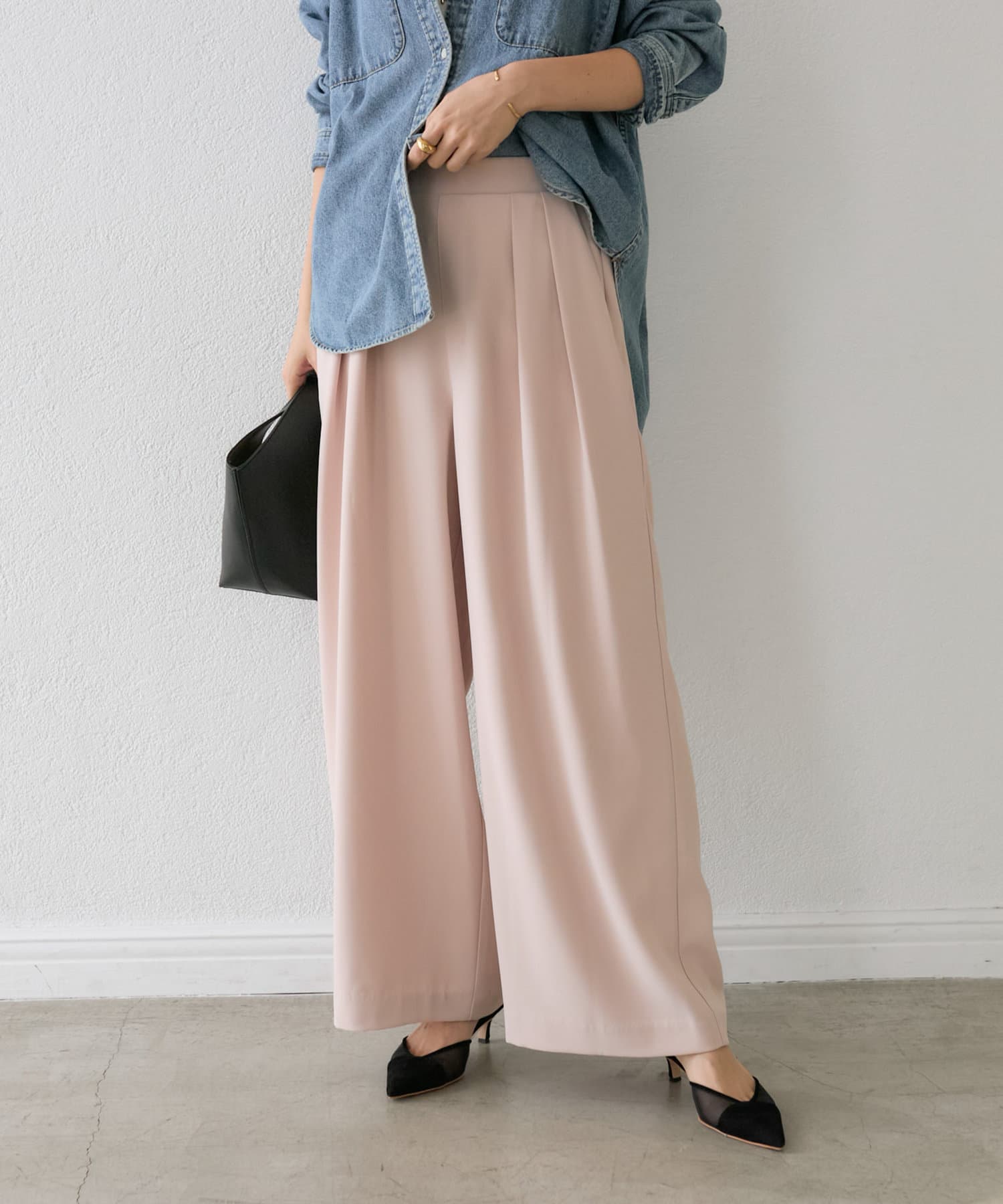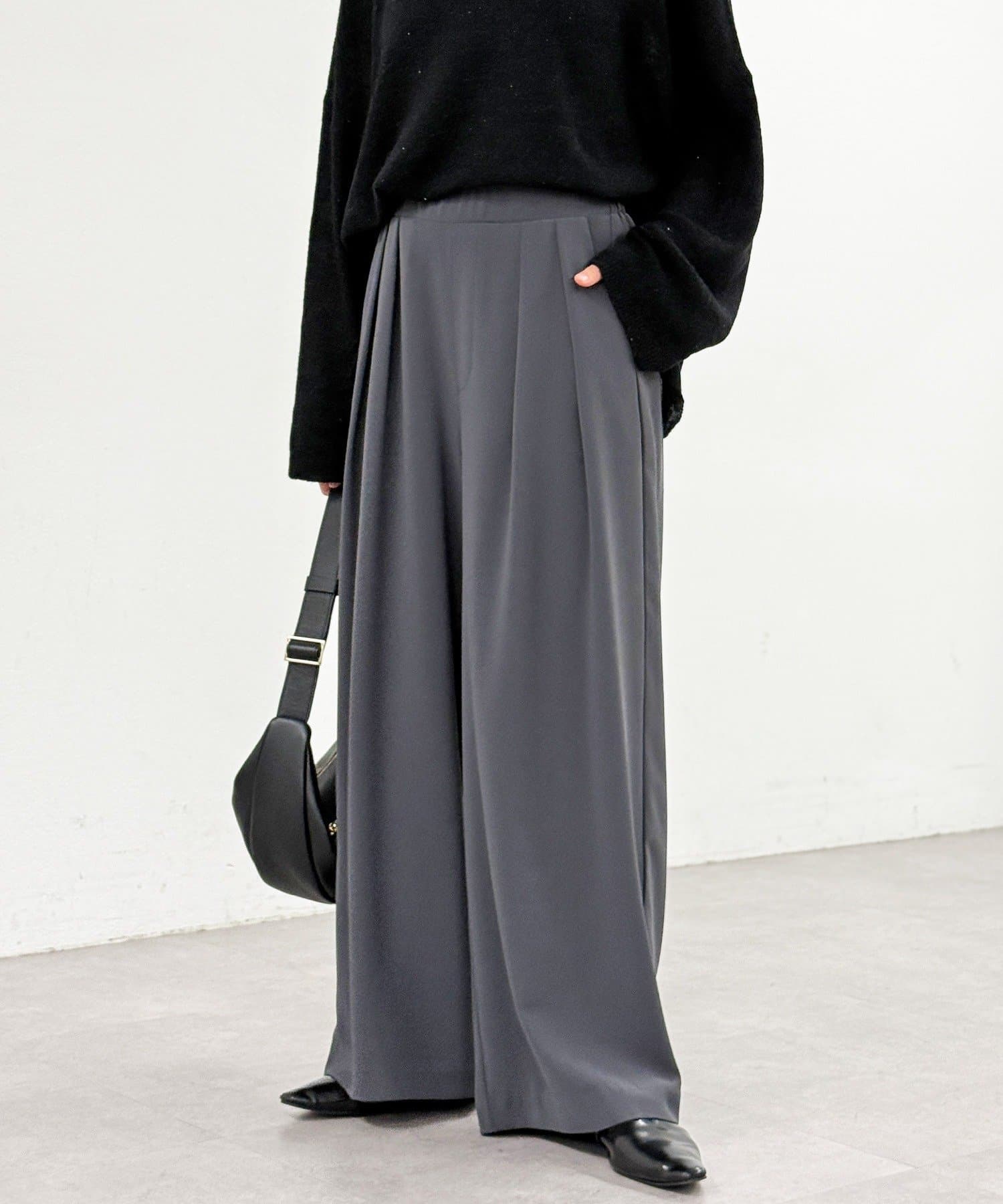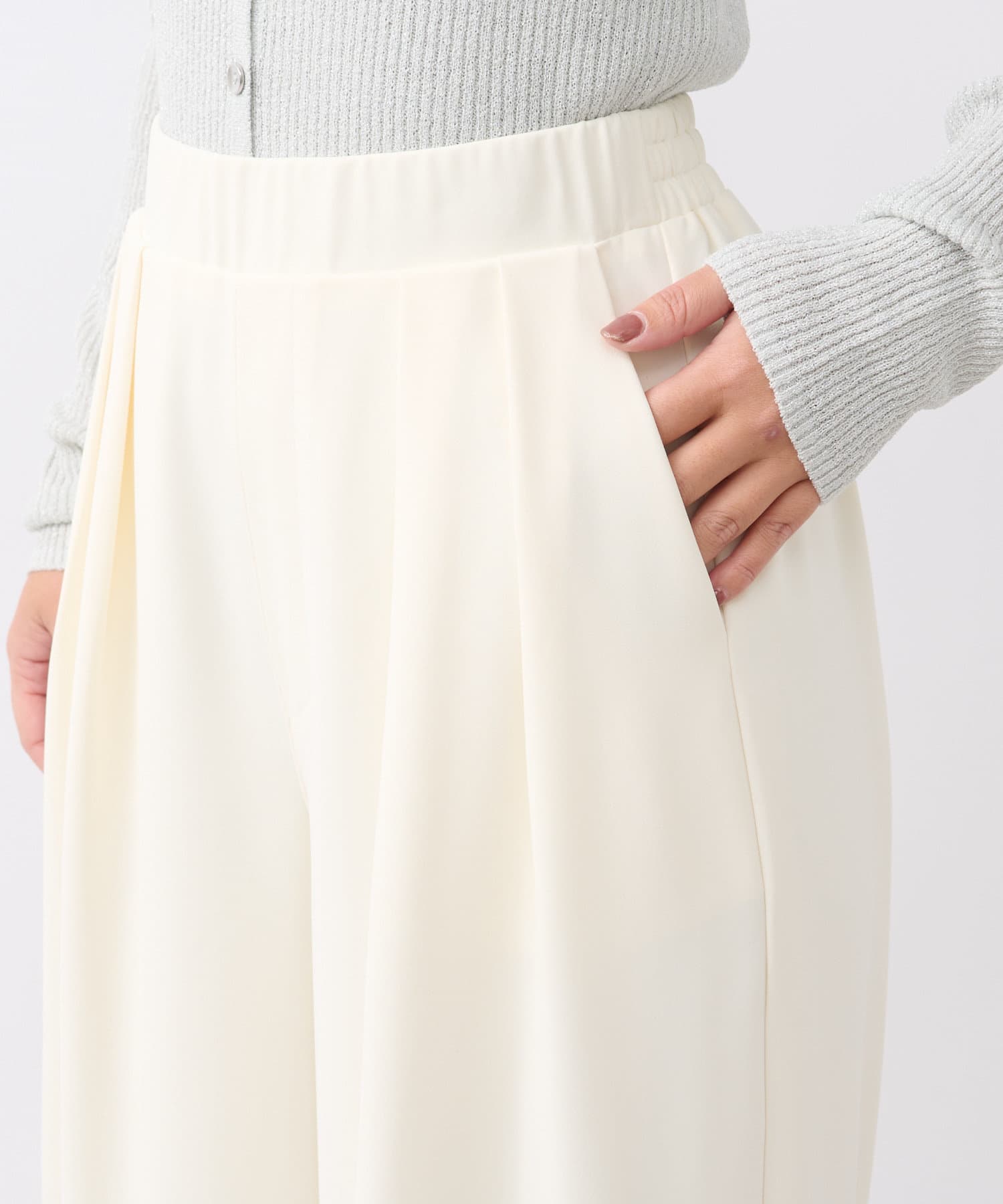 ファスナーがなく脱ぎ着もラクチン。タック入りで気になる腿周りをカバーする嬉しい効果も。