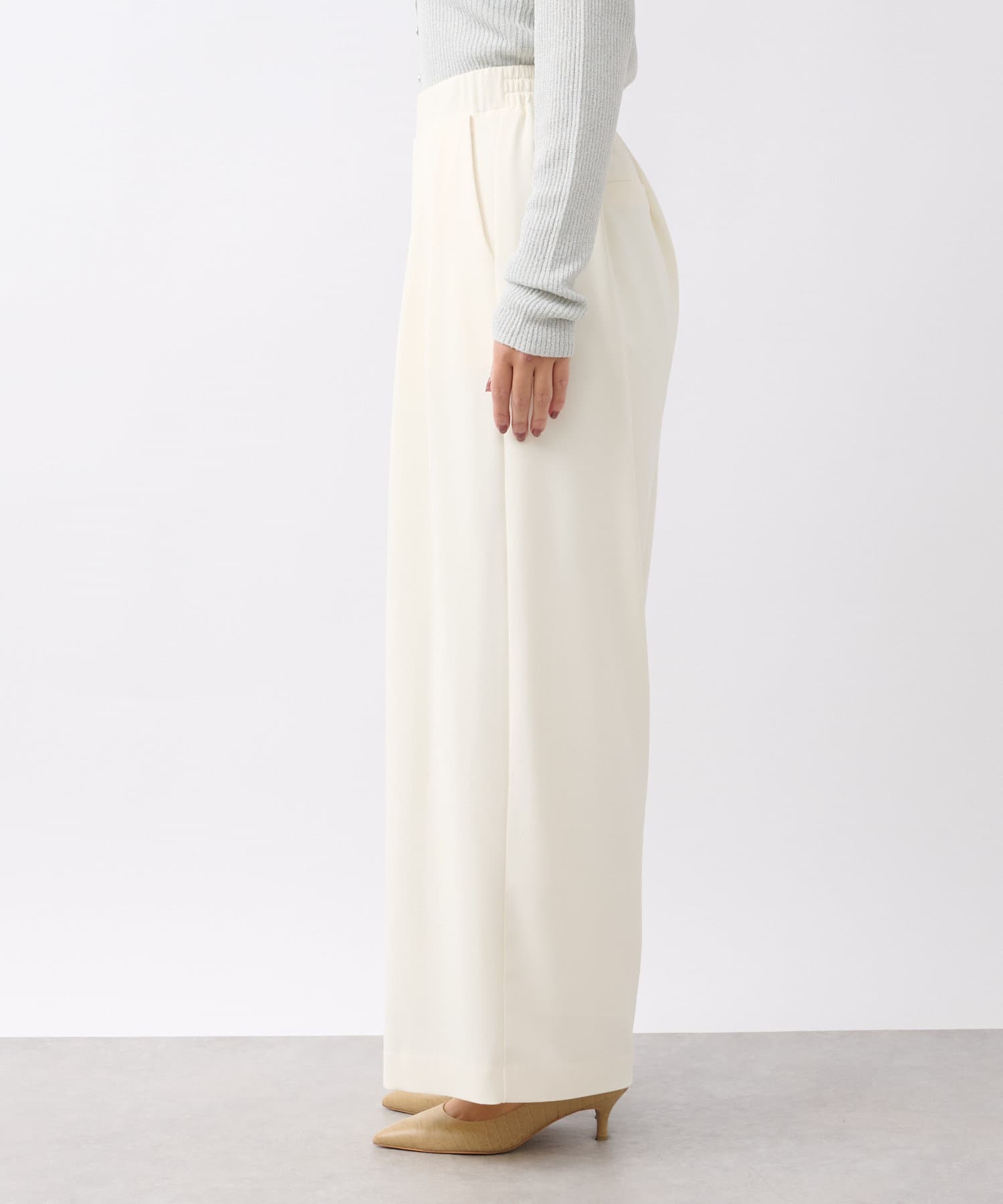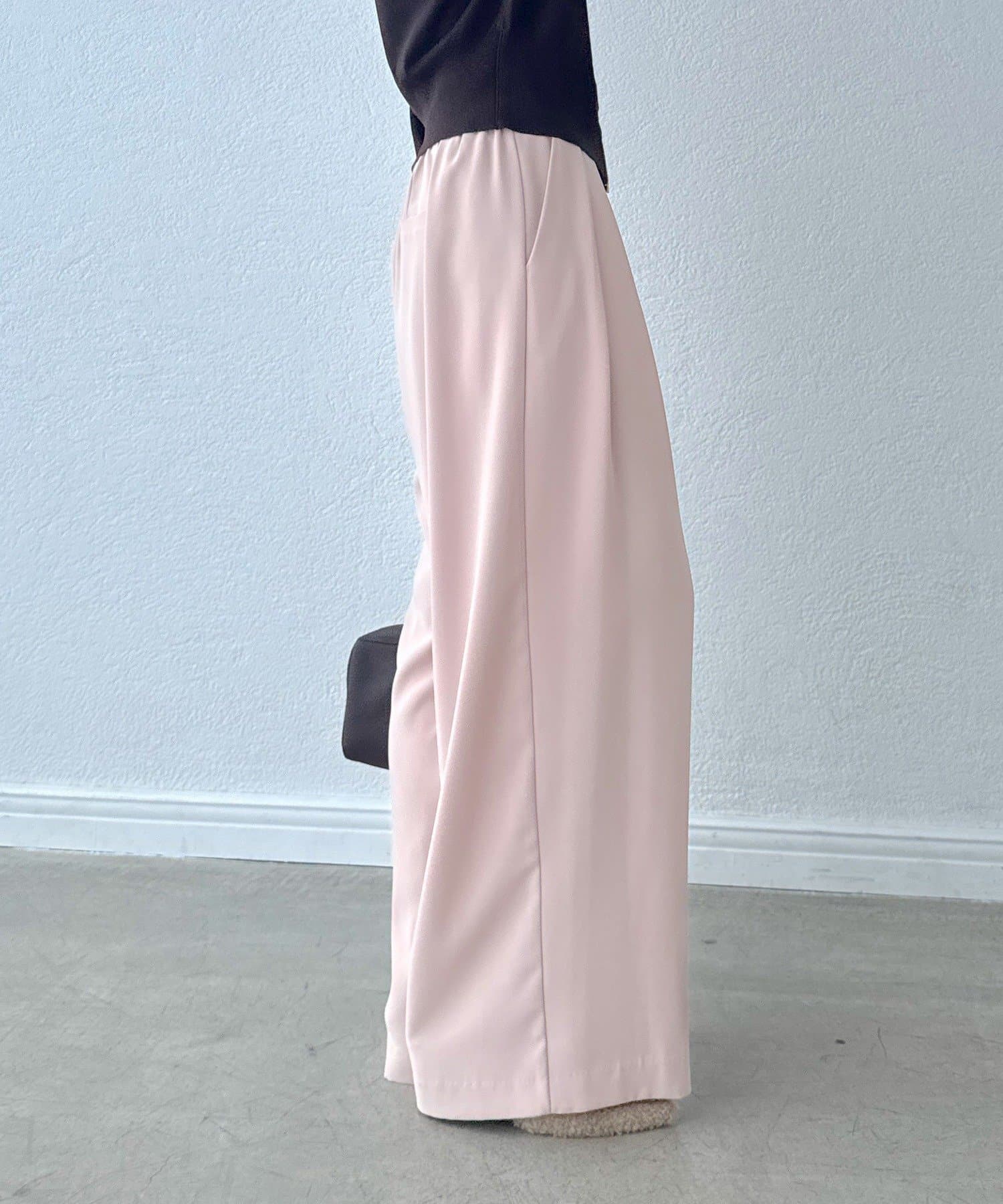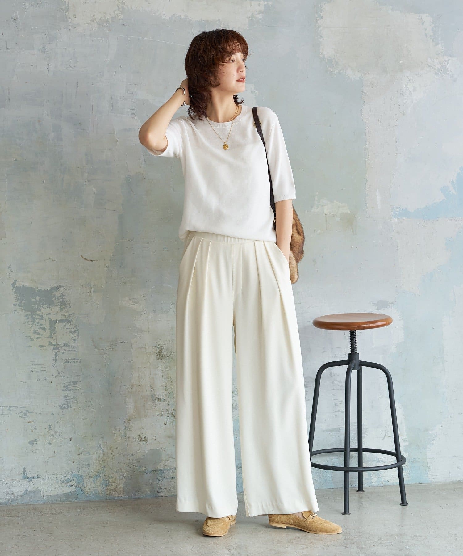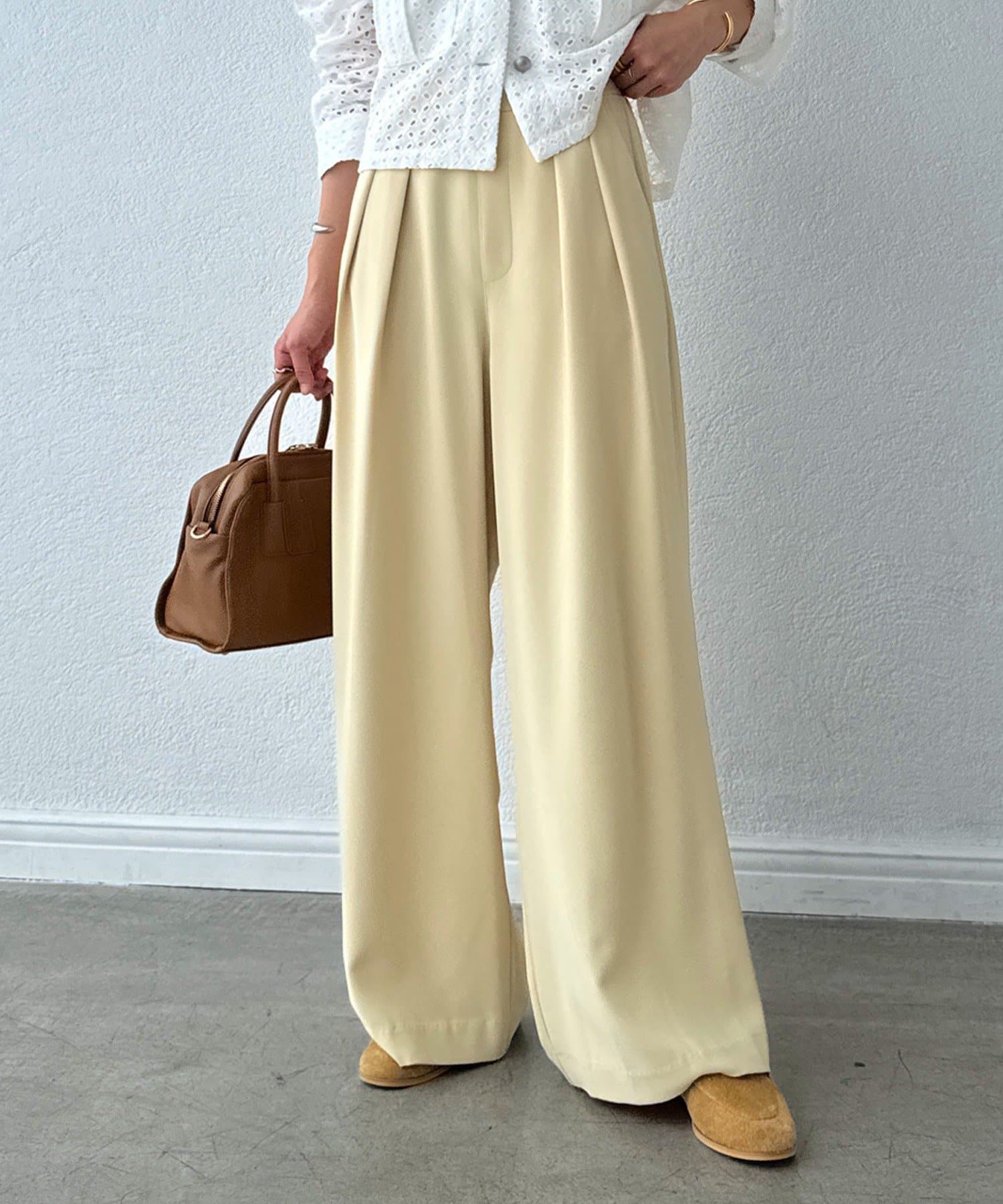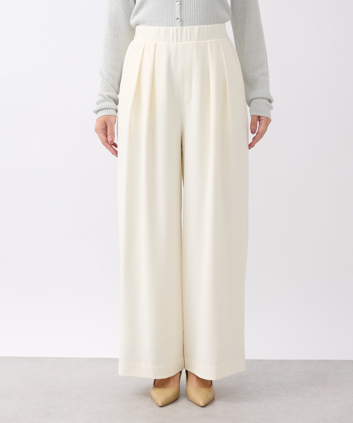 ファスナーがなく脱ぎ着もラクチン。タック入りで気になる腿周りをカバーする嬉しい効果も。