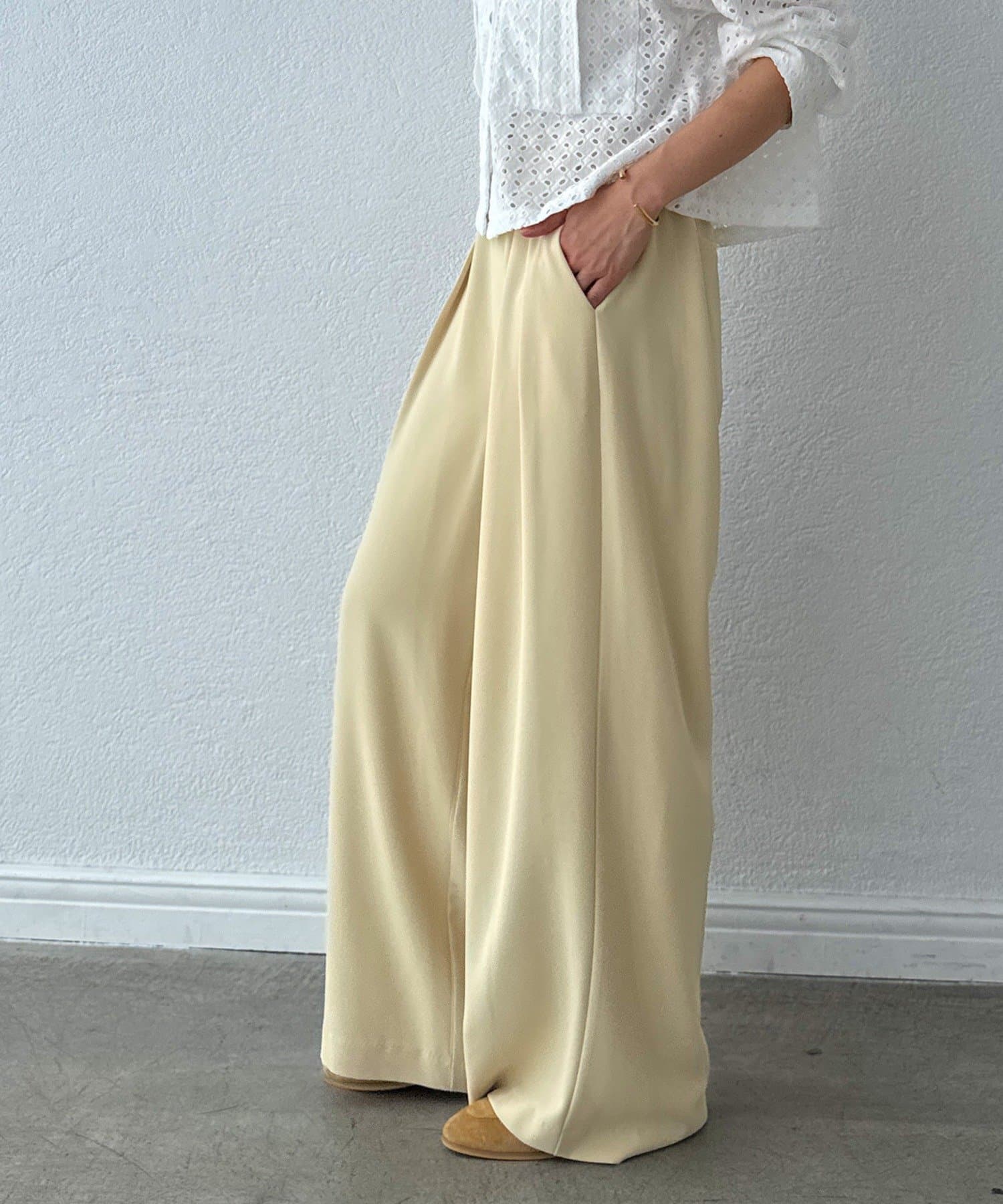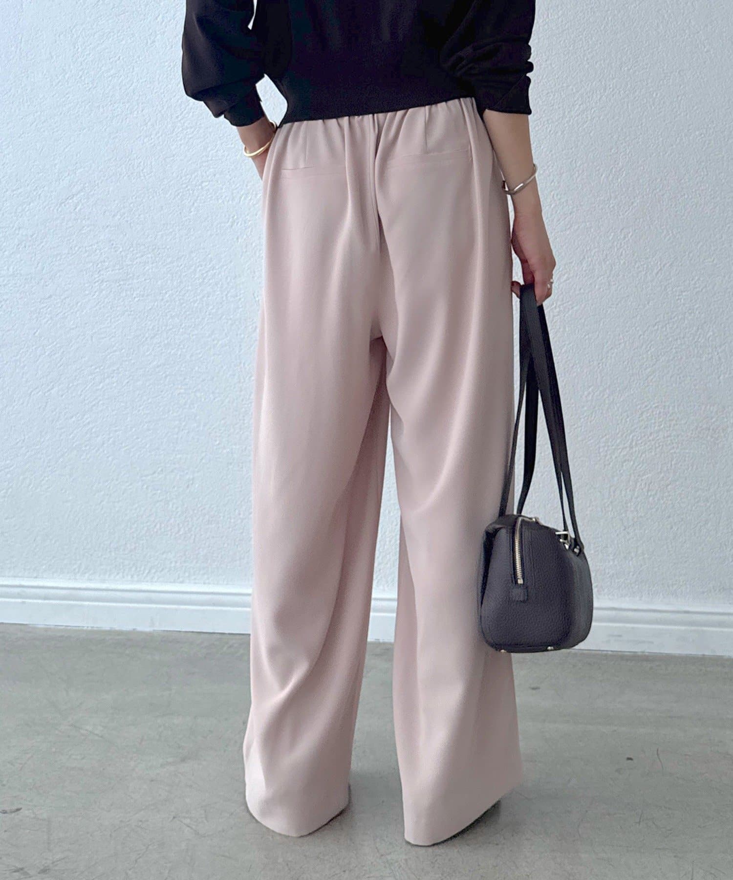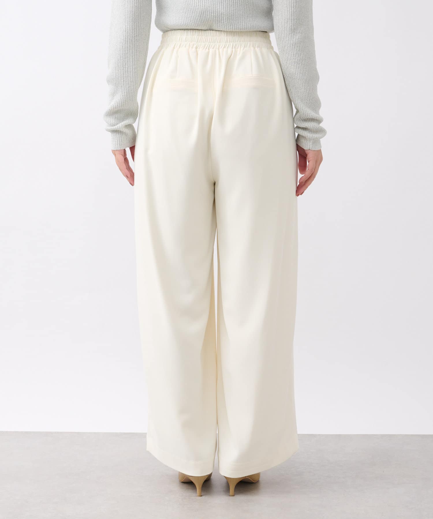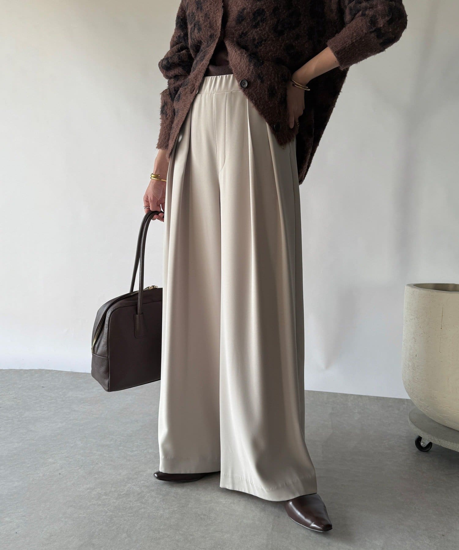 ファスナーがなく脱ぎ着もラクチン。タック入りで気になる腿周りをカバーする嬉しい効果も。