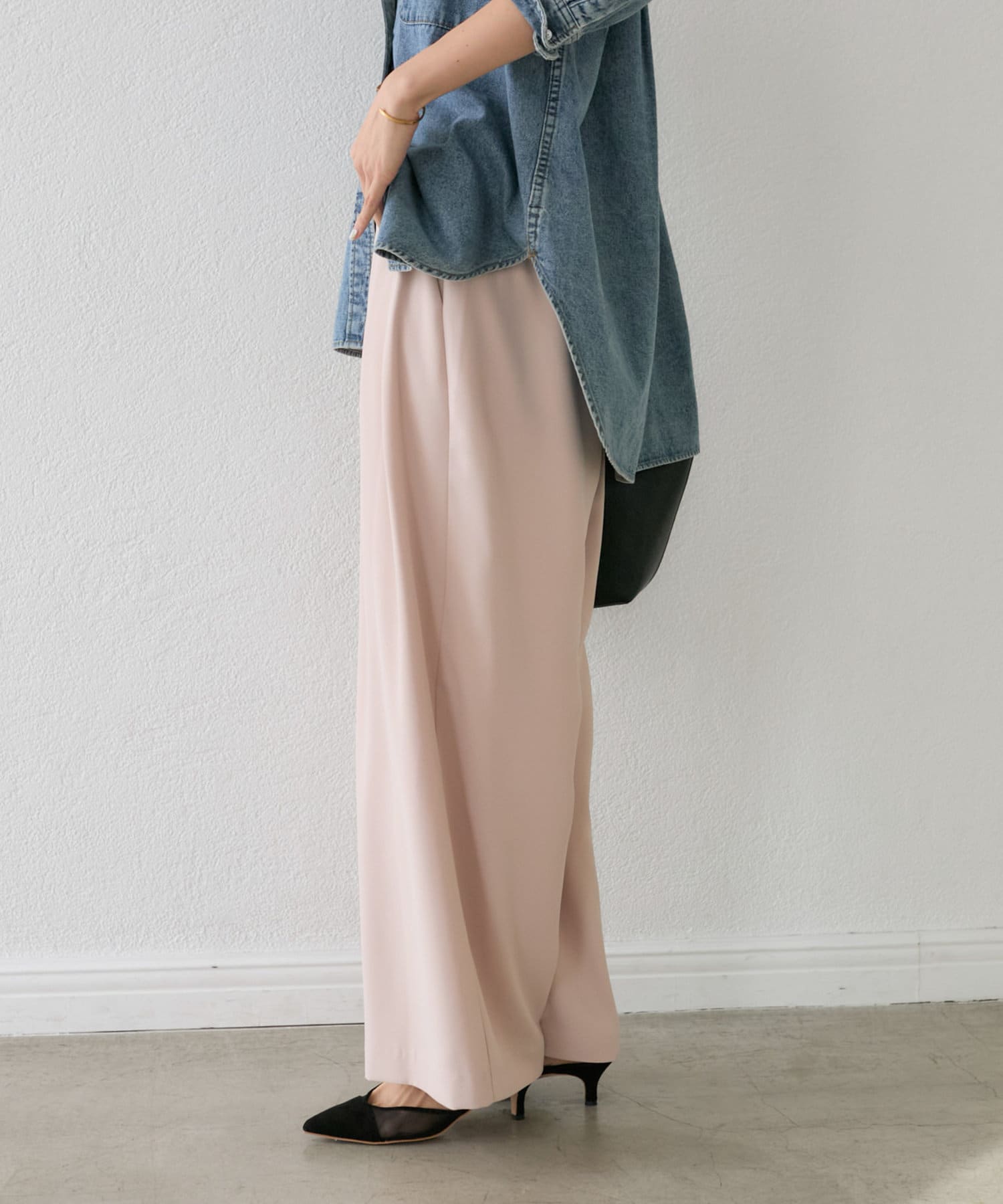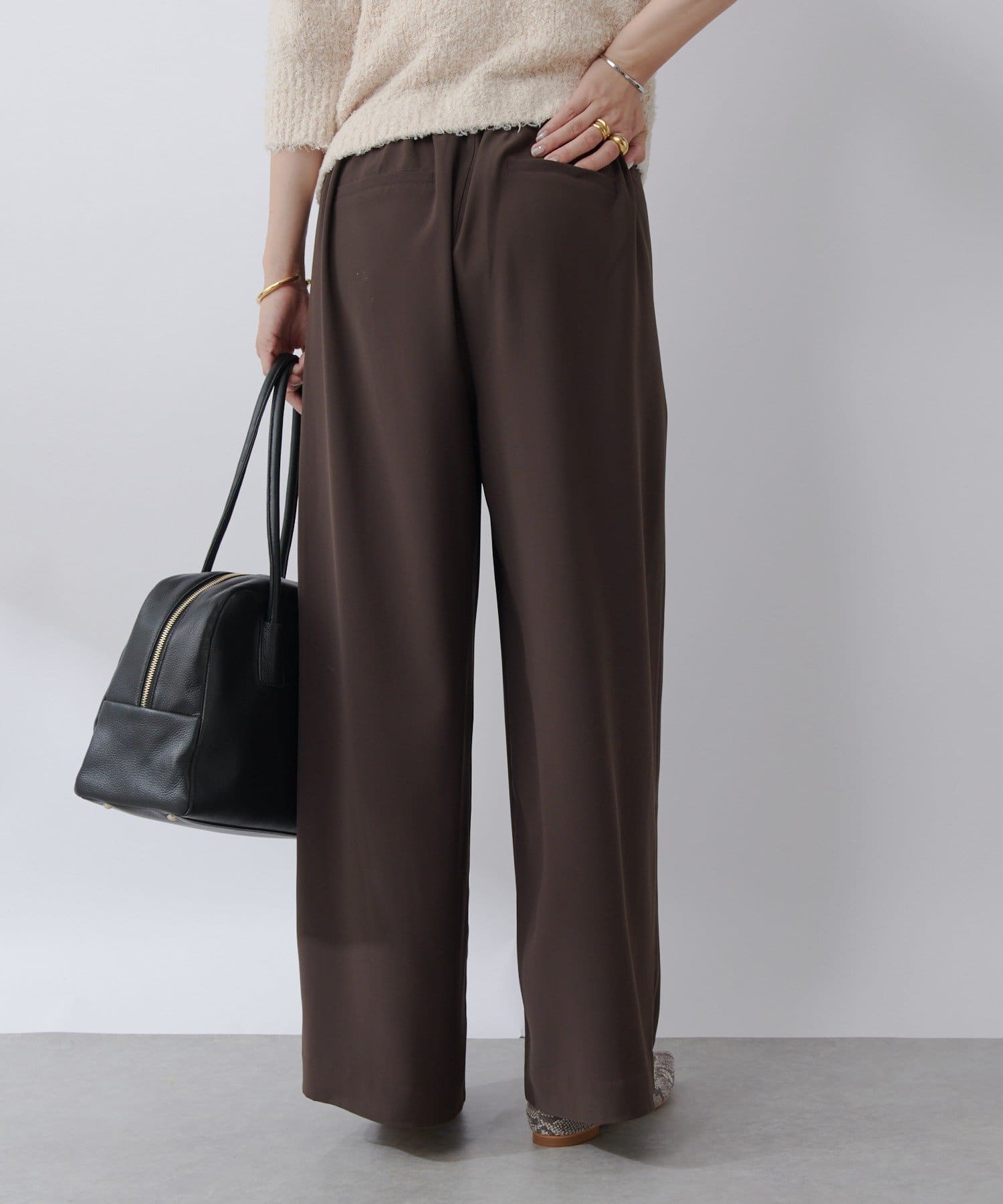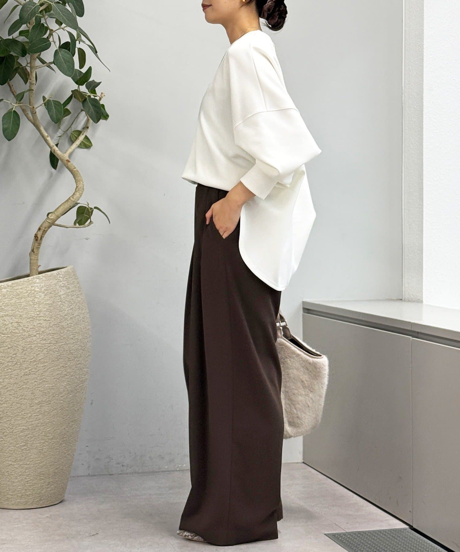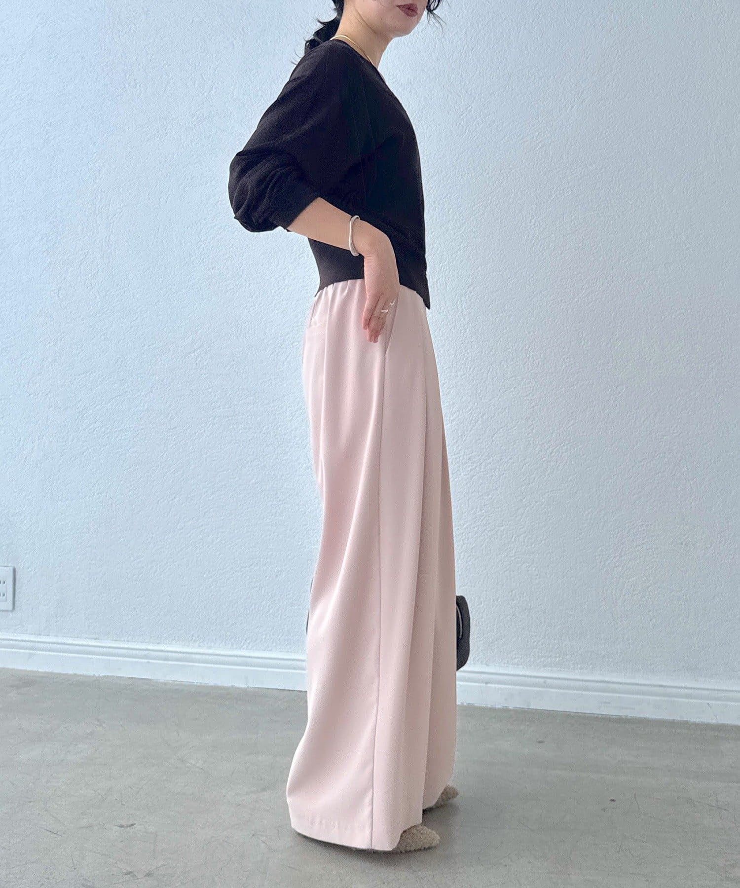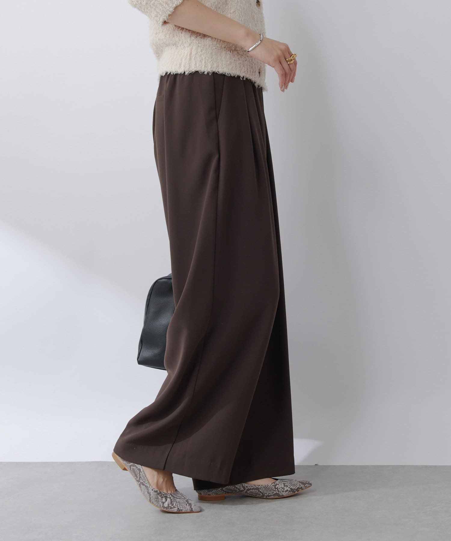 ファスナーがなく脱ぎ着もラクチン。タック入りで気になる腿周りをカバーする嬉しい効果も。