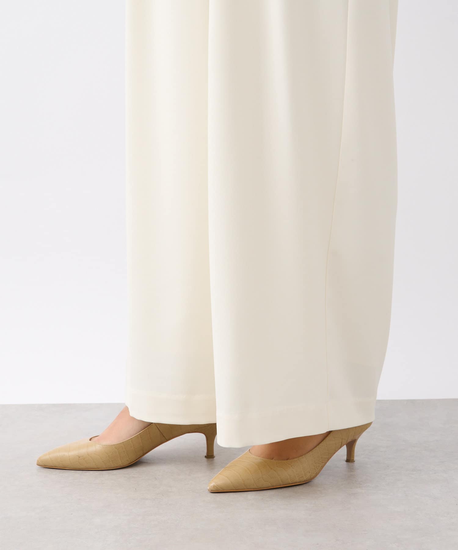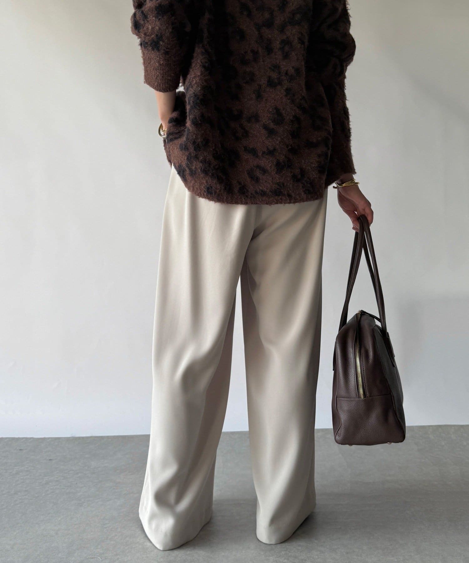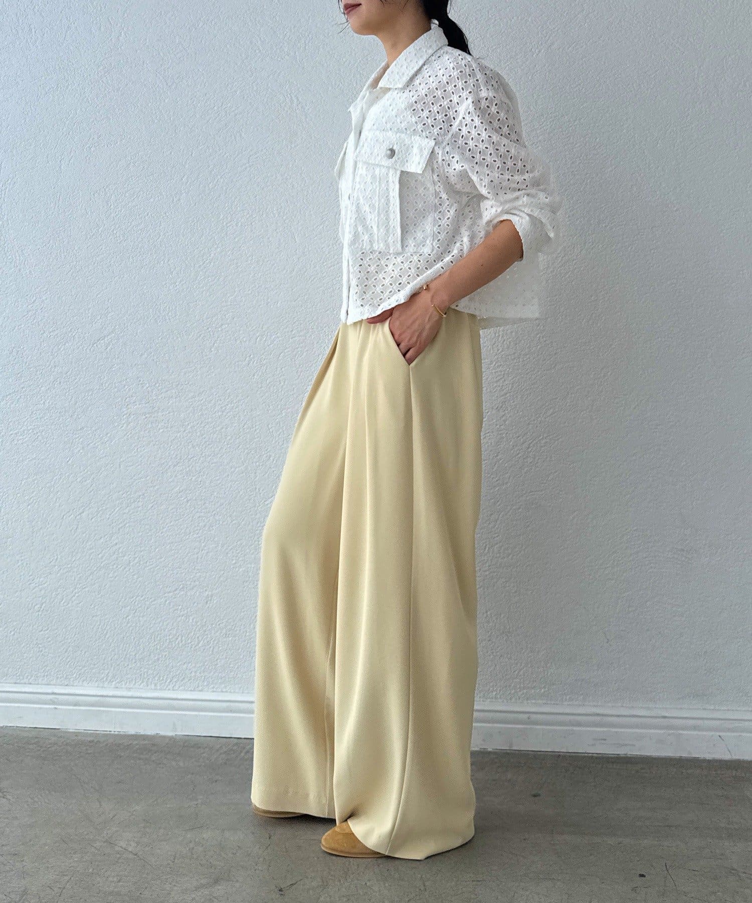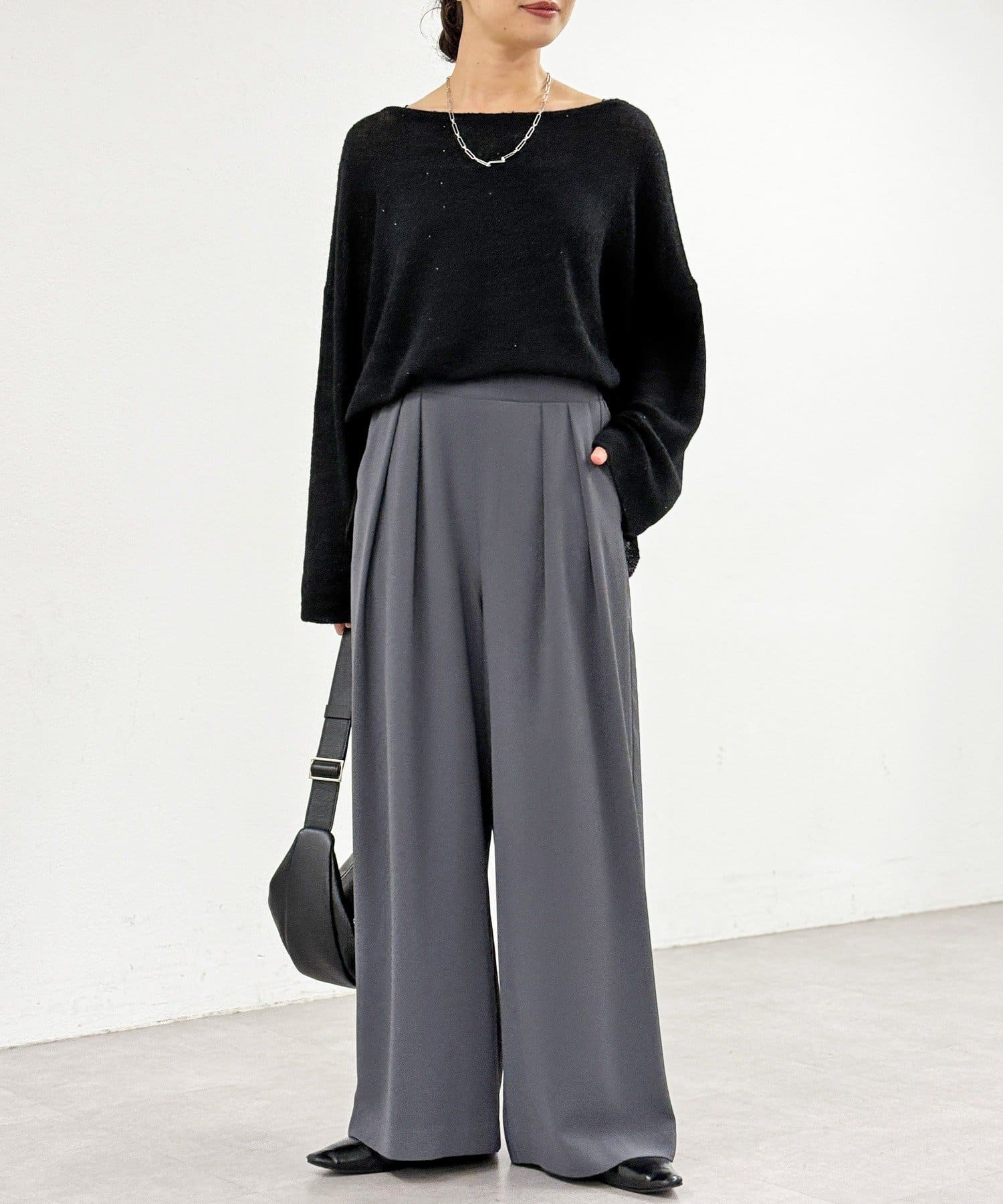 ファスナーがなく脱ぎ着もラクチン。タック入りで気になる腿周りをカバーする嬉しい効果も。