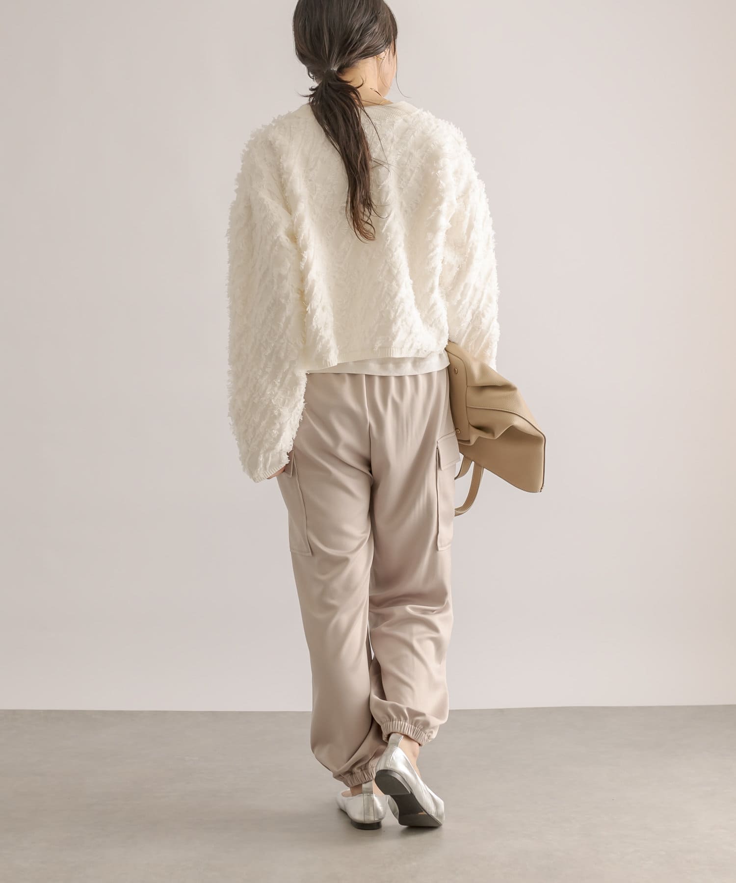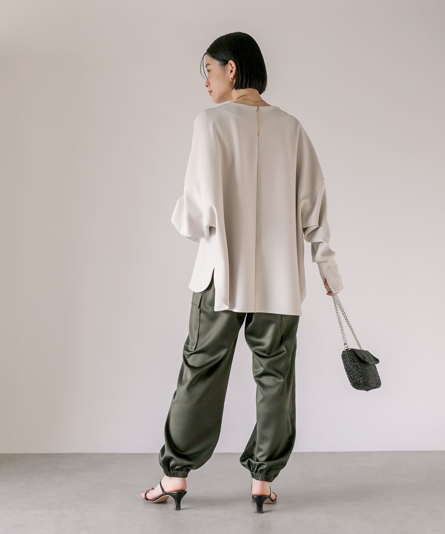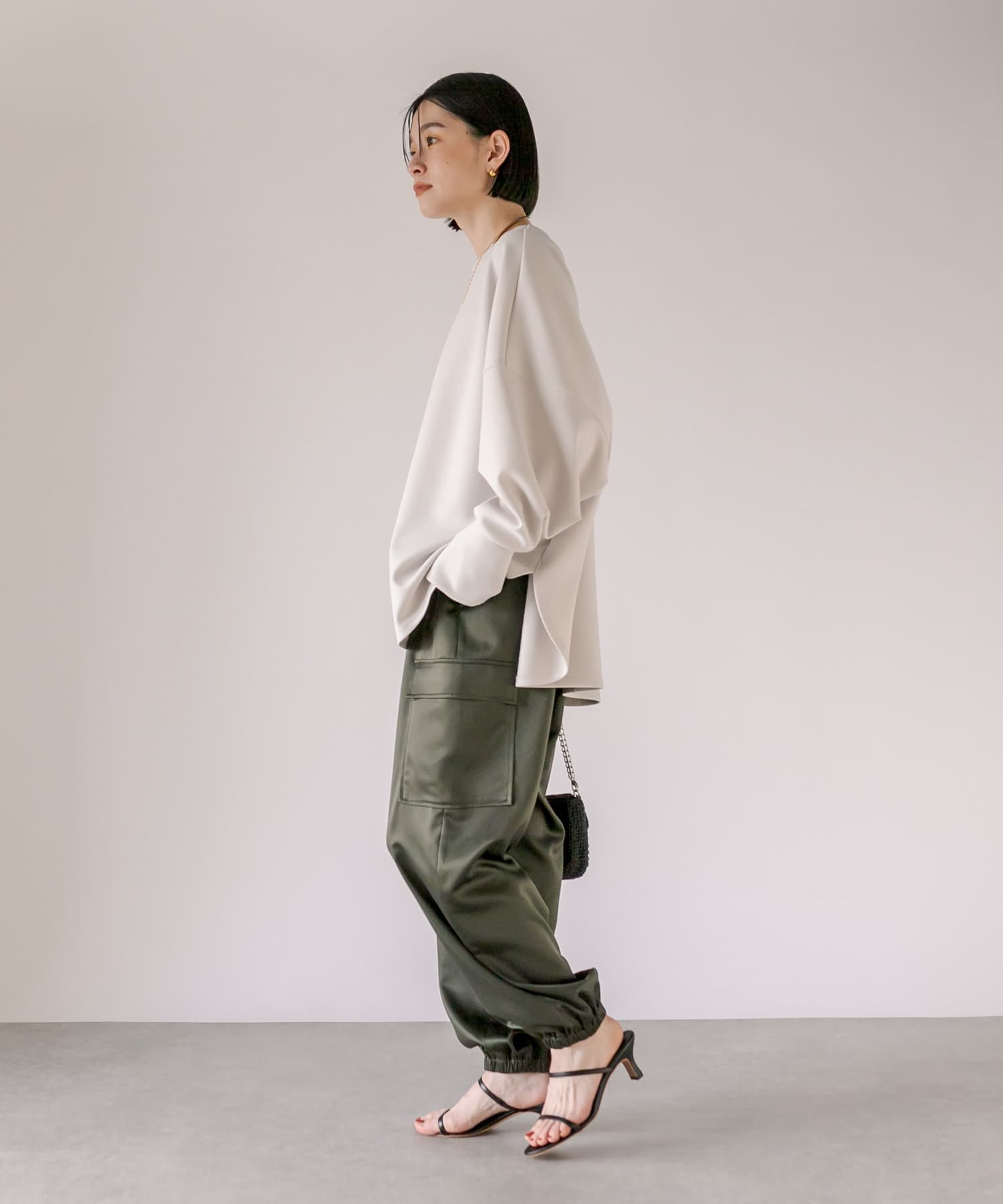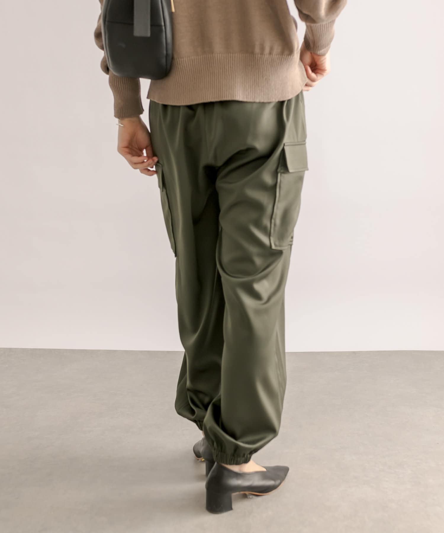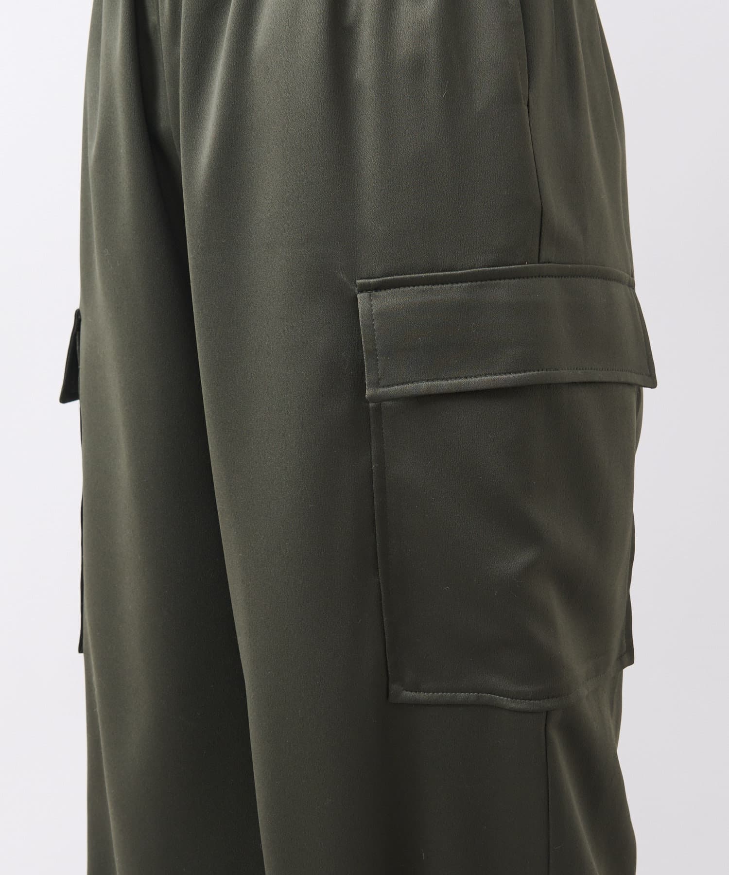 サテン生地を採用したカーゴパンツ。