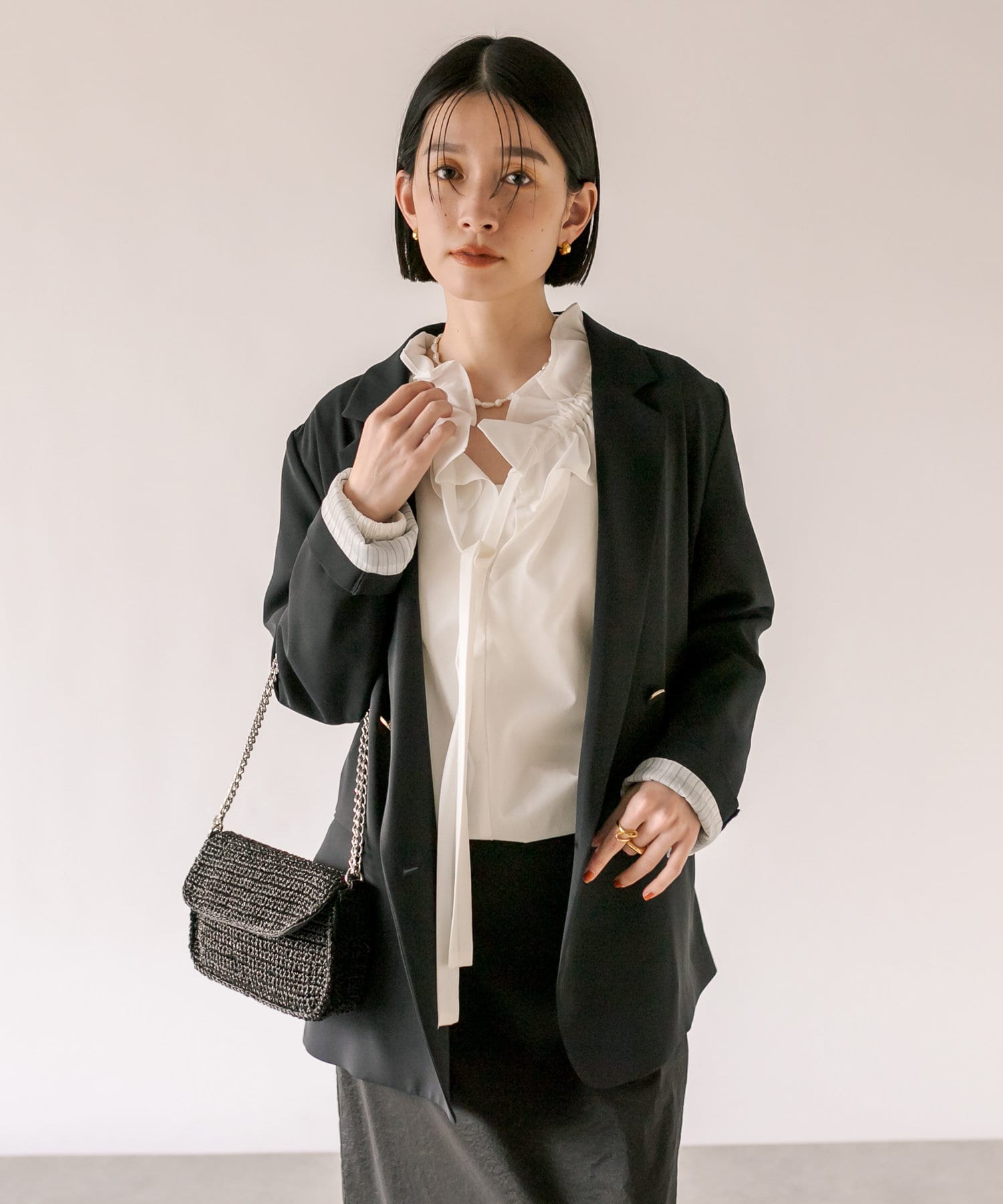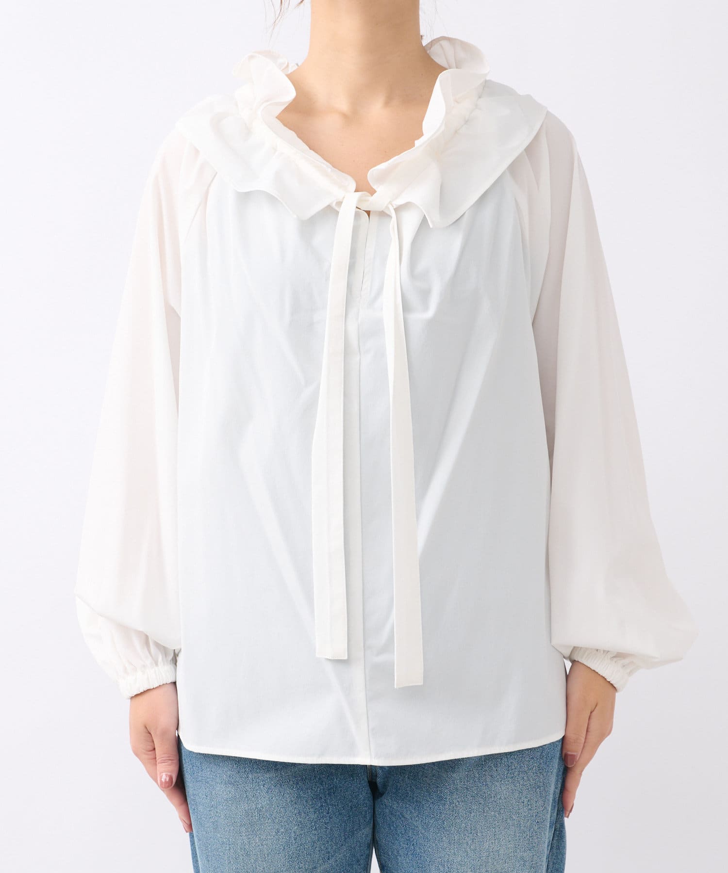 衿元のギャザーフリルがポイントのブラウス。