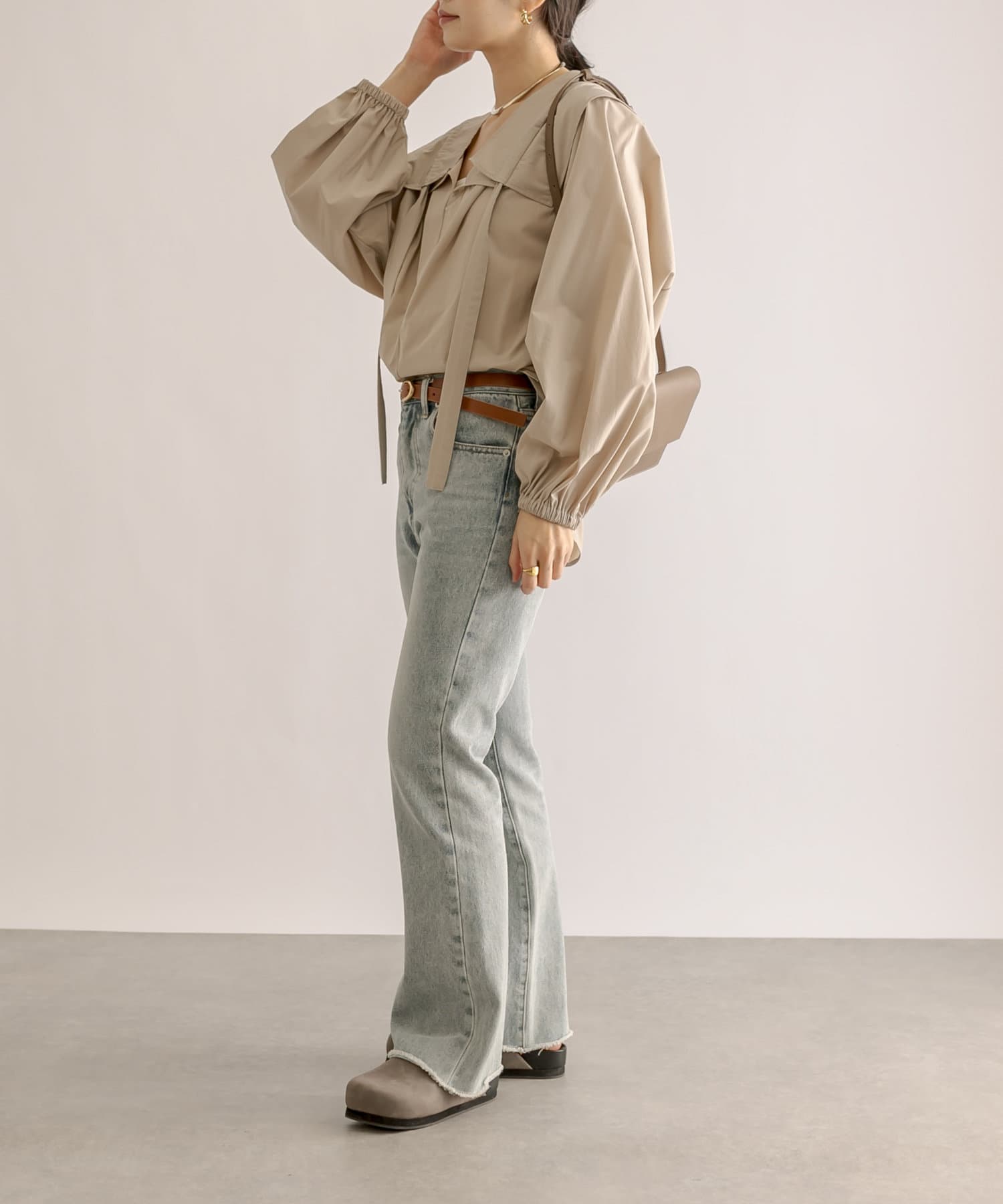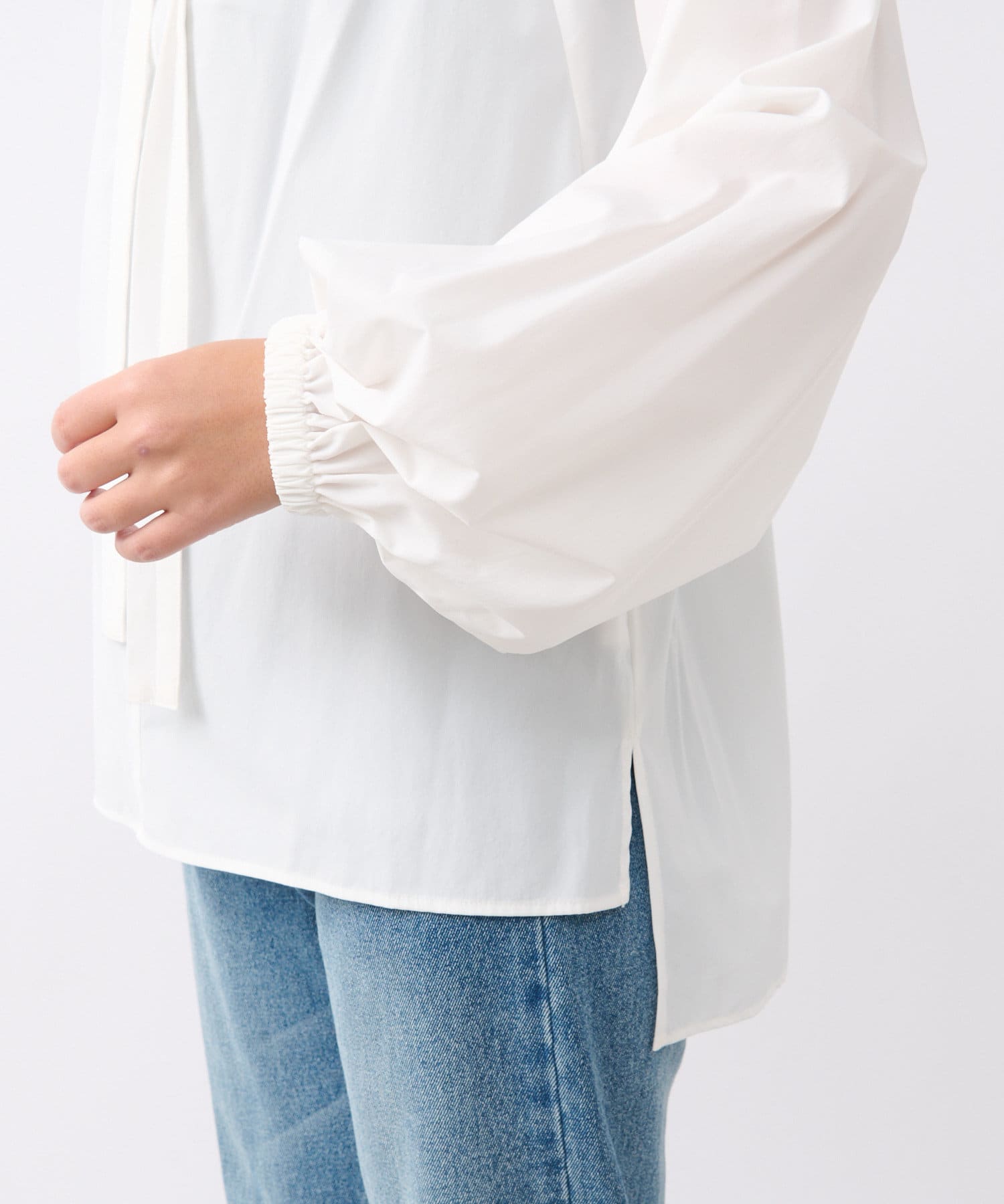 袖口はギャザーが寄ったゴム仕様になっているので、より軽やかな印象の一枚です。