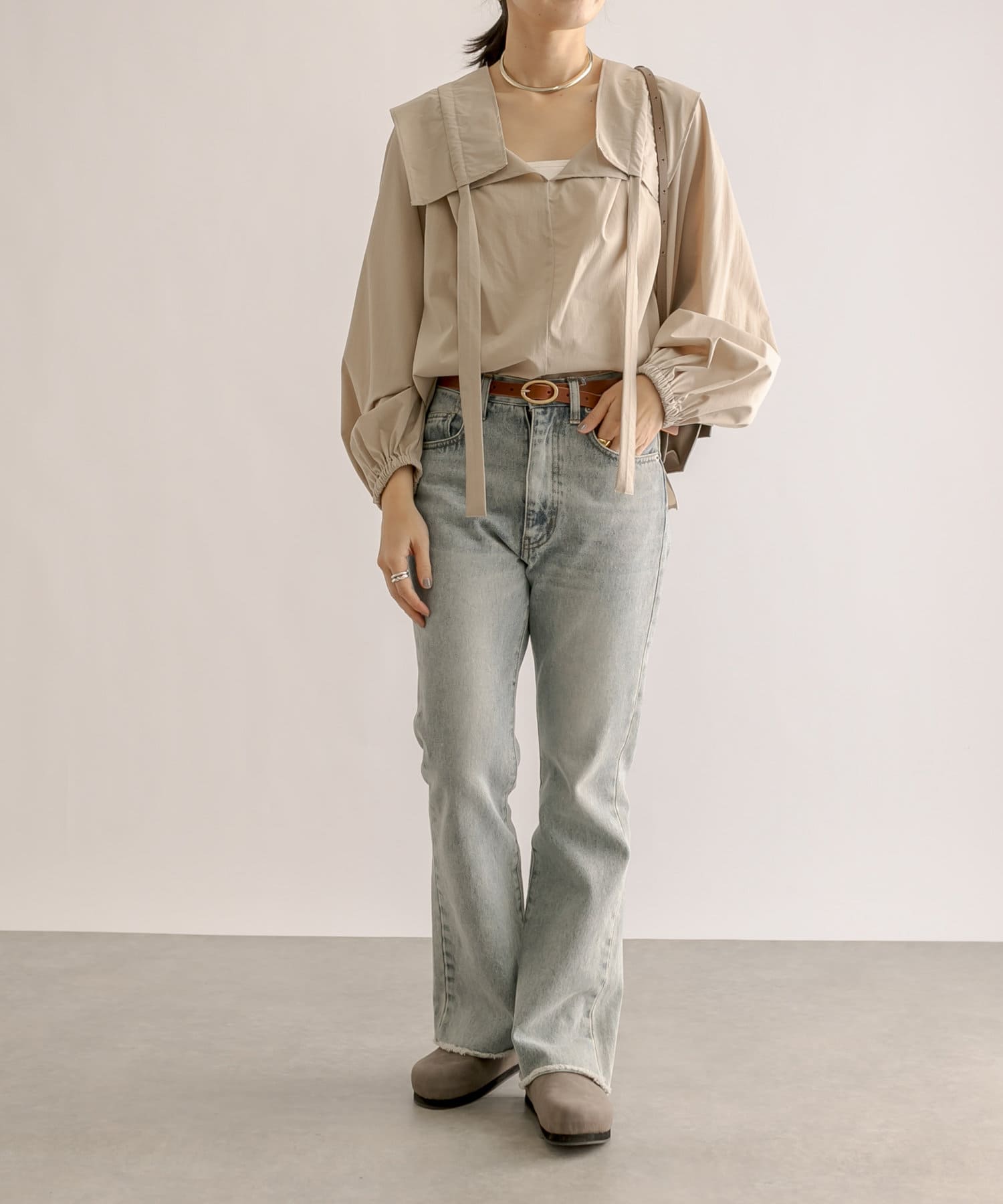フリルが可愛すぎるかと思ったけど、襟元で結ばず、デニムと合わせると素敵です。