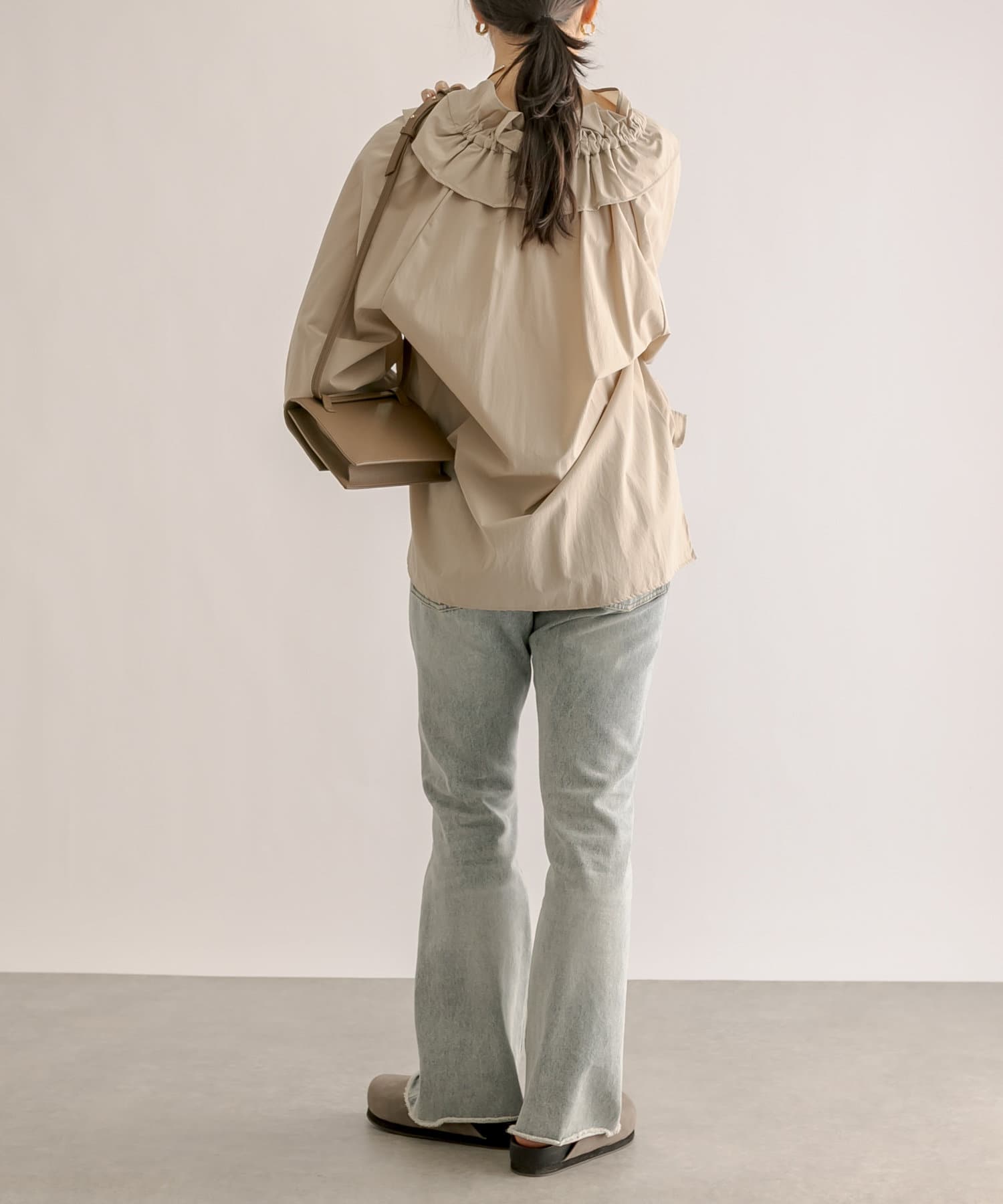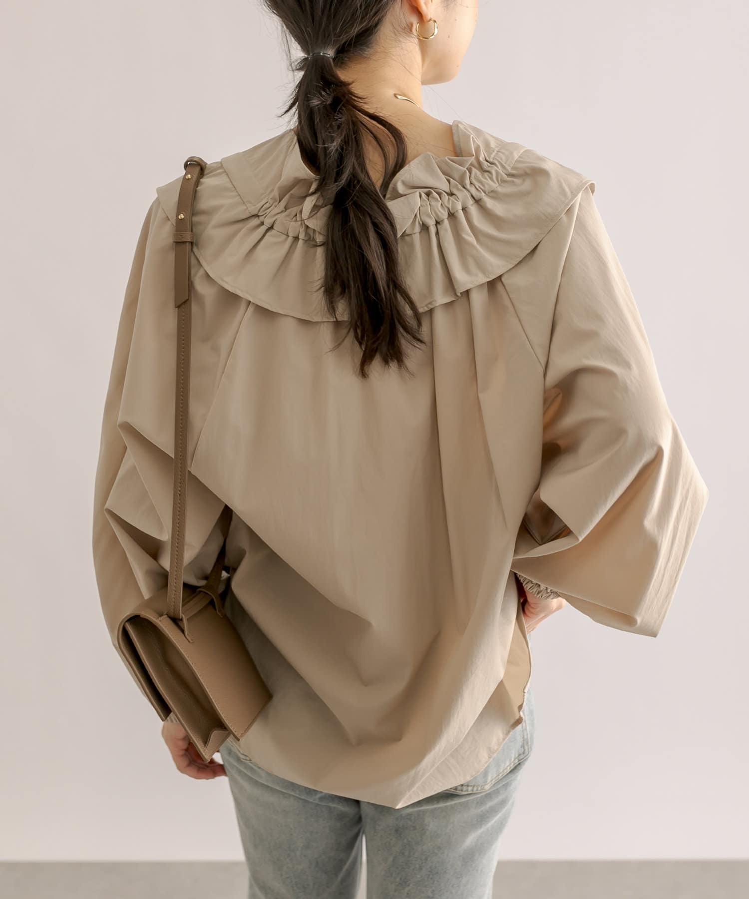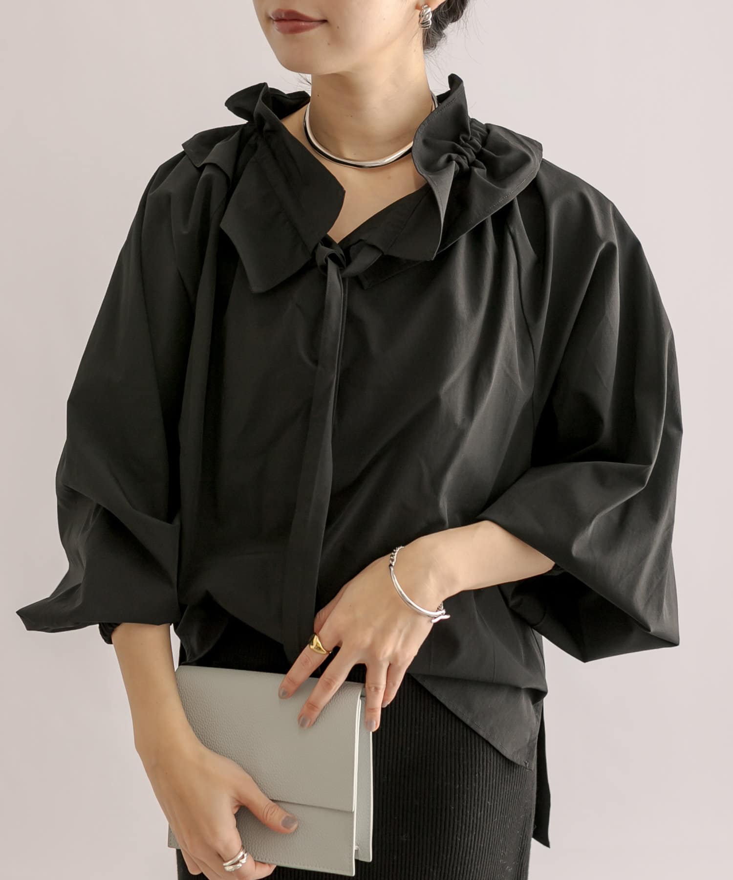 くしゅくしゅっとギャザーを寄せてフェミニンに仕上げたり、ギャザーを寄せずにフラットな衿にしてみたりと自由自在。