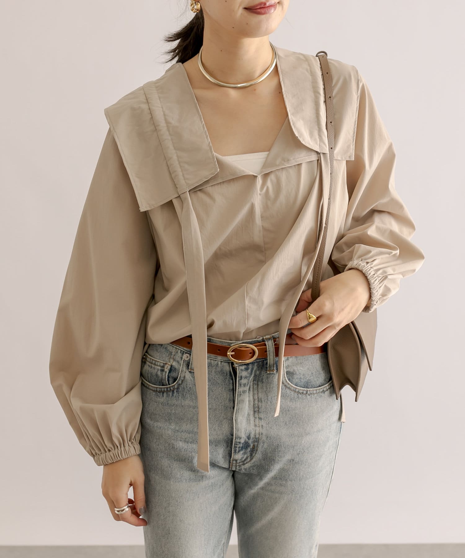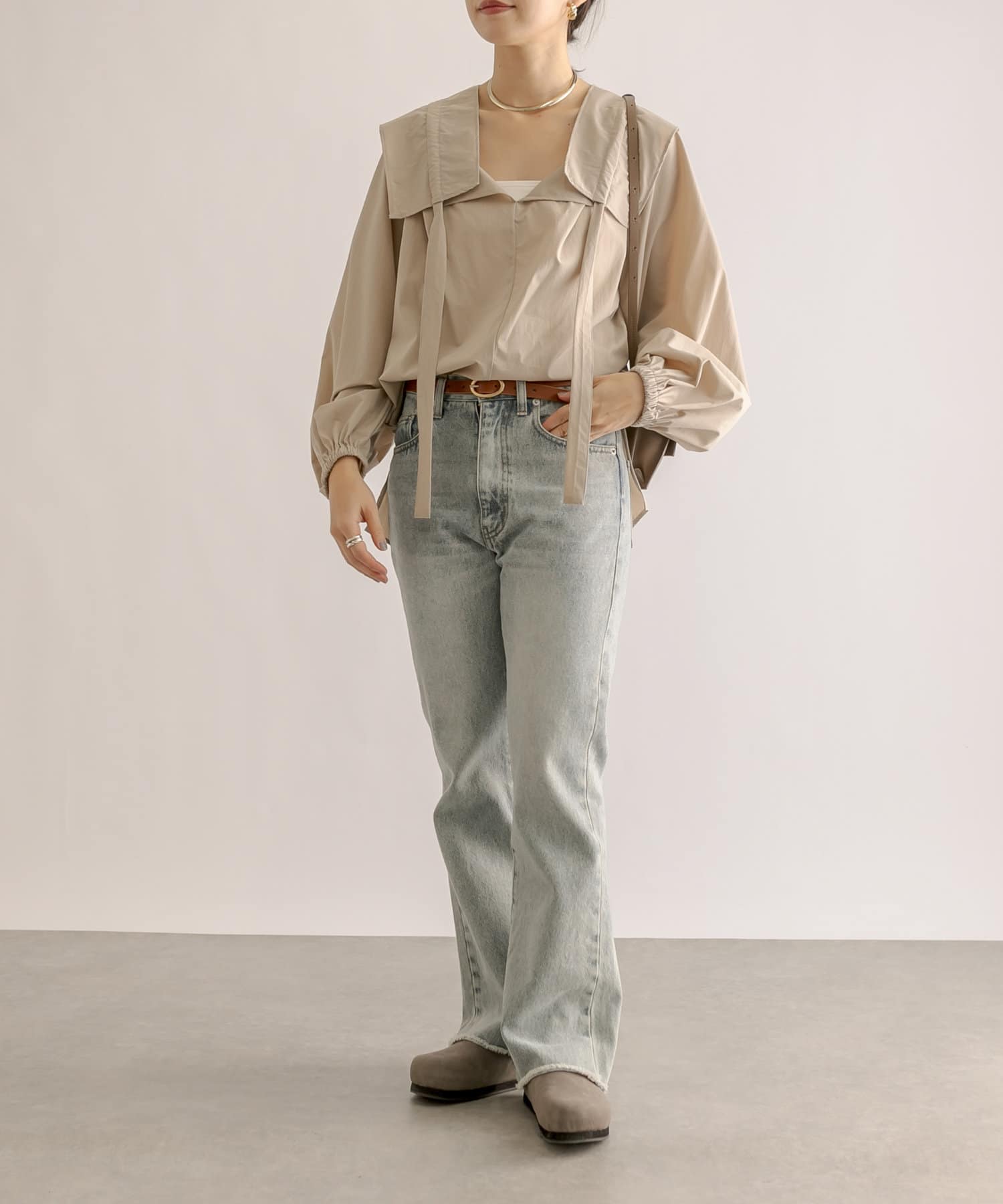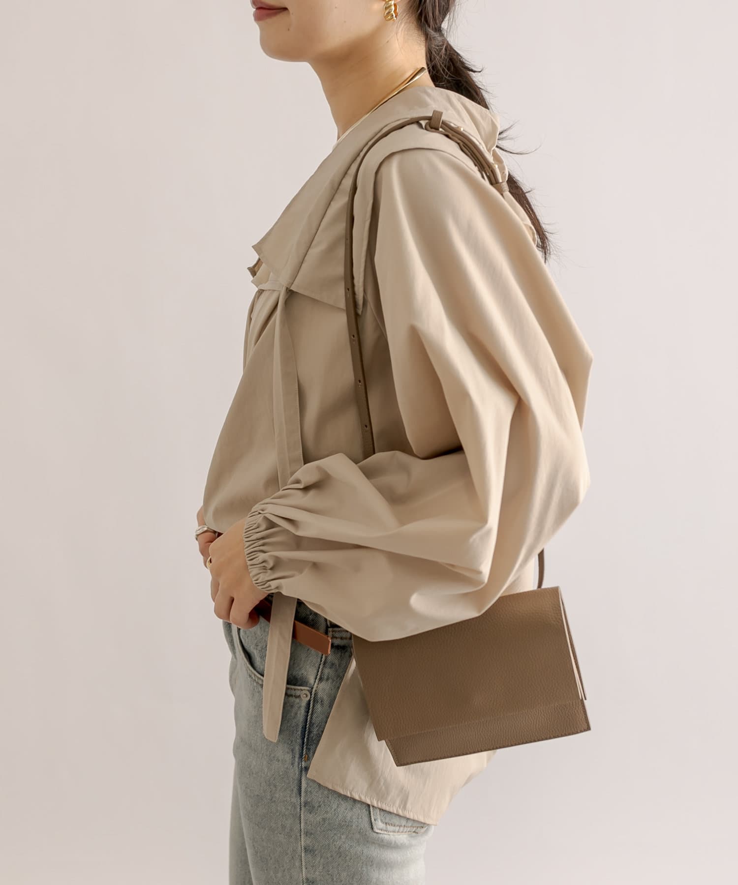くしゅくしゅっとギャザーを寄せてフェミニンに仕上げたり、ギャザーを寄せずにフラットな衿にしてみたりと自由自在。