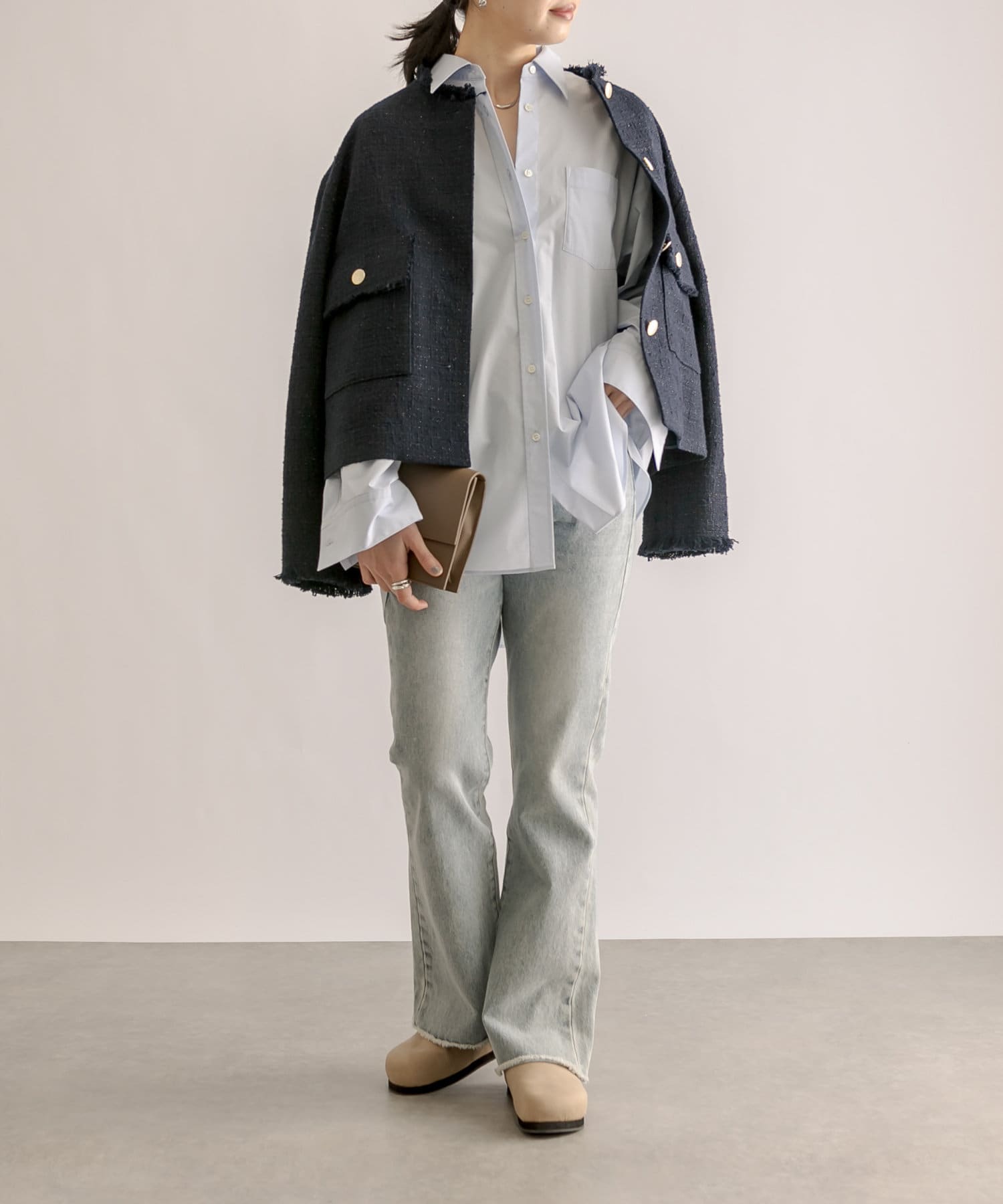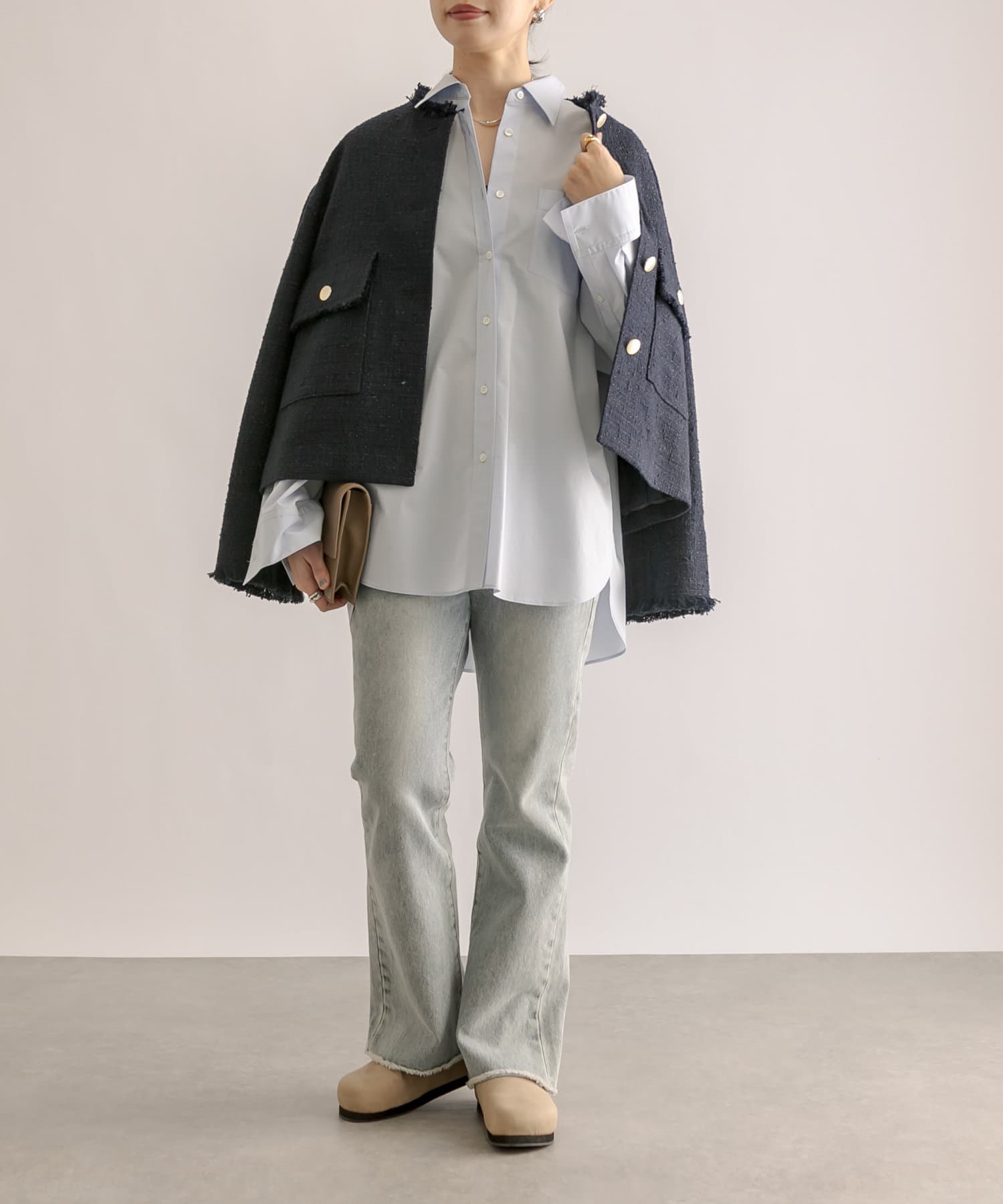 一枚ではもちろん、レイヤードするアイテム次第で幅広い着こなしを楽しめるアイテムです。