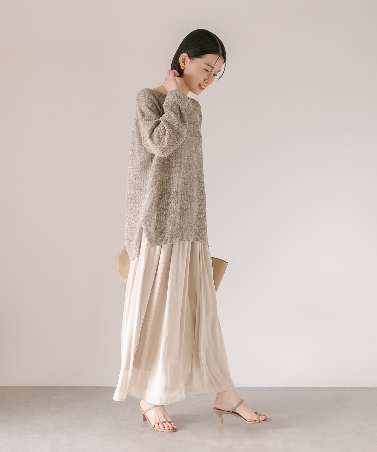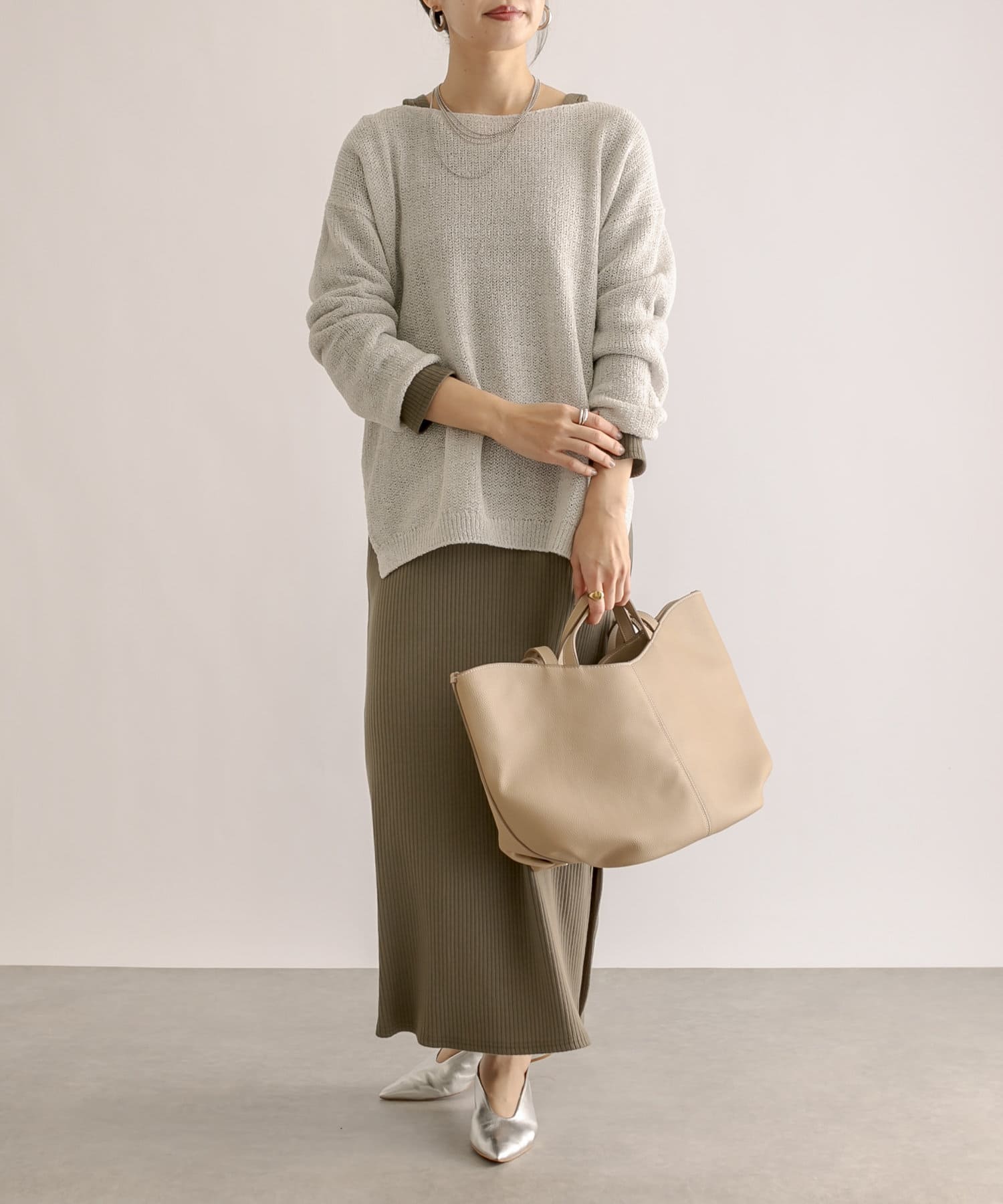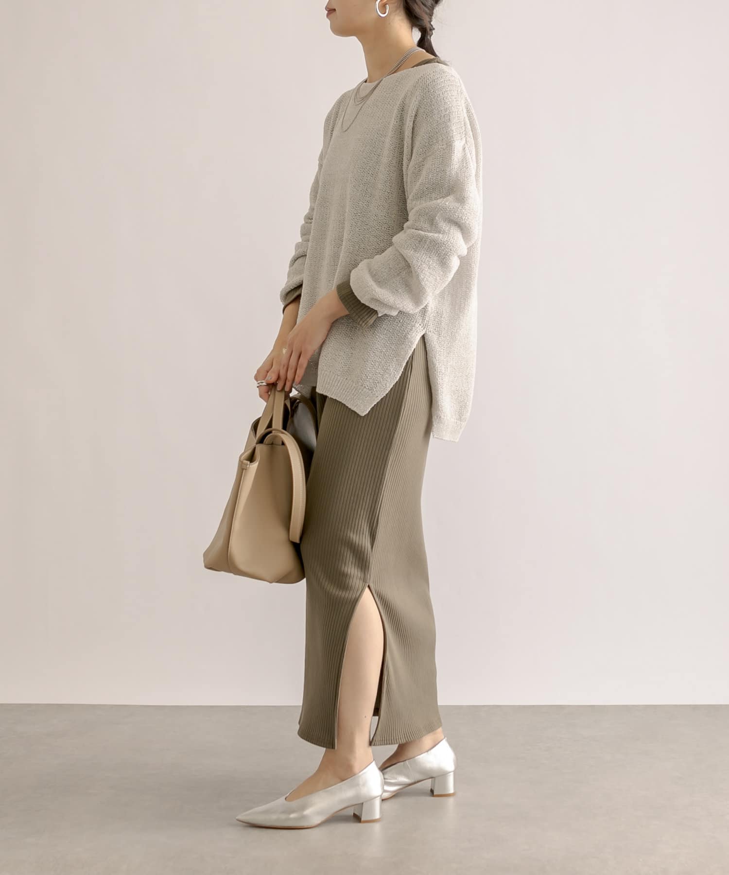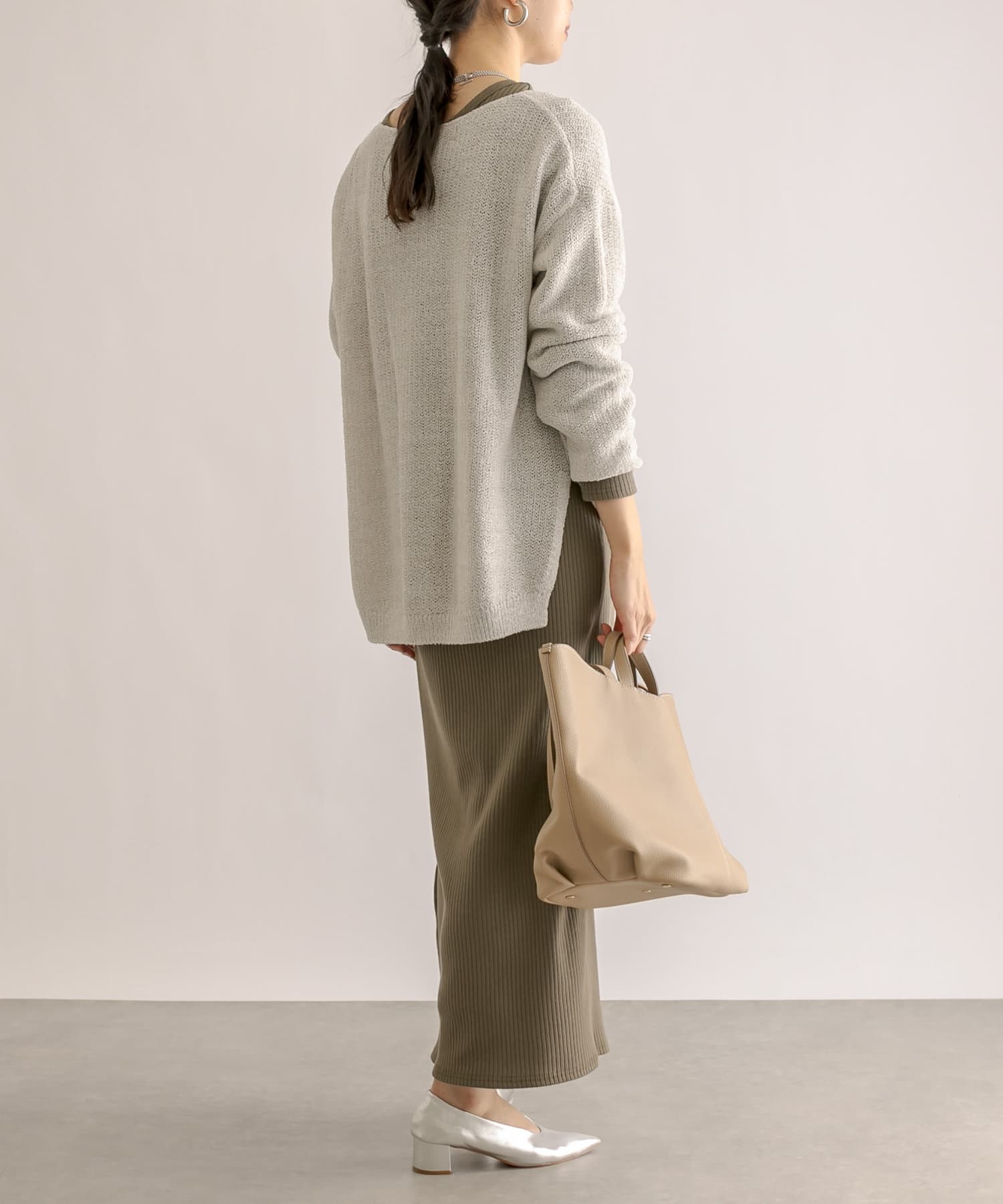 肌寒い日には薄手のタートルネックやカットソーを、暖かくなったらタンクトップやキャミソールをインしてと、ロングシーズン活躍。