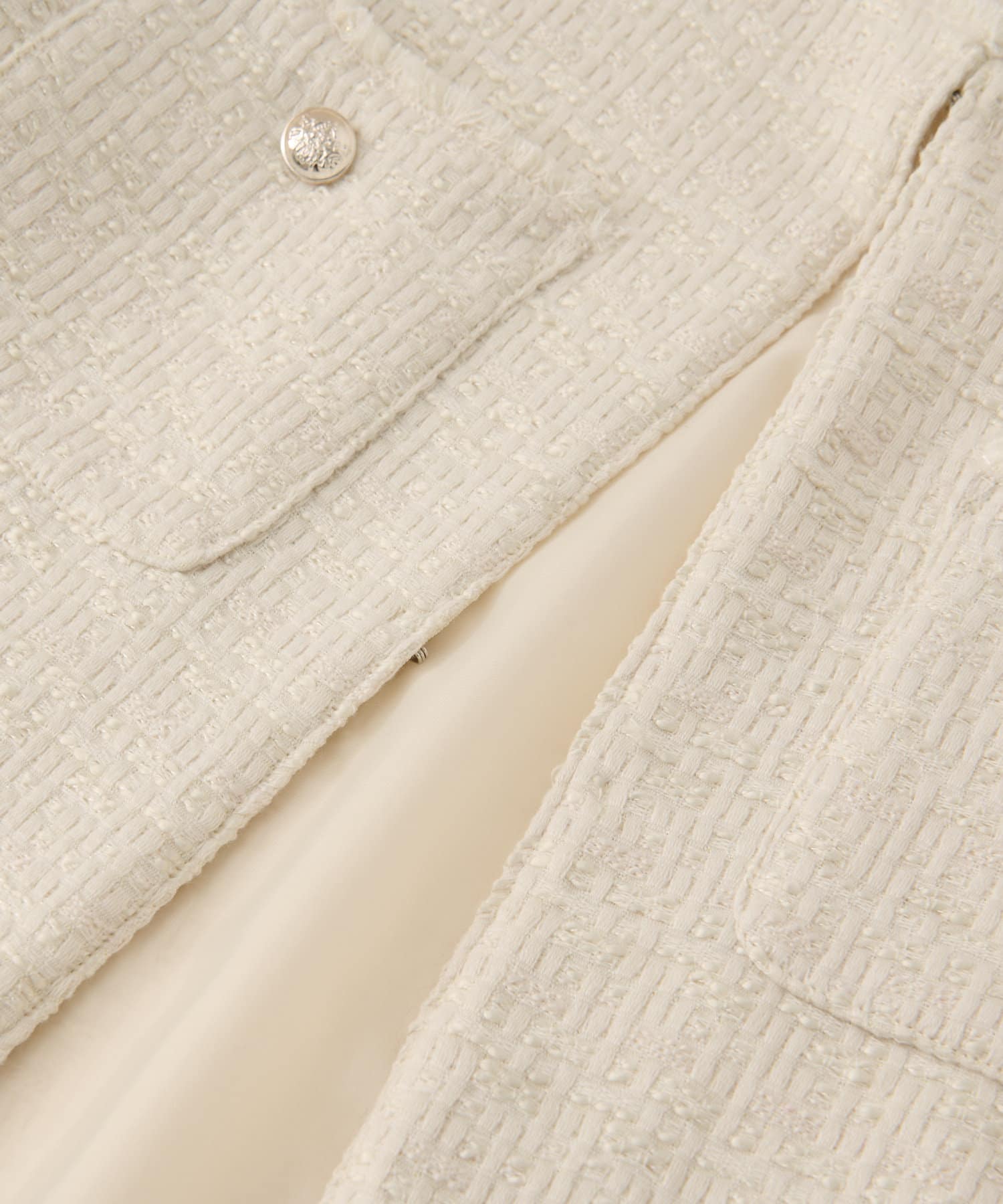 清潔感のあるクリーンなカラーリングの中に、襟元とポケットに施されたフリンジデザインがさりげないポイントです。