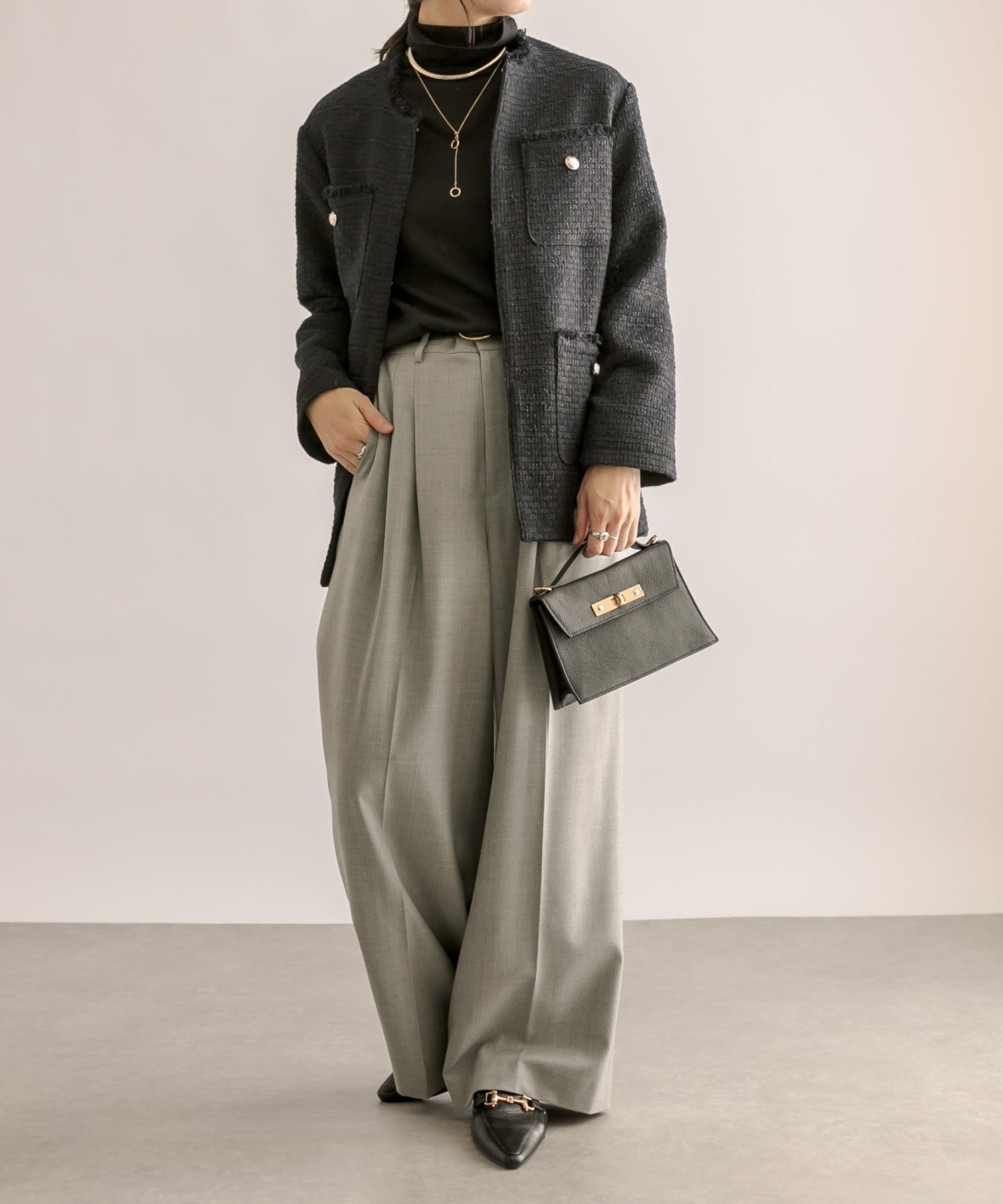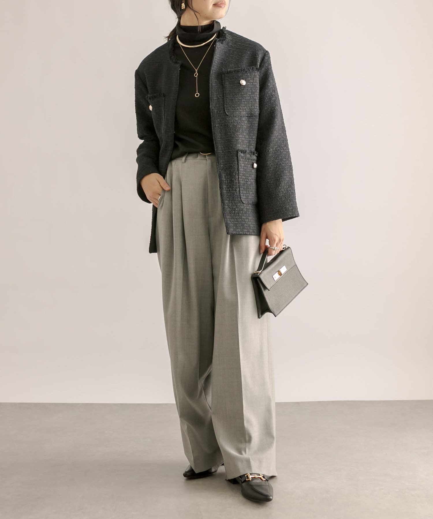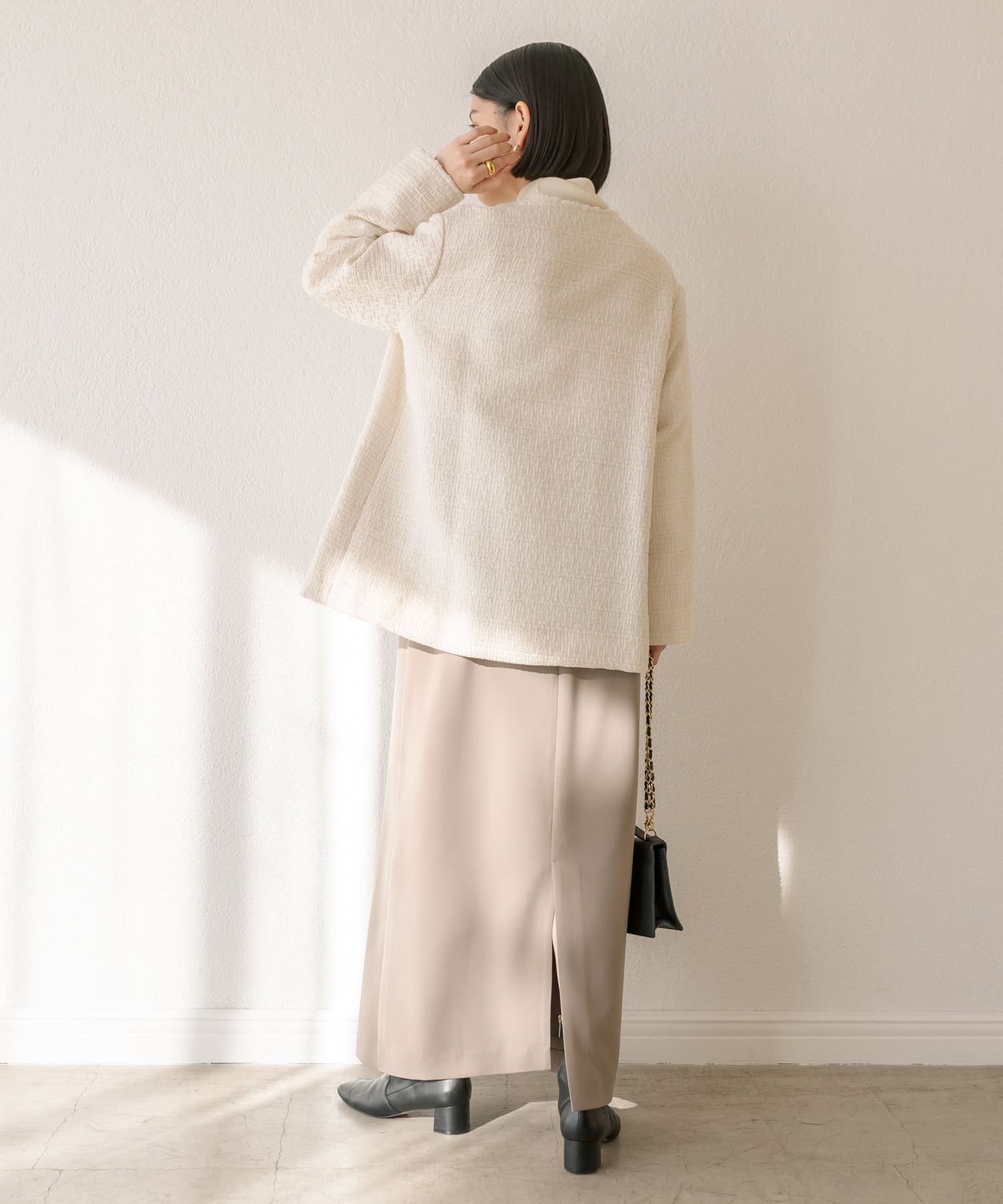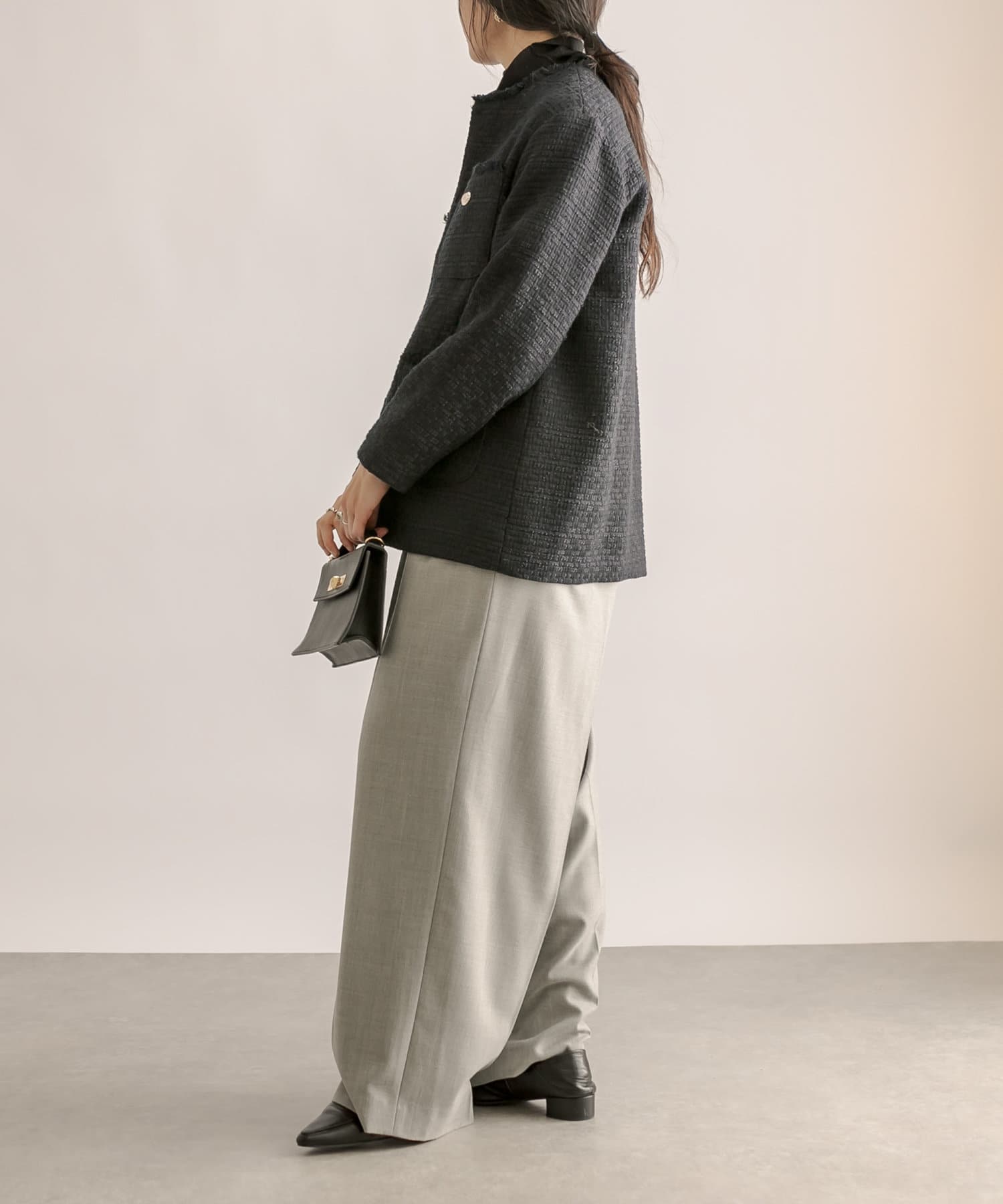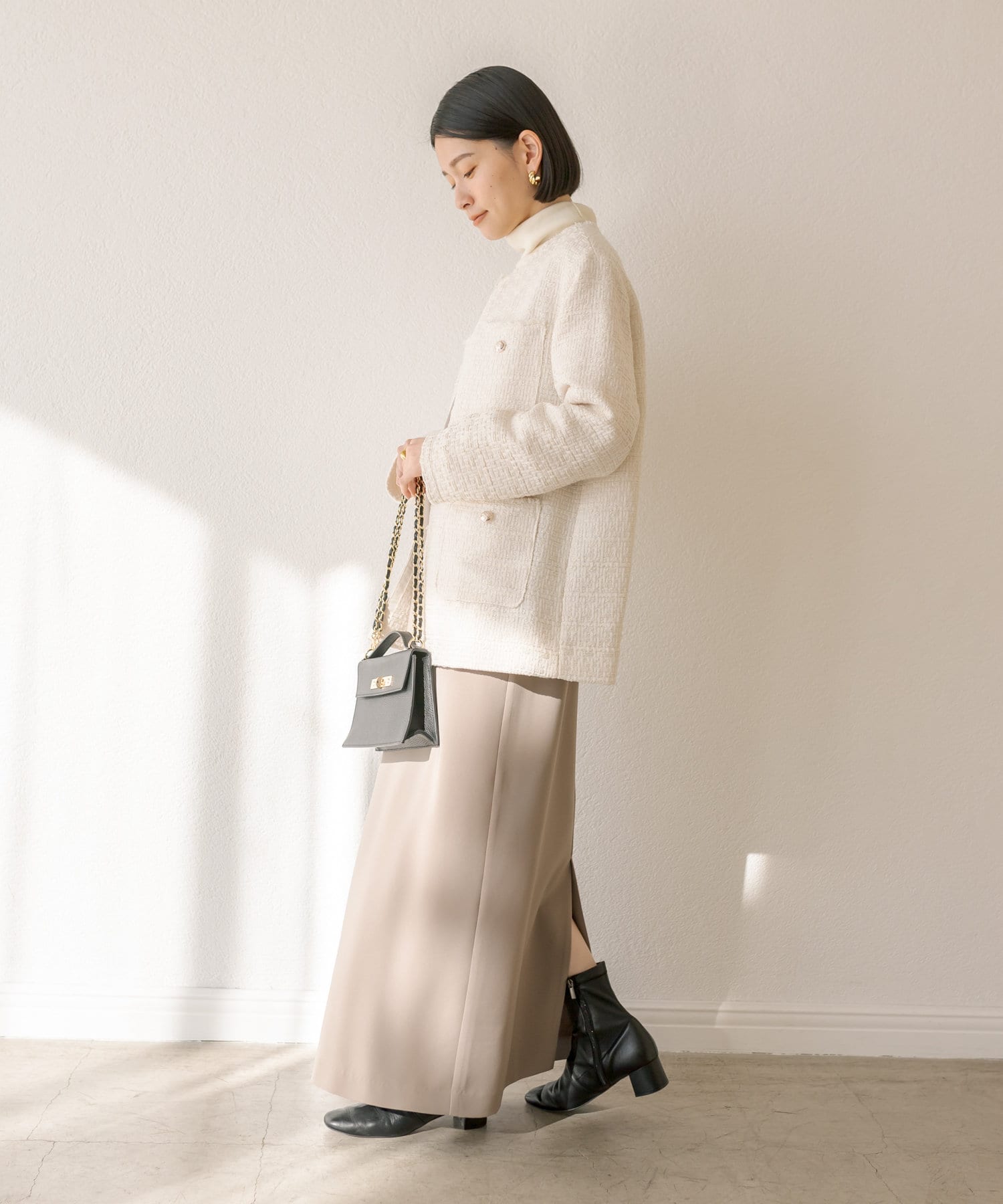 ヒップにかかる程度のコンパクトすぎないサイズ感で、ワンピース、スカート、パンツと、様々なアイテムと相性抜群。