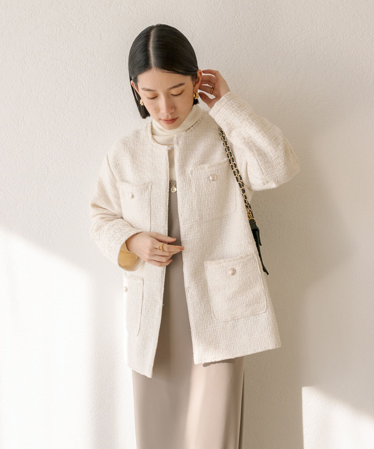 154センチでお尻はスッポリ隠れる丈ですが、着膨れせずスッキリ羽織れます。ツイードボタンがシルバーになっていて程よくアクセントになってくれます。