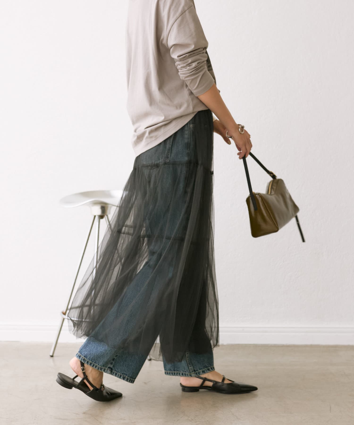 チュール部分とペチコートが分かれているため、デニムなどパンツの上からチュールを着て楽しんでいただくことも可能です。