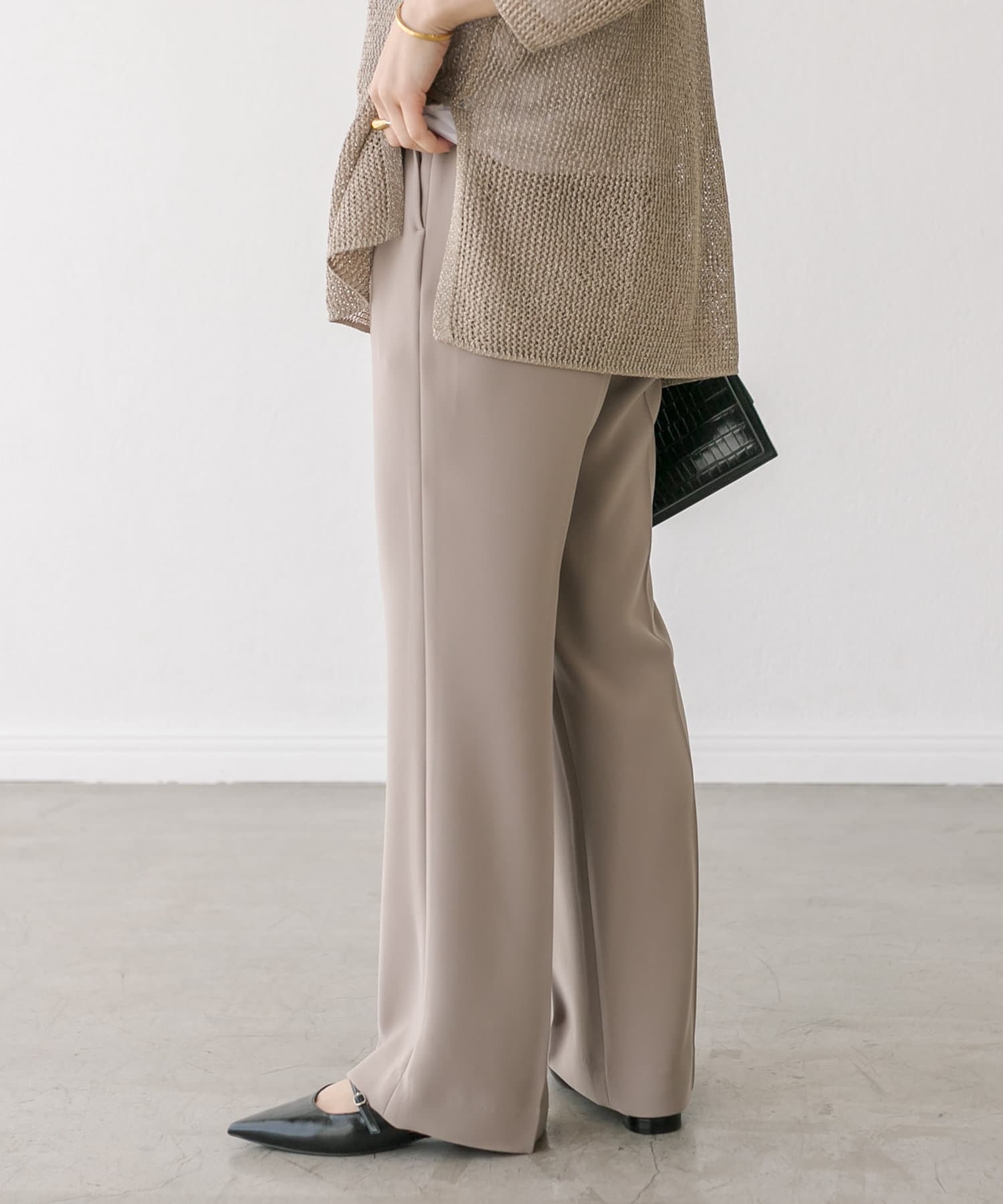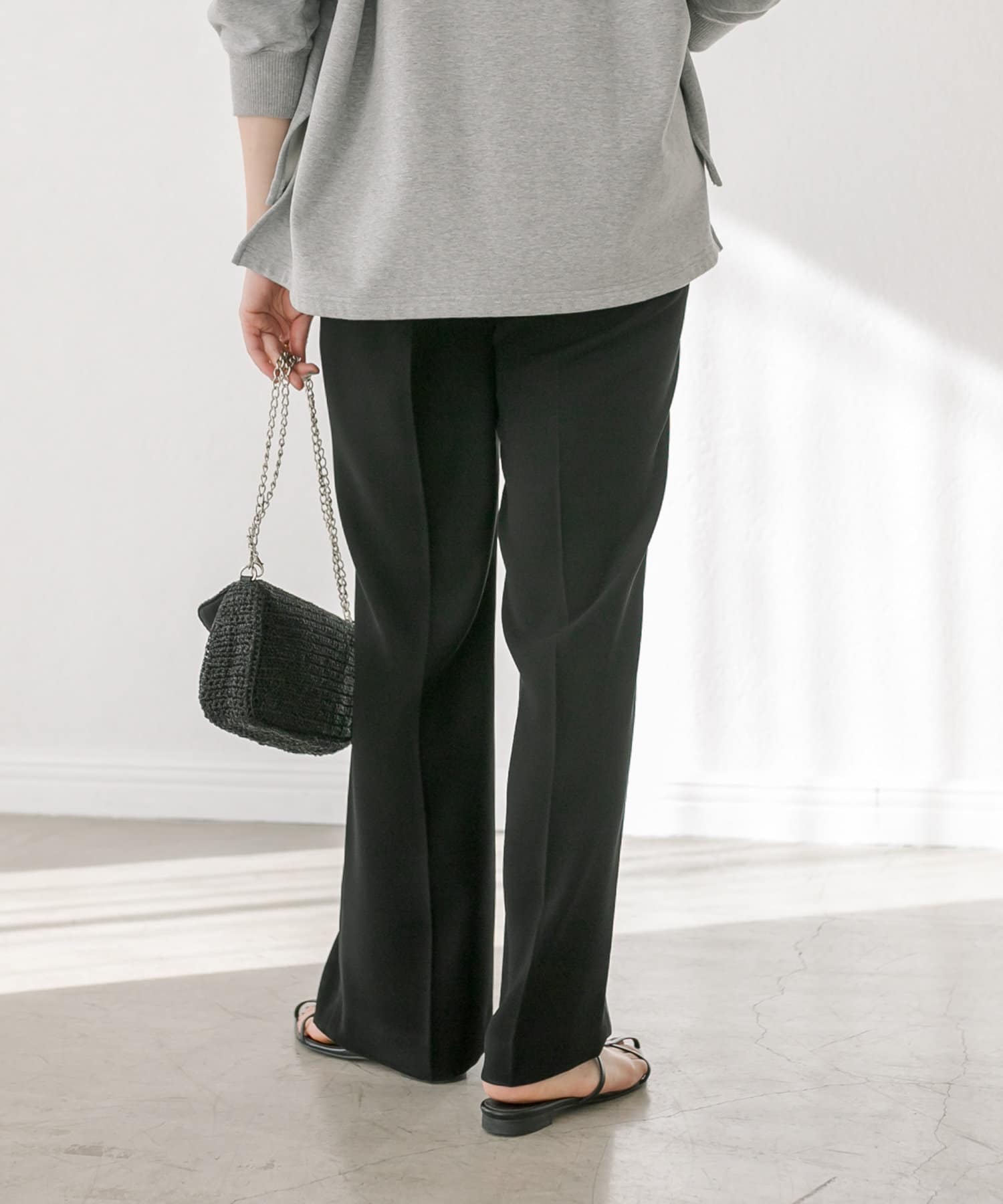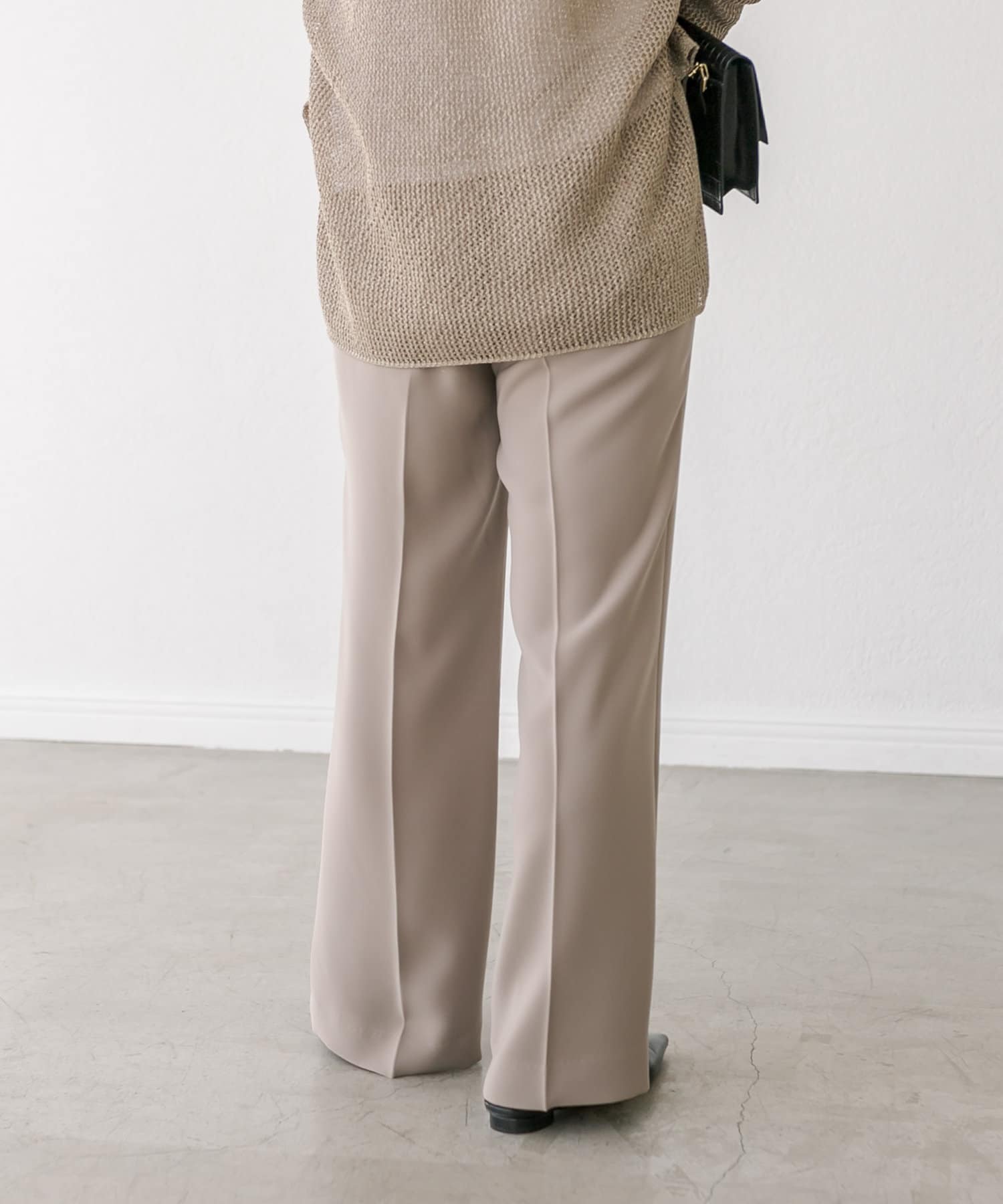 広がりすぎないフレアシルエットでスタイルアップが叶うパンツ。