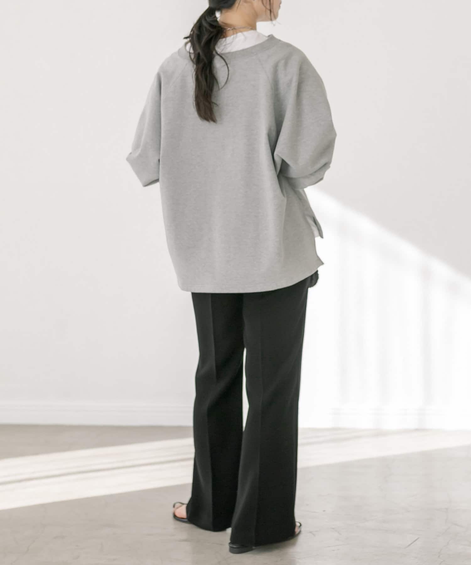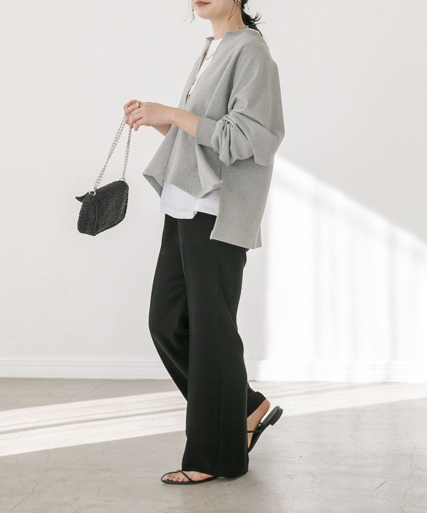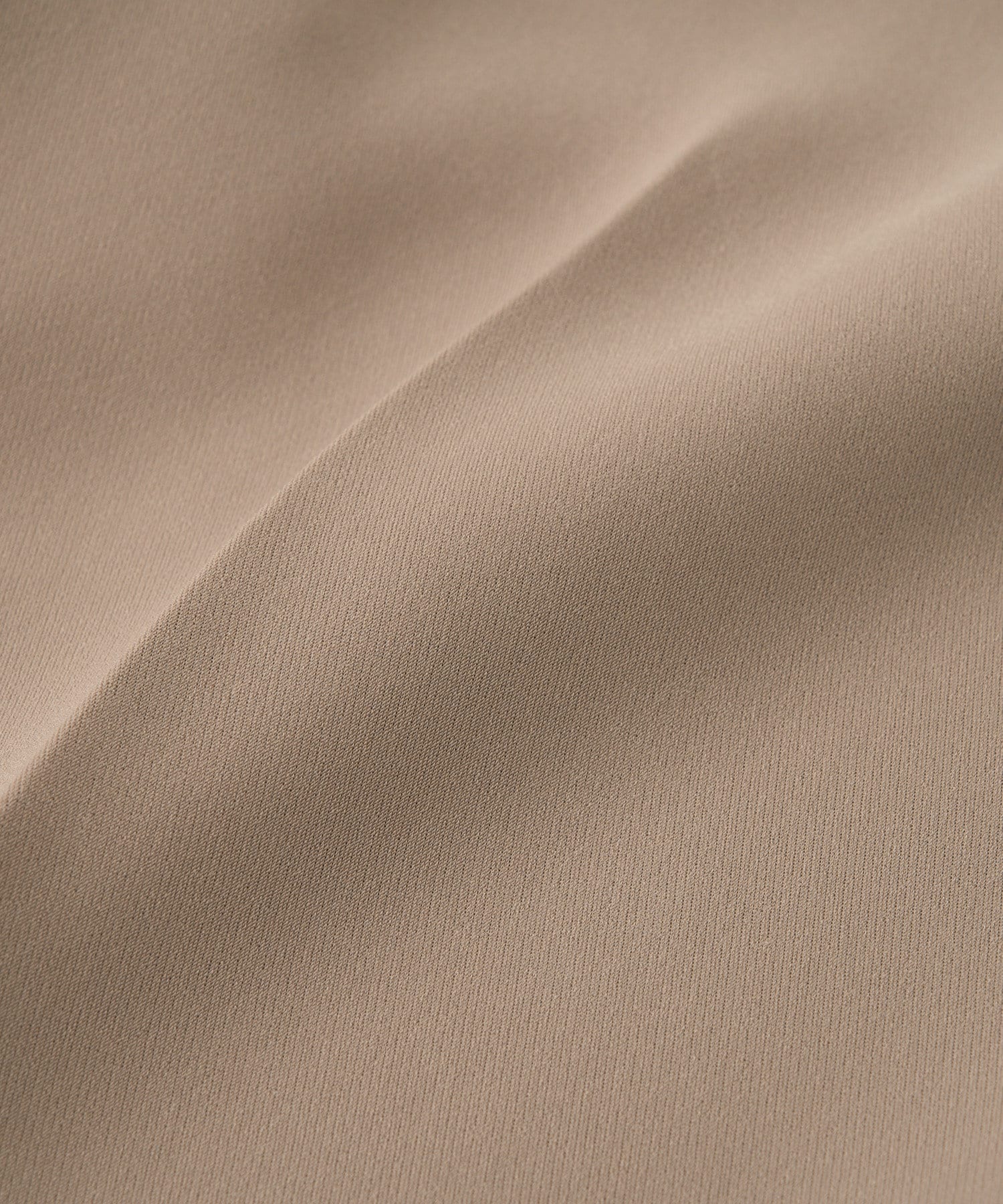 ポリエステル素材を使用しており、程よく厚みのある生地感で、落ち感はありますがラインを拾いすぎずすっきり見えしてくれます。