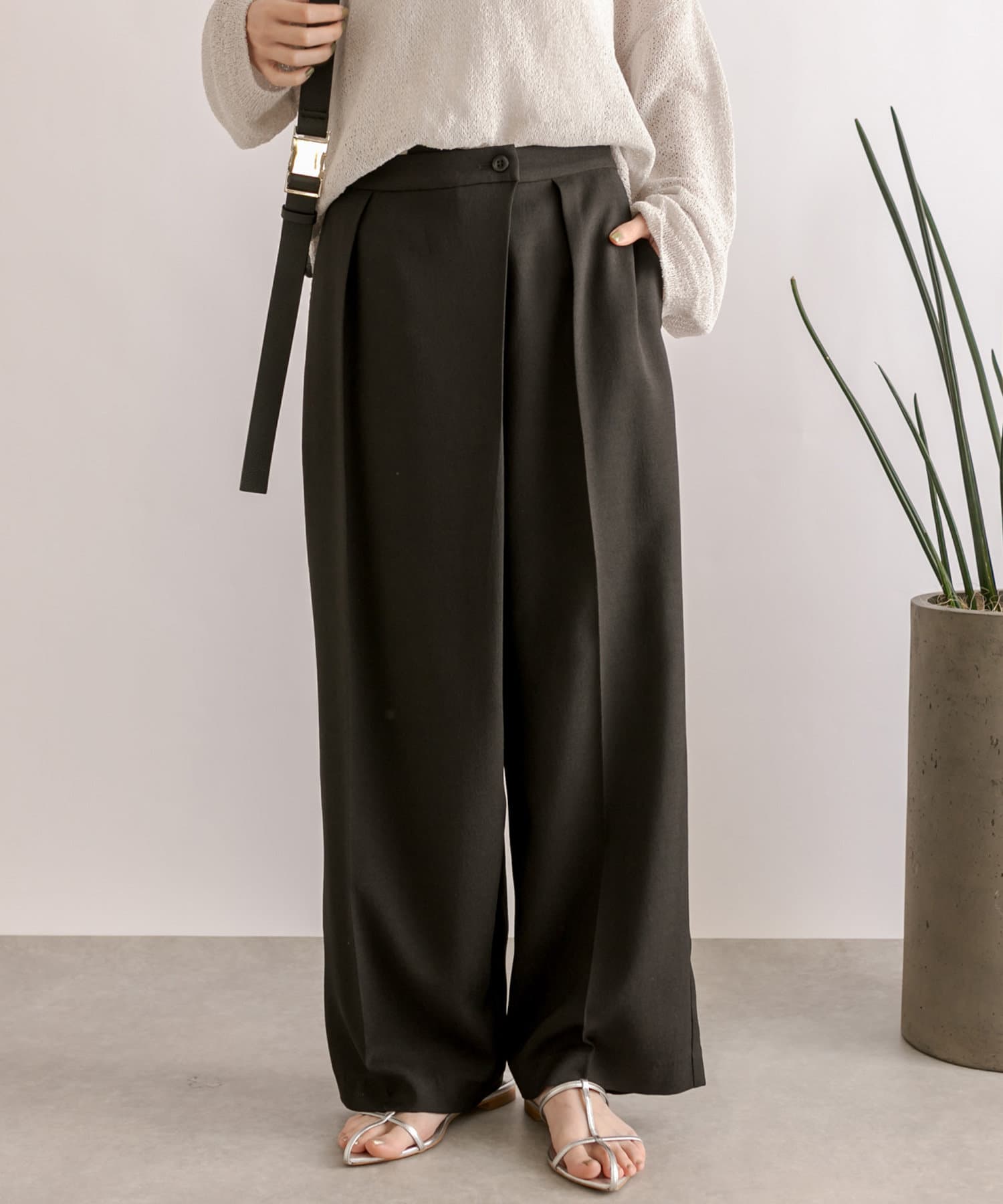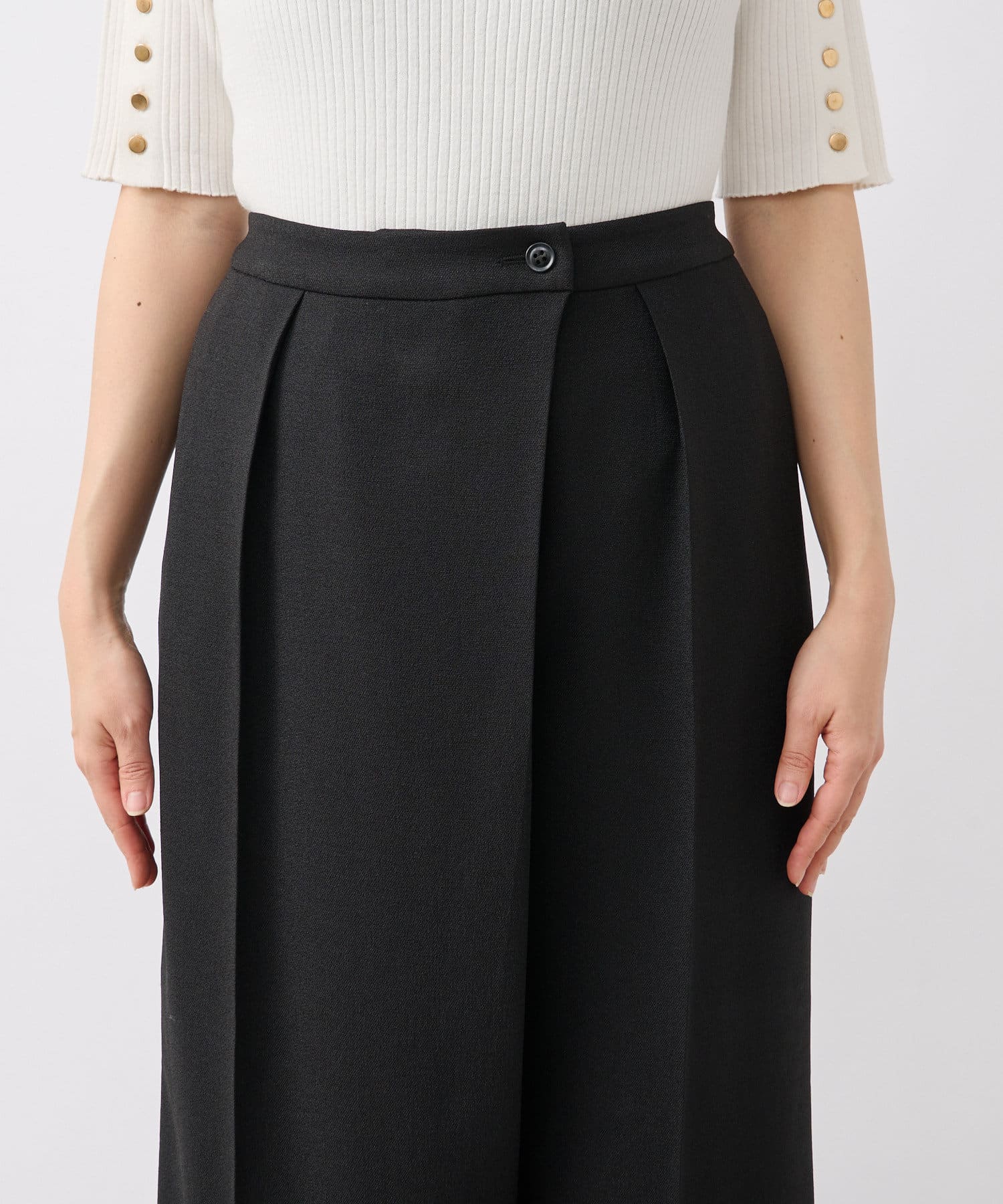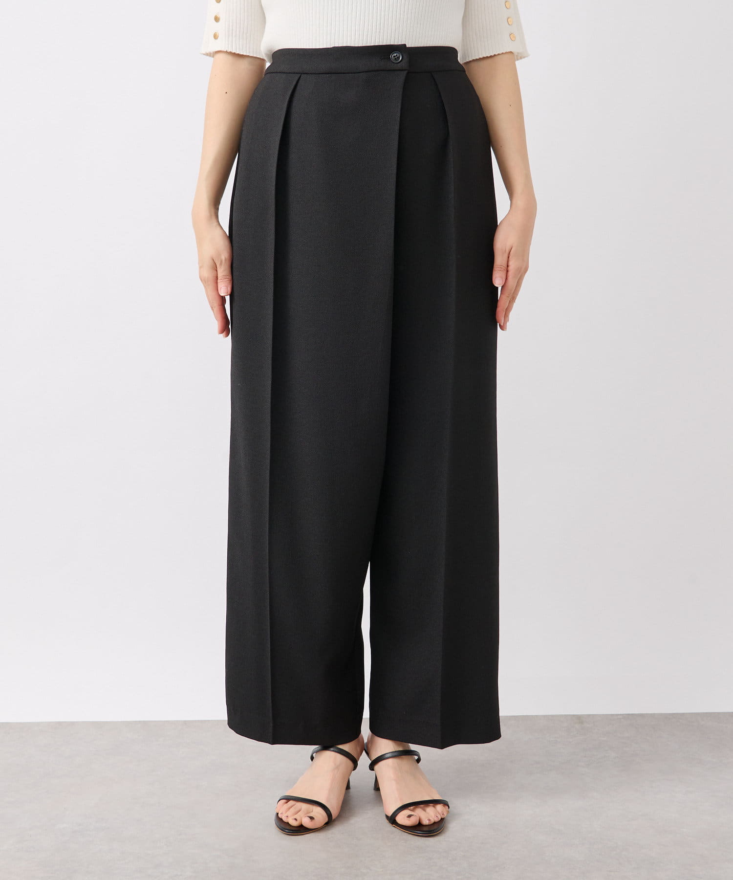 前身頃が重なったラップデザインが目を惹くスラックス。