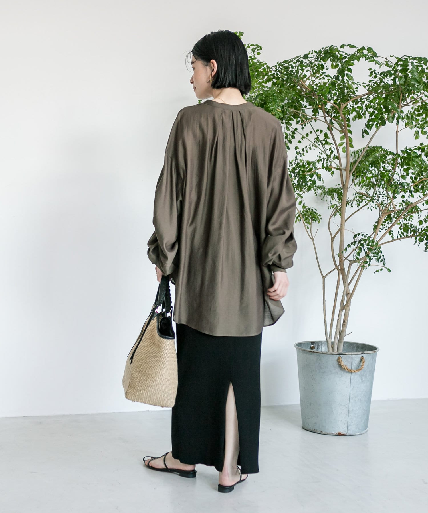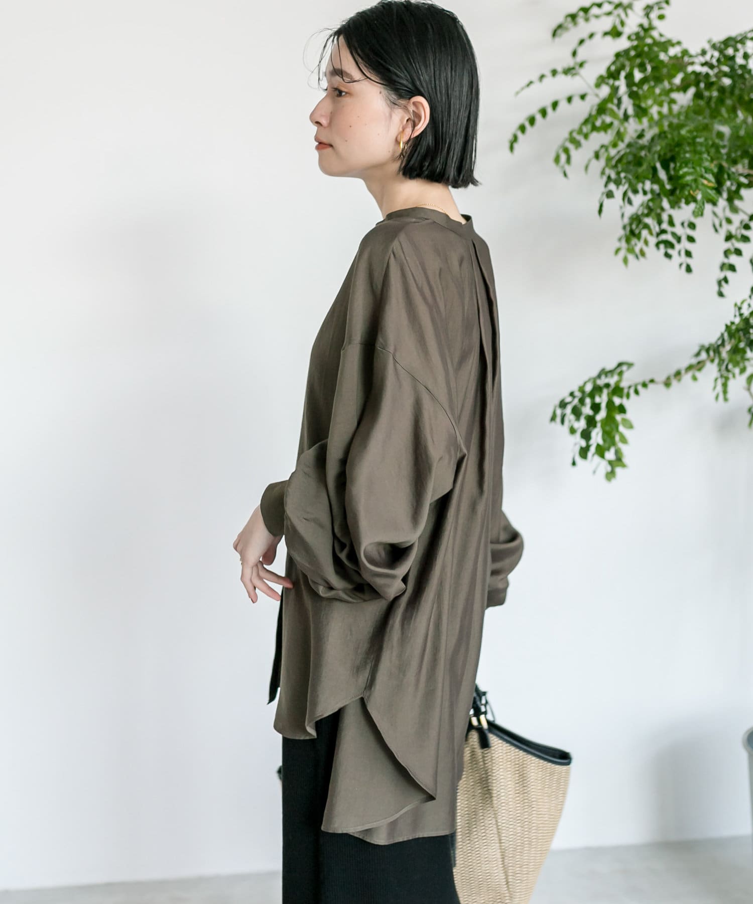 肌当たりのいい滑らかな素材が素肌に心地良いブラウス。