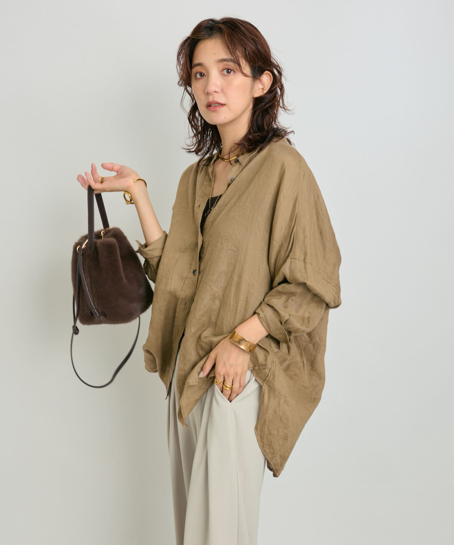購入場所:店舗クリームでもベージュでもない濃いめの色合いが何にでも合うシャツなので、これから、羽織りとしても一枚でもスタイリングが決まりそうです。
