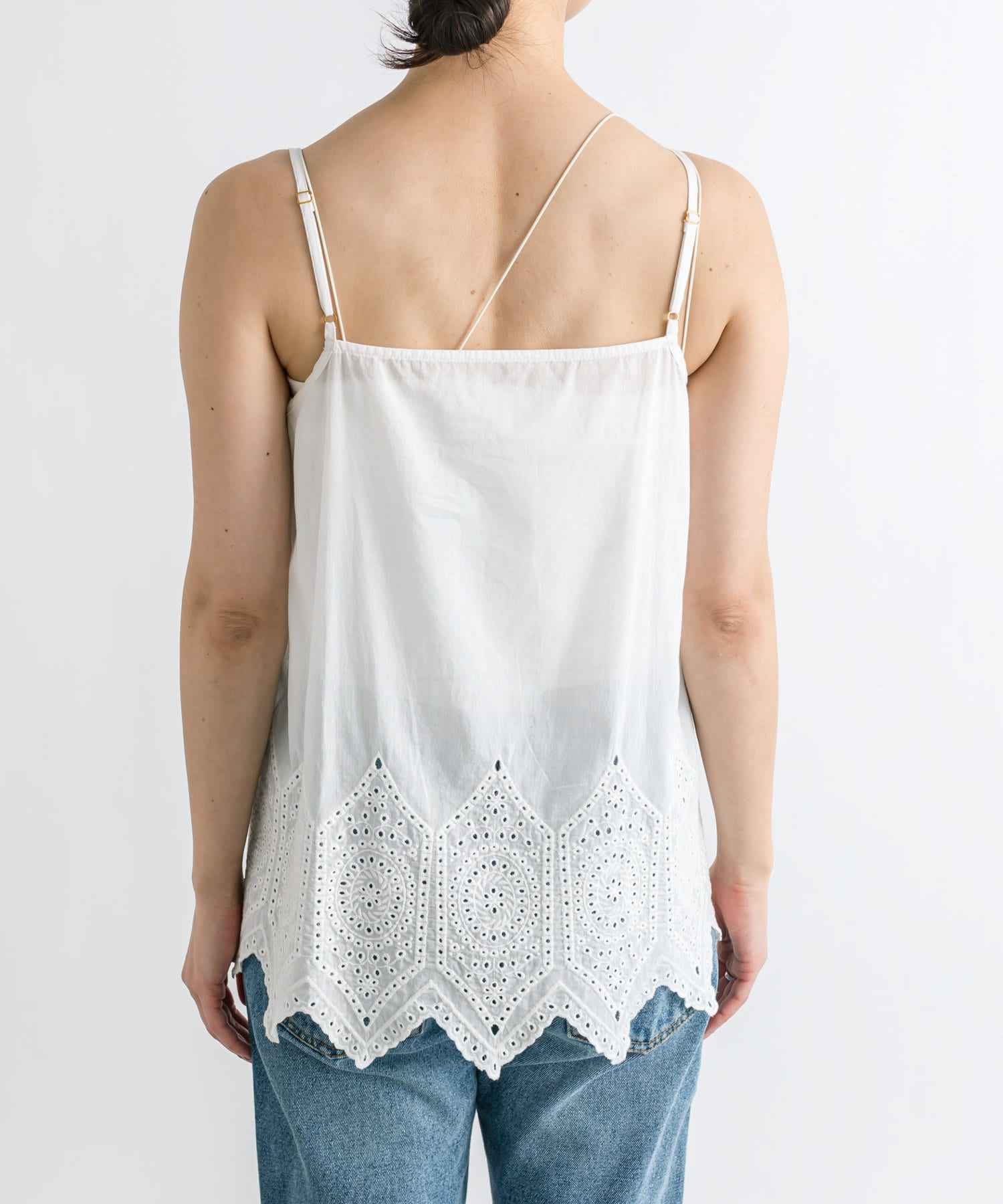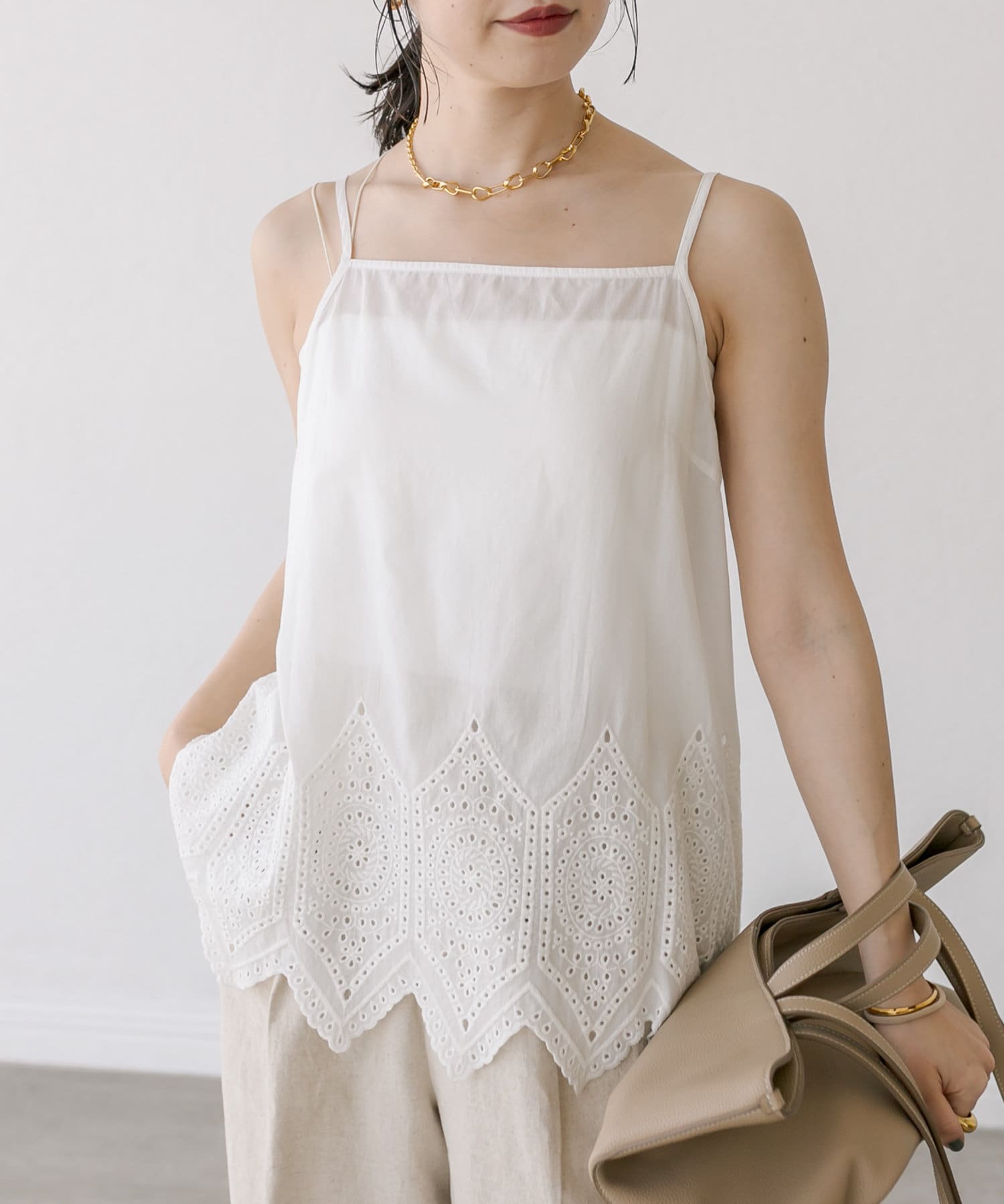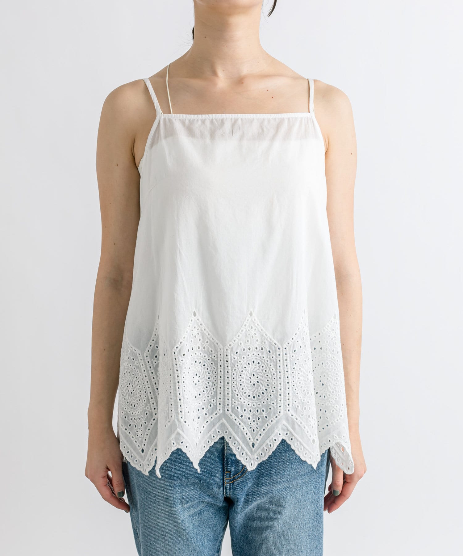 タイル調のレーシーな刺繍がポイントのキャミソールブラウス。