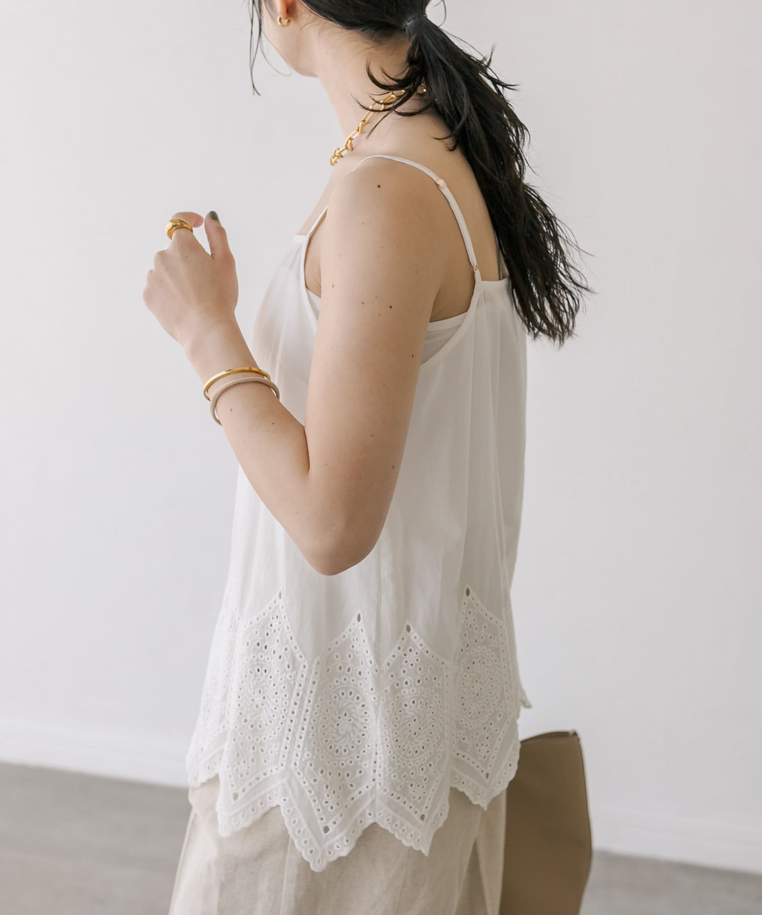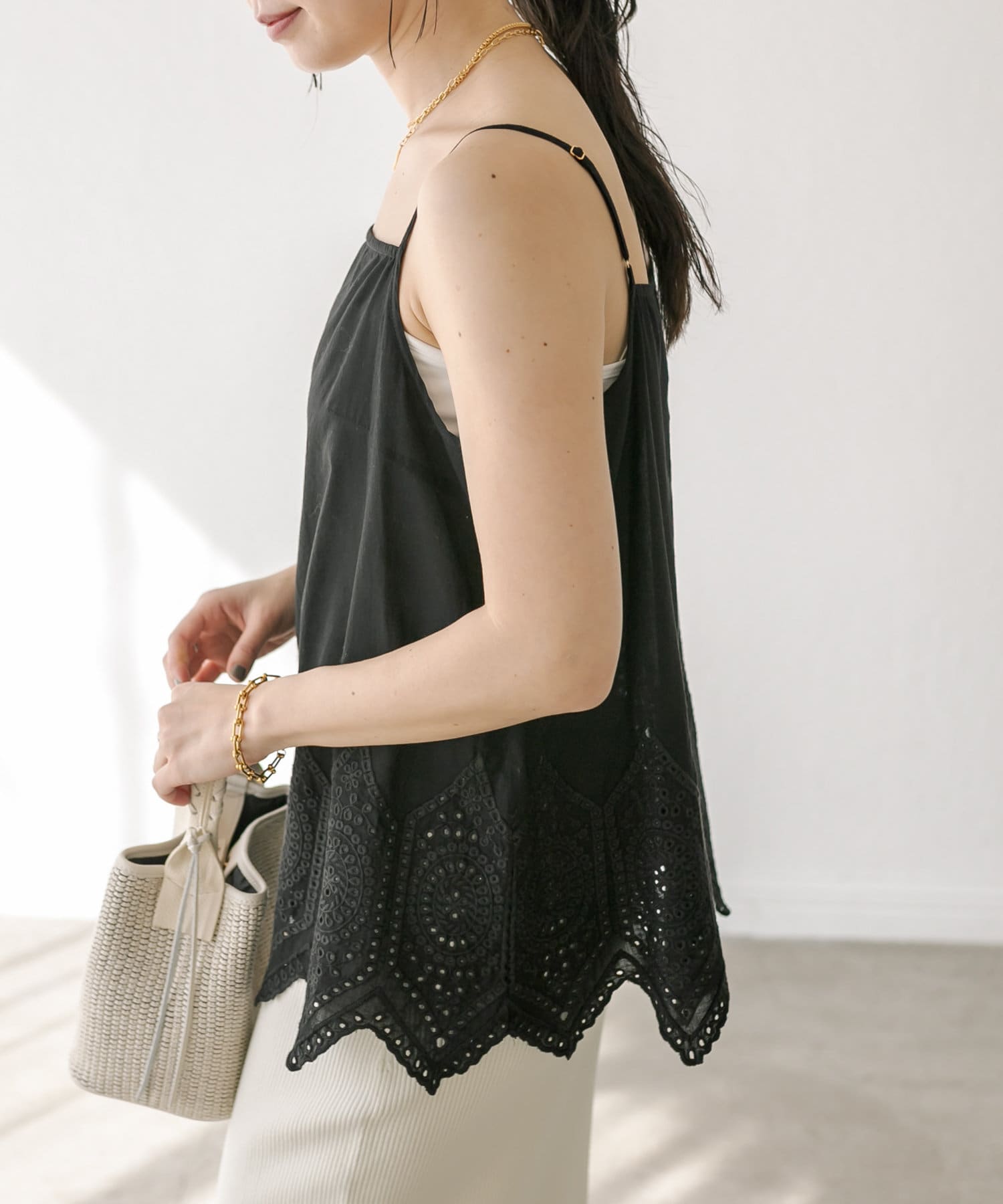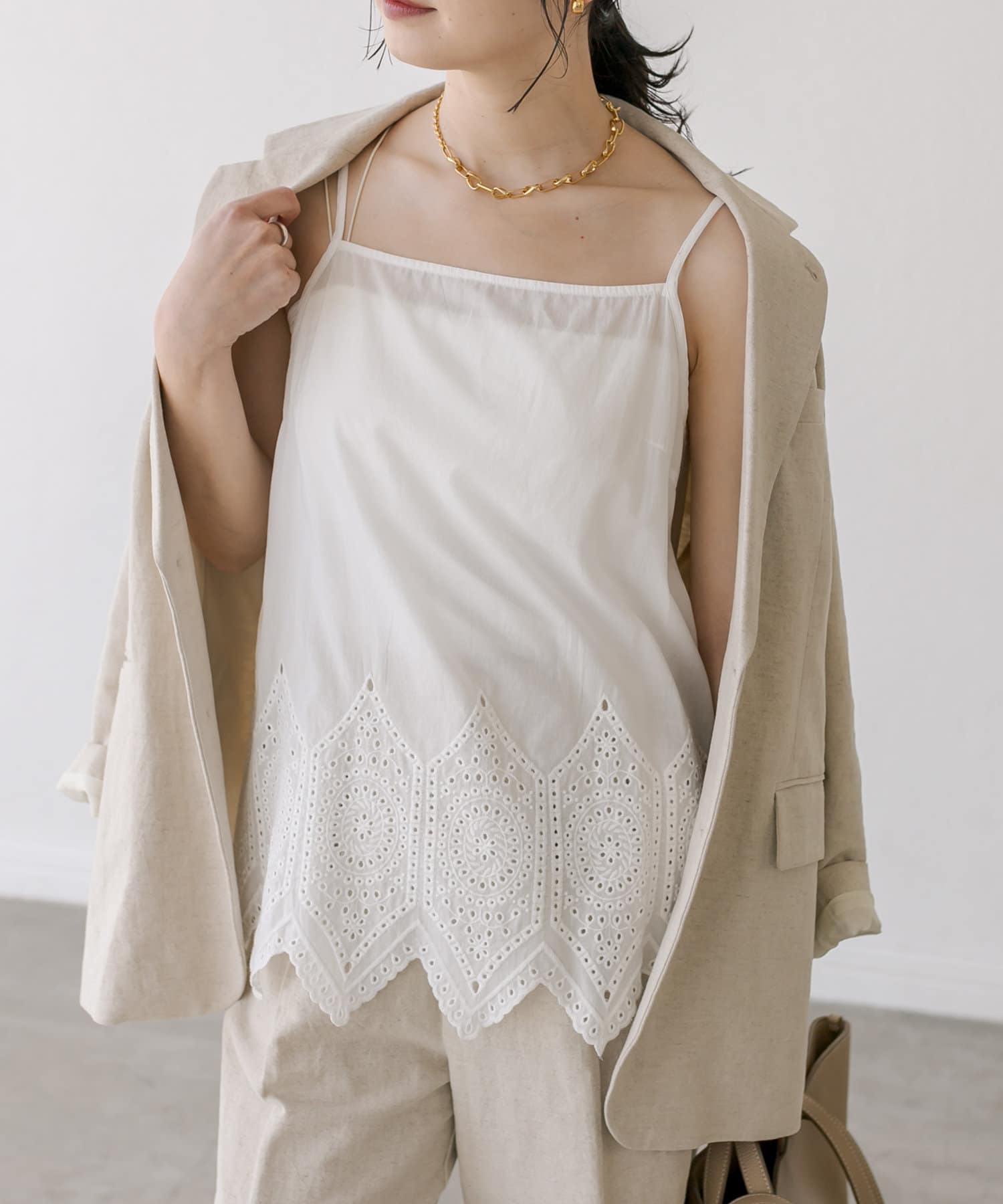 タイル調のレーシーな刺繍がポイントのキャミソールブラウス。