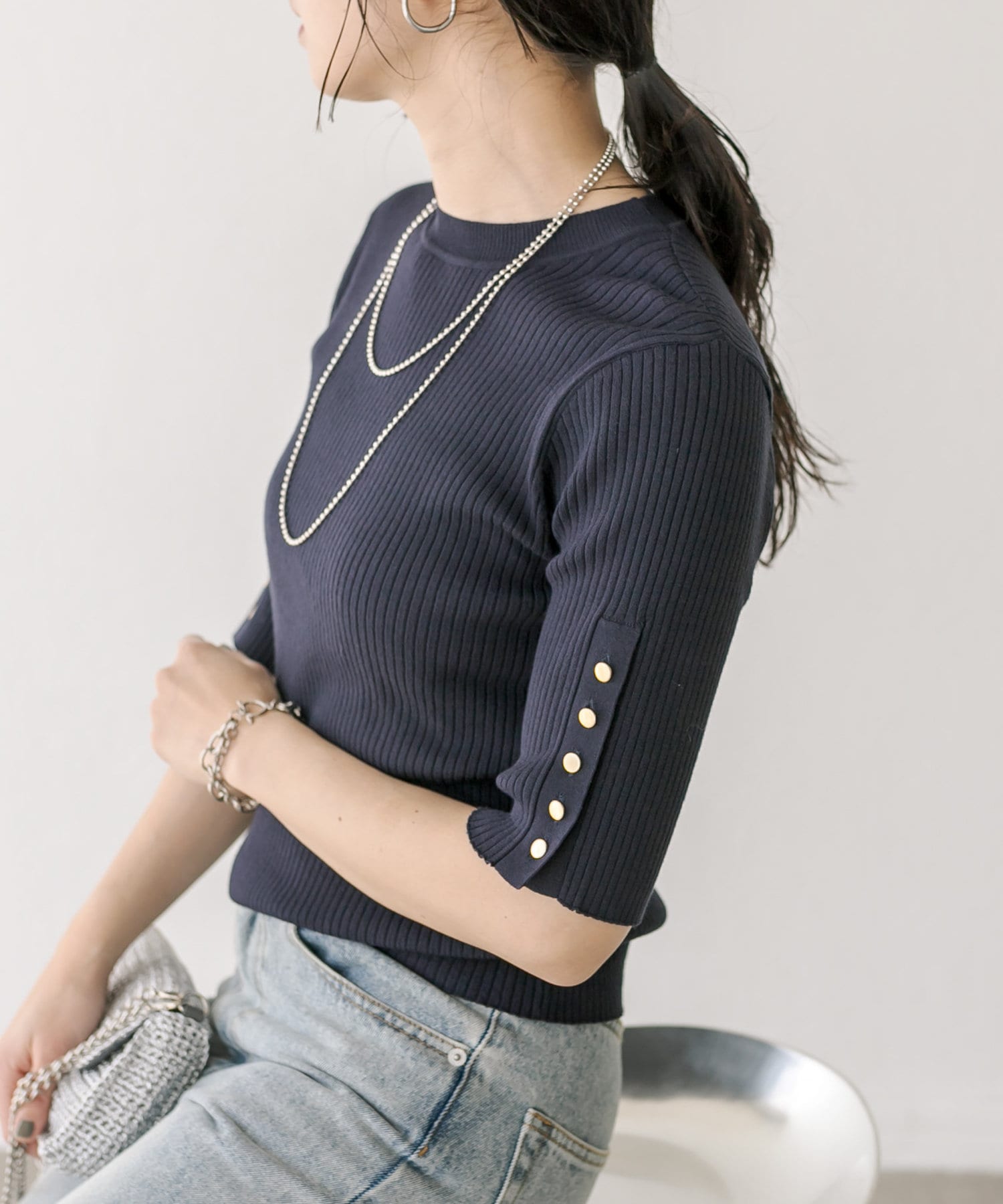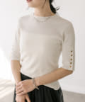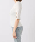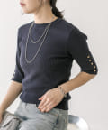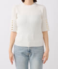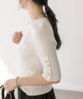 袖口に施されたボタンあきのデザインがアクセントになったニットプルオーバー。