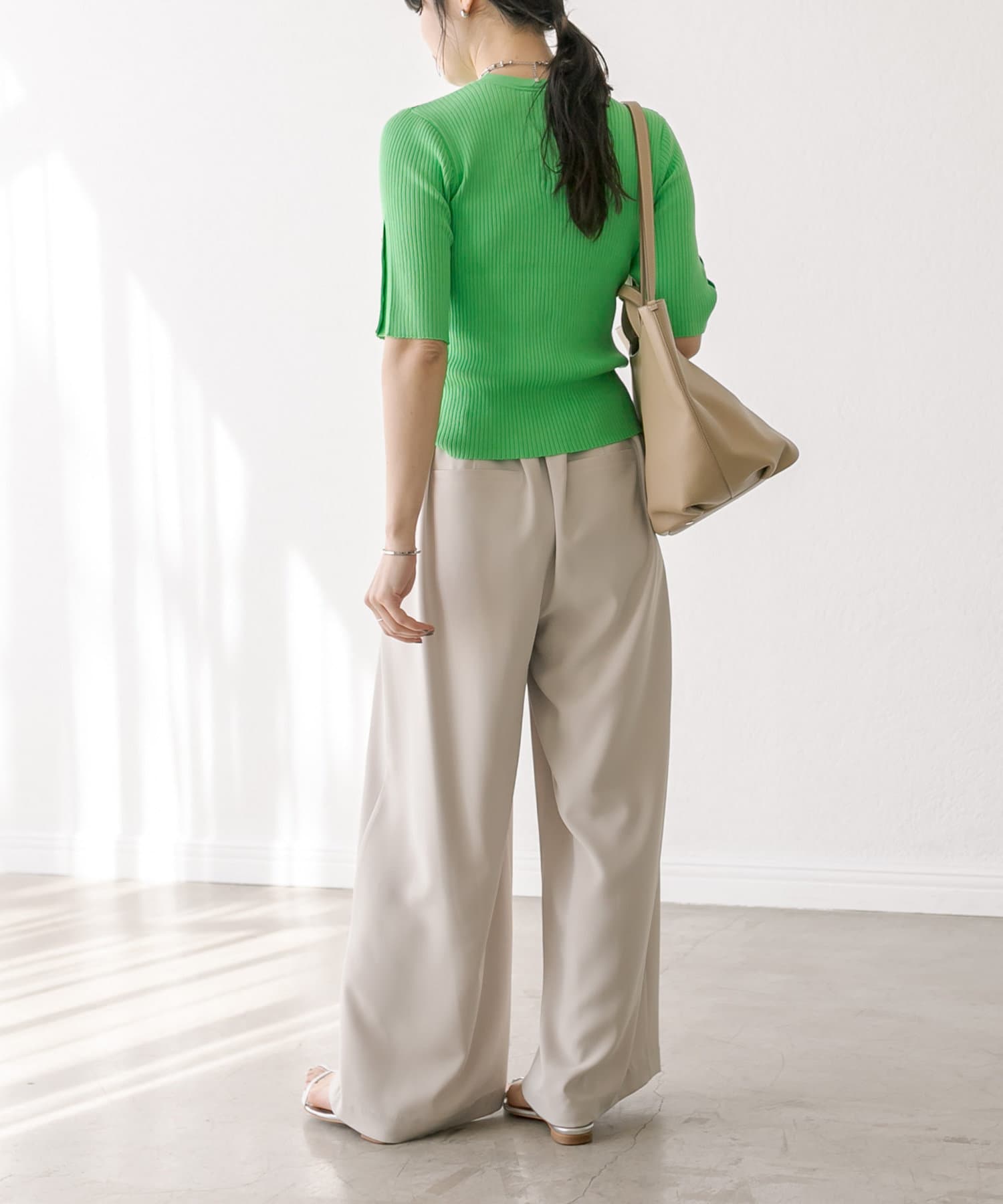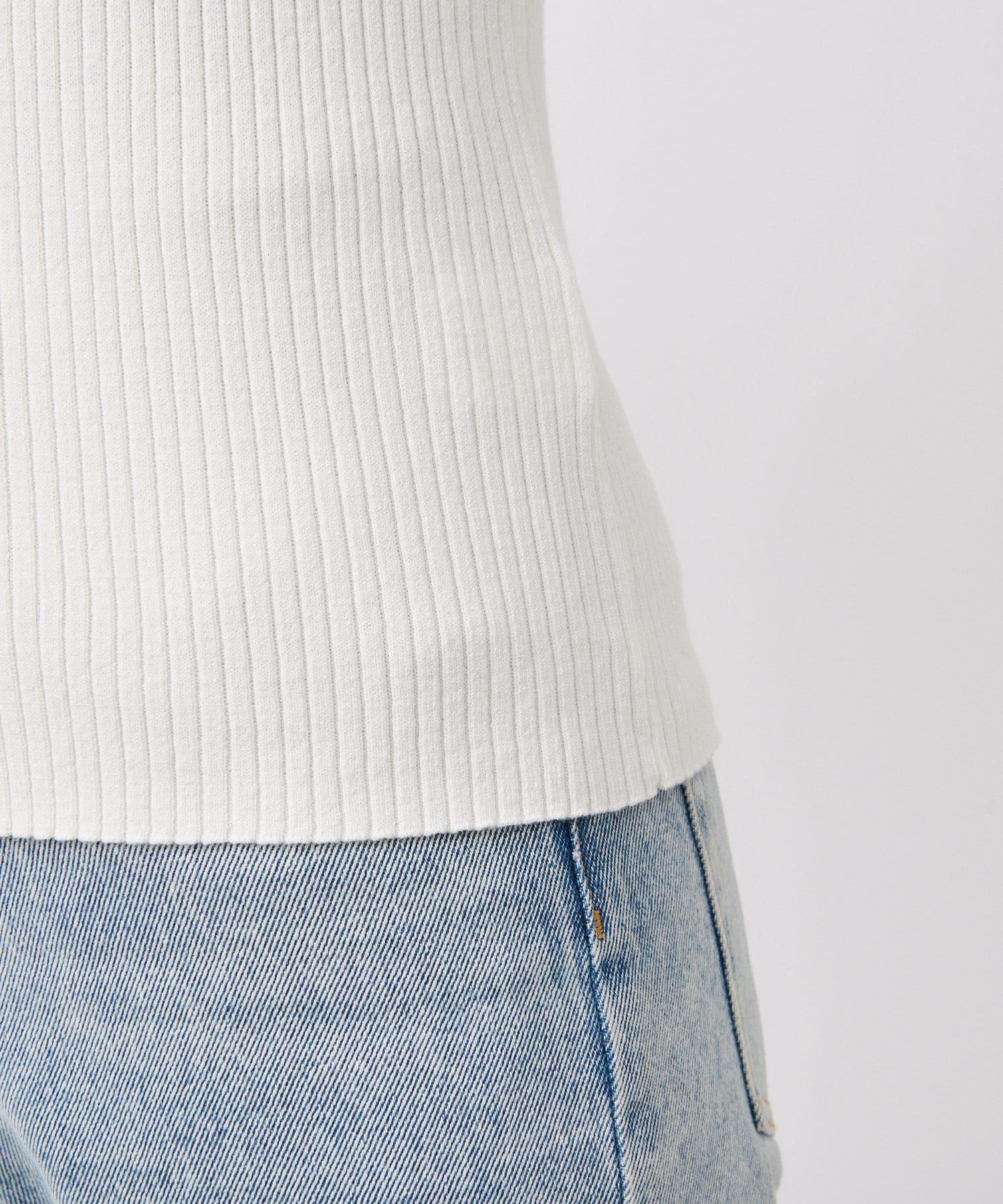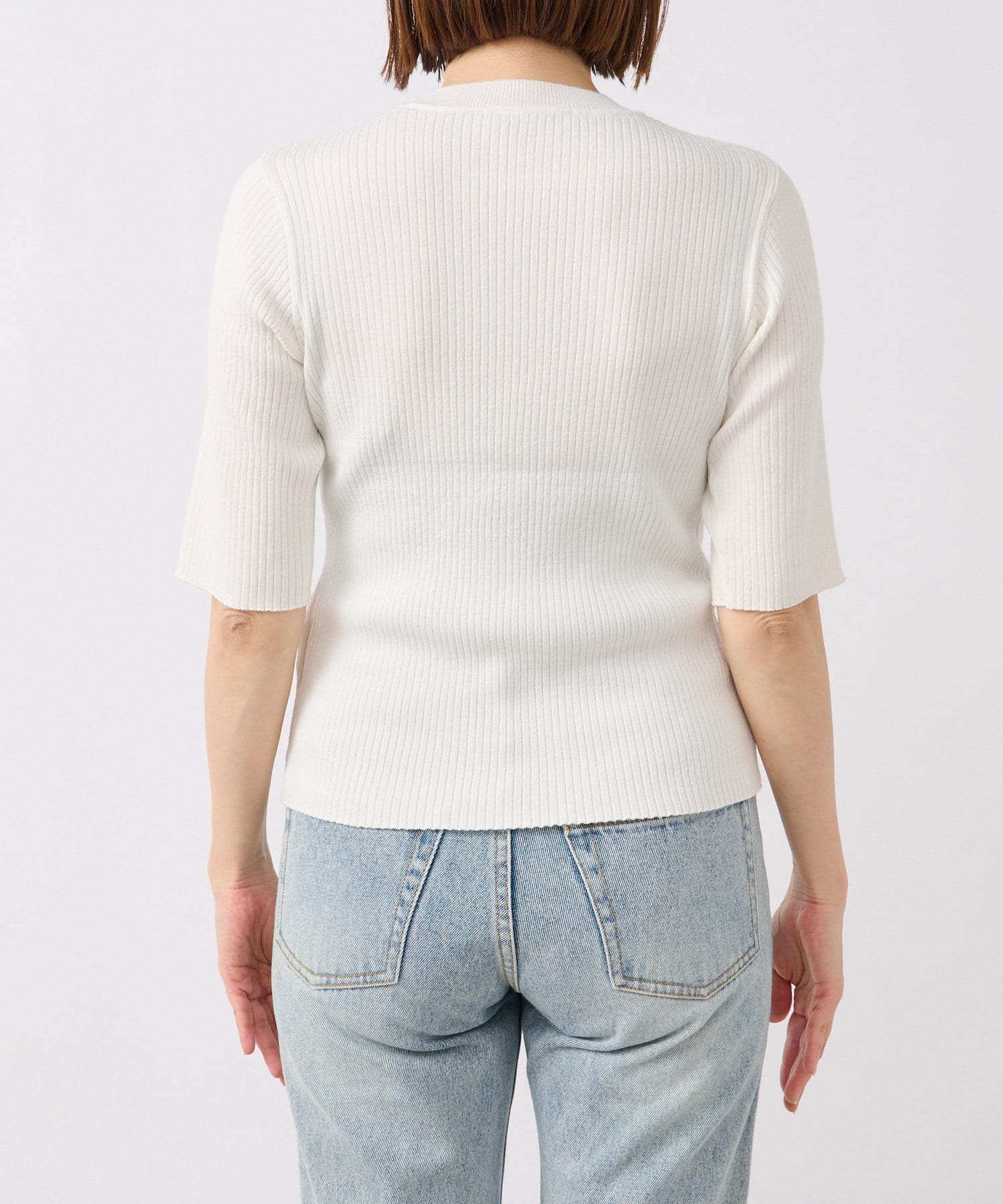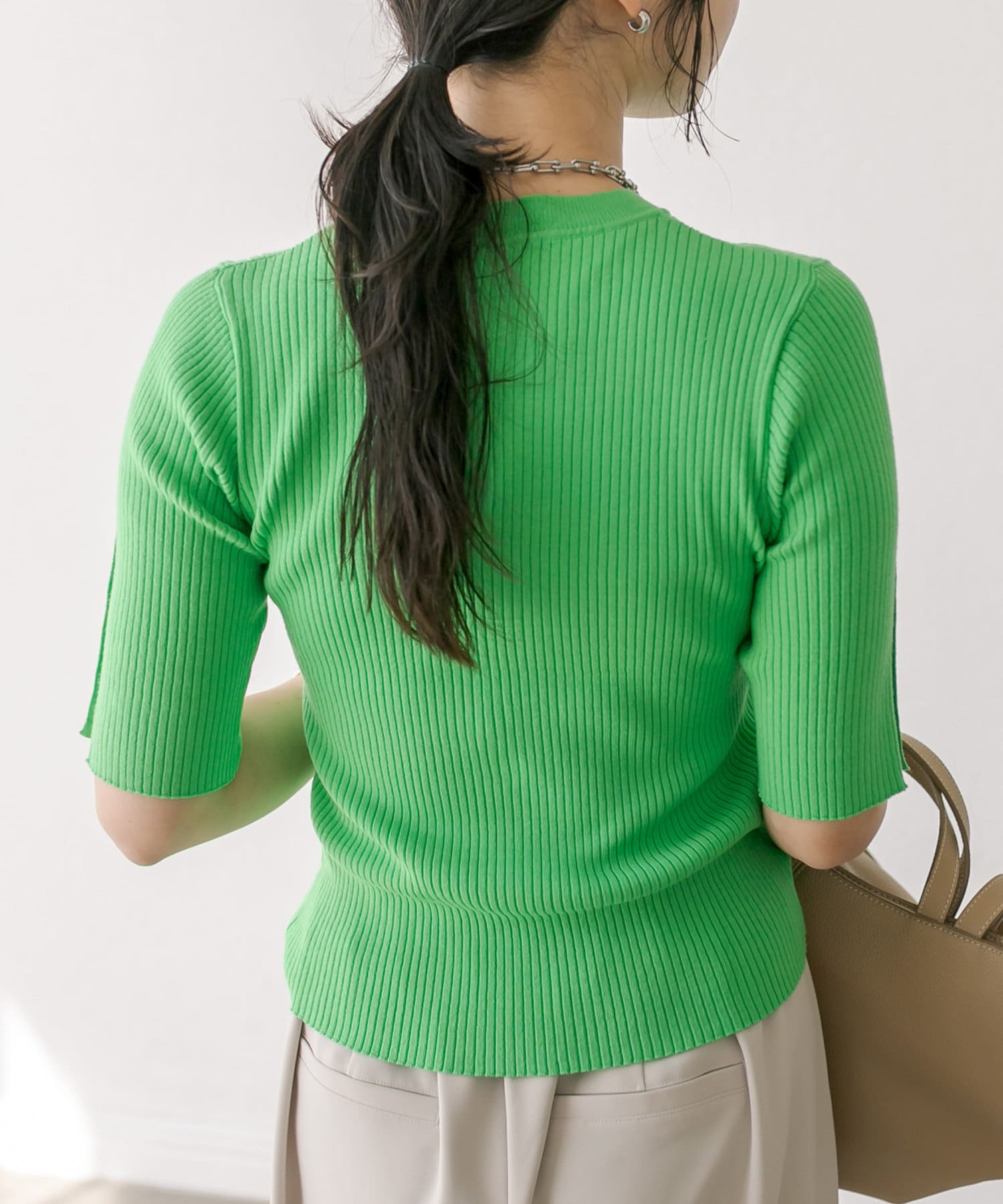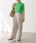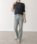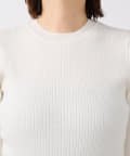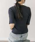 衿元はやや詰まり気味のクルーネックで、インナーの覗きが気にならないのも嬉しいポイント。