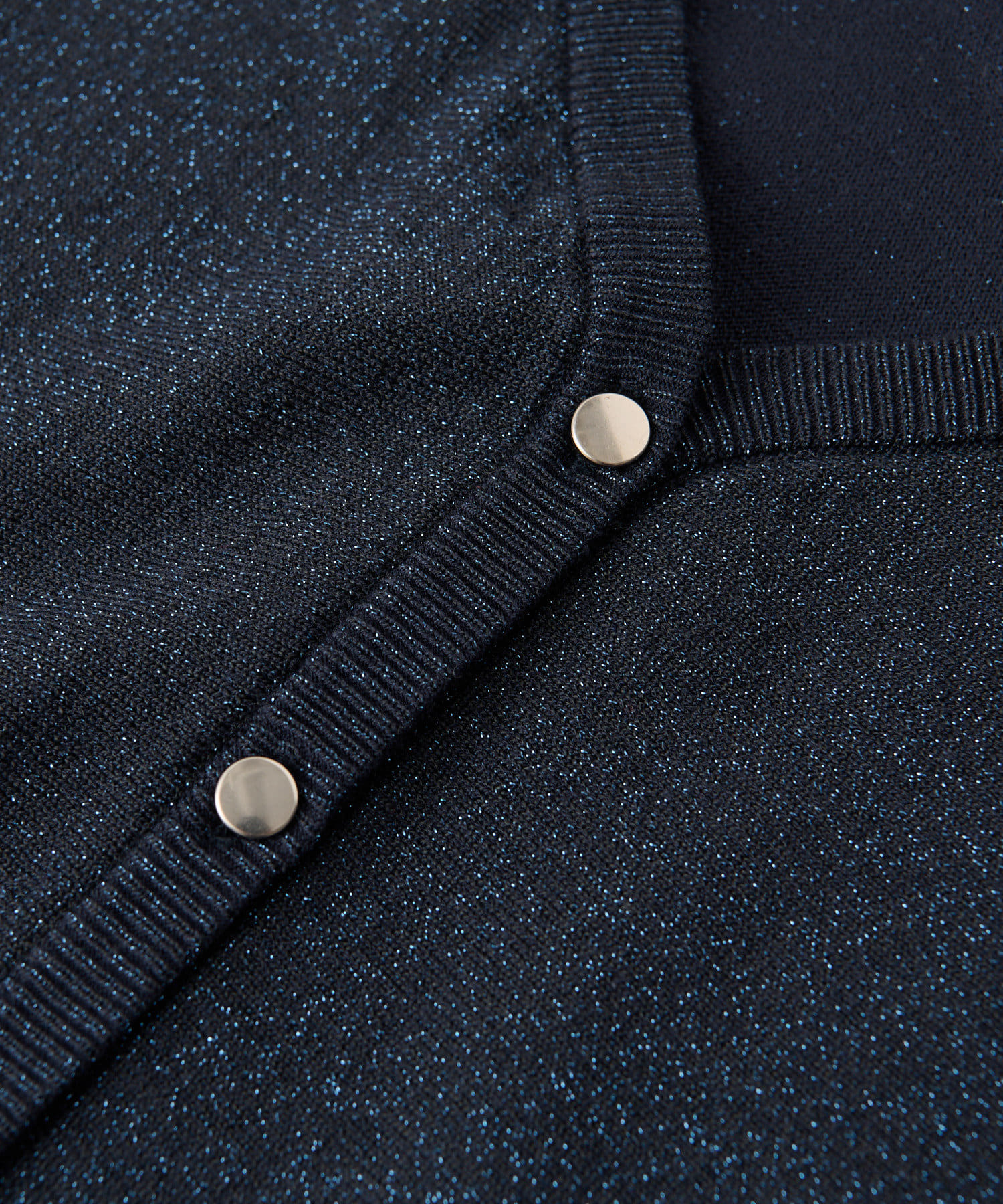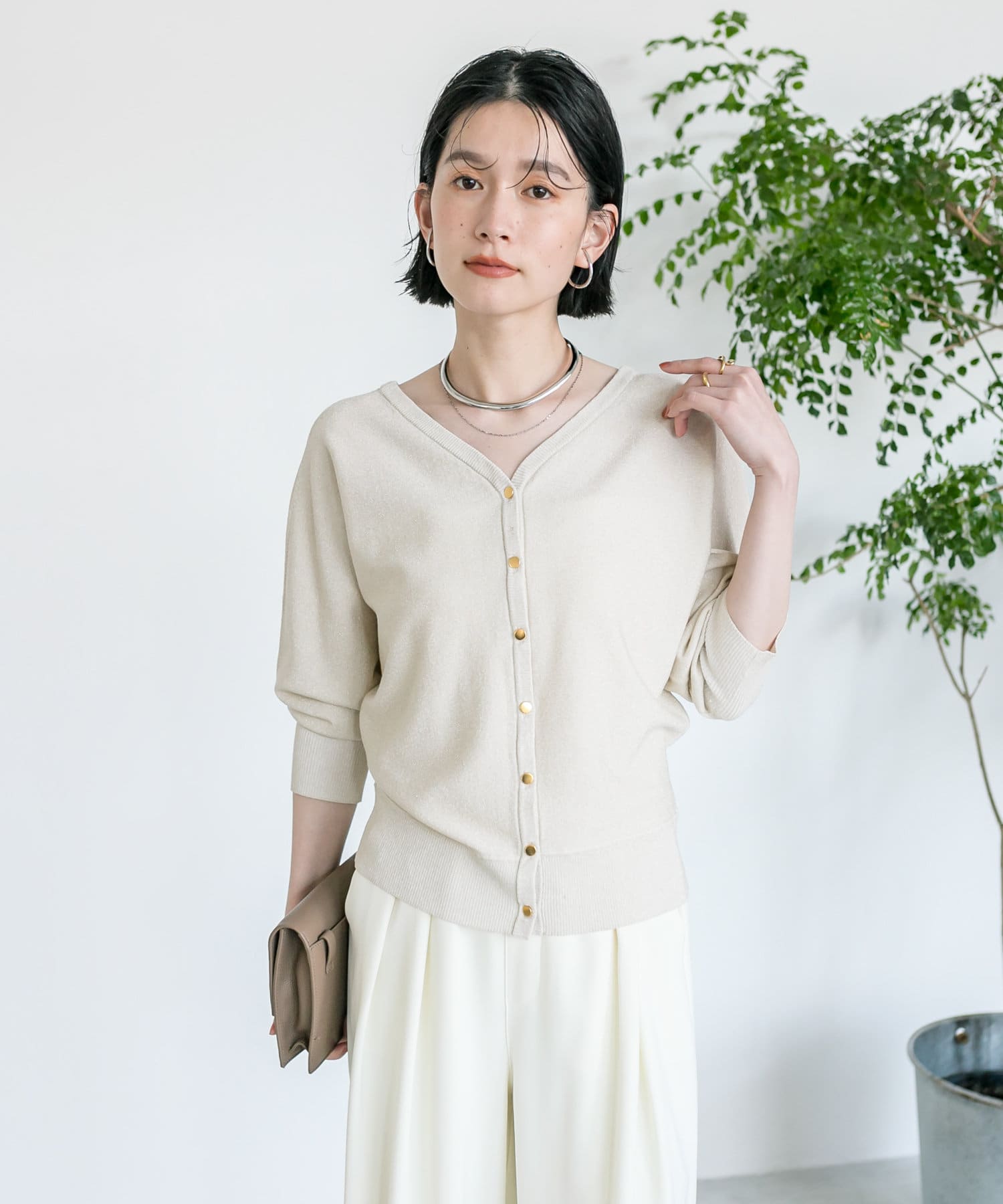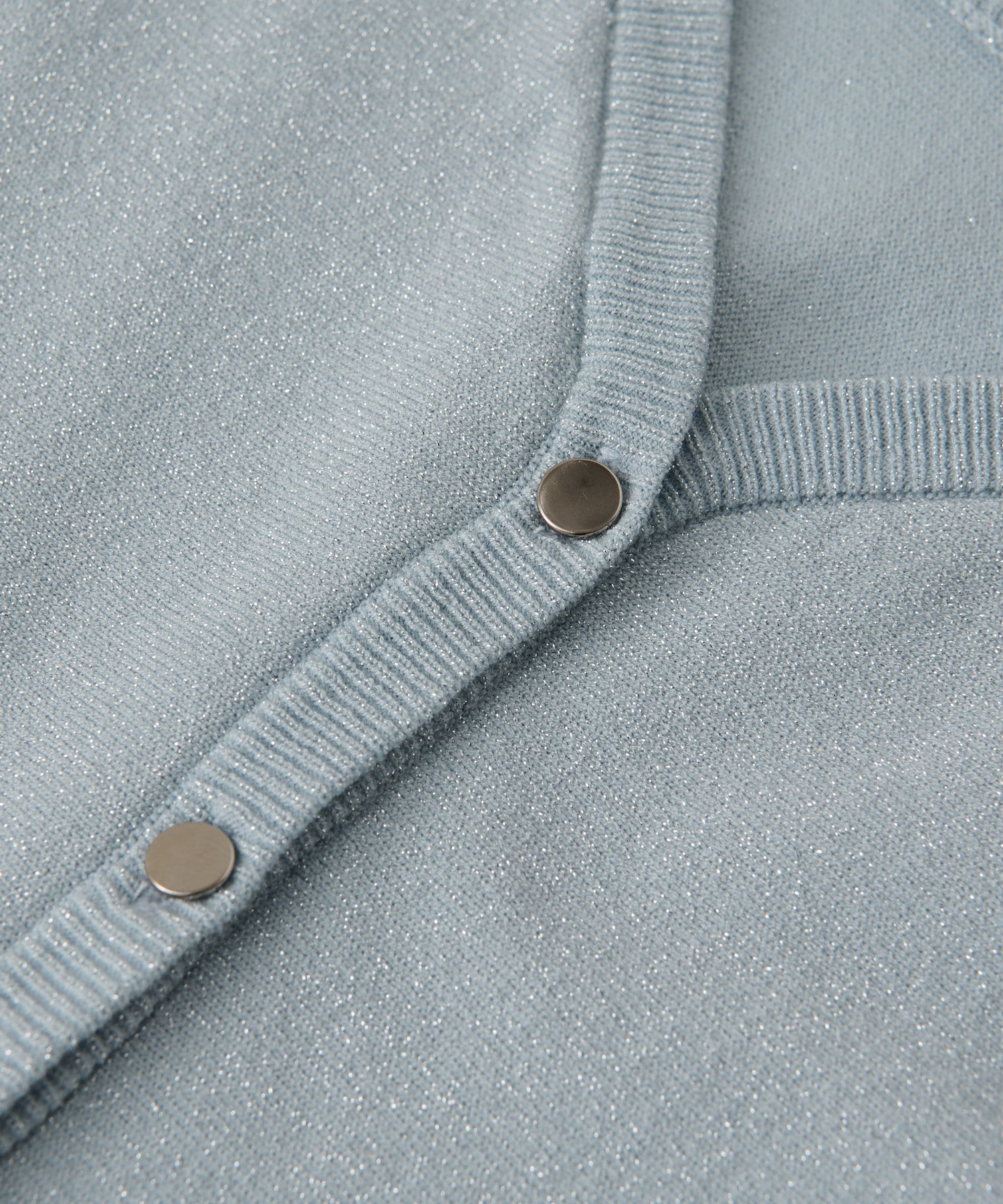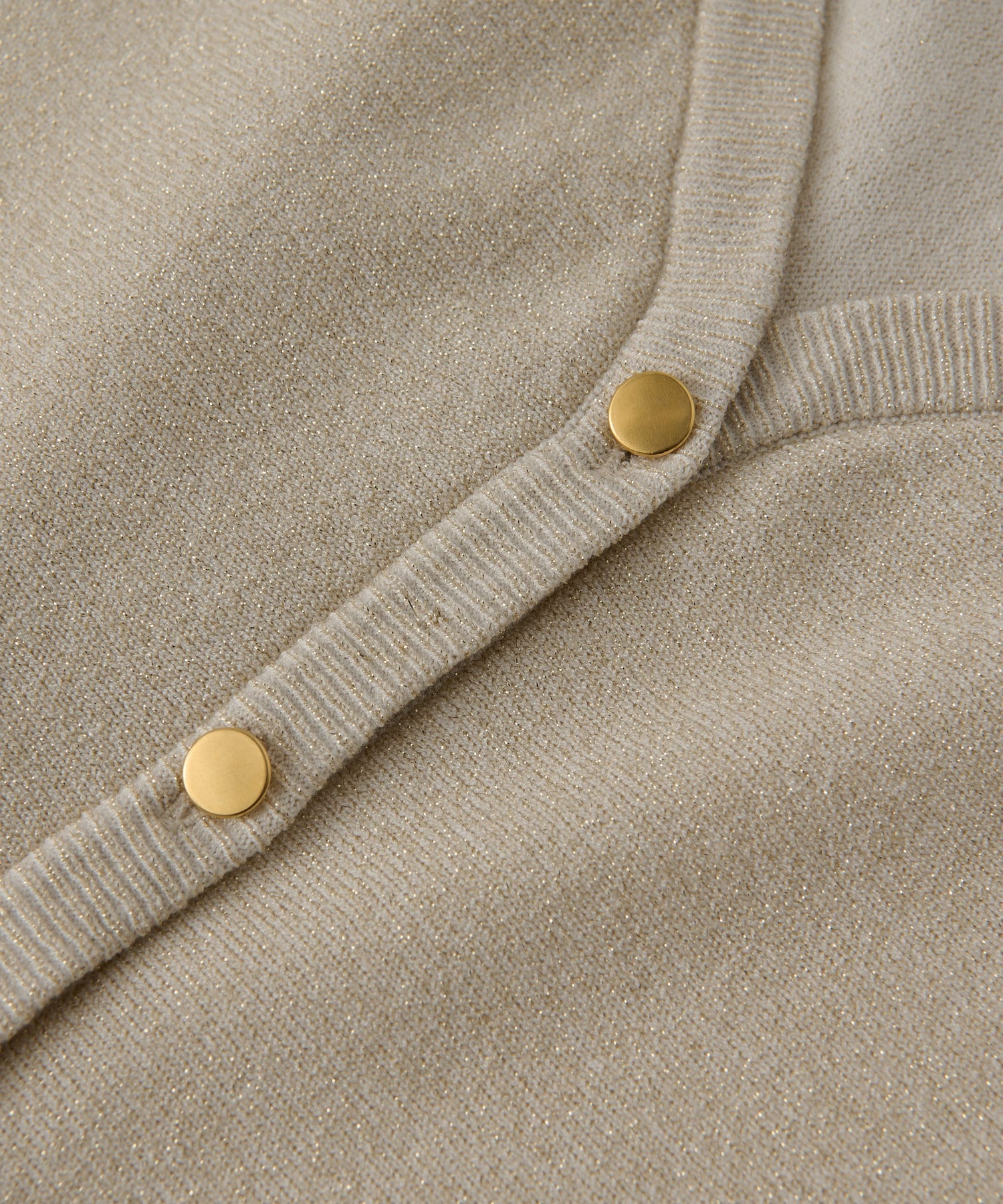 シンプルなデザインですが、ゴールドのボタンやラメ混の素材感が女性らしい華やかさをプラス。