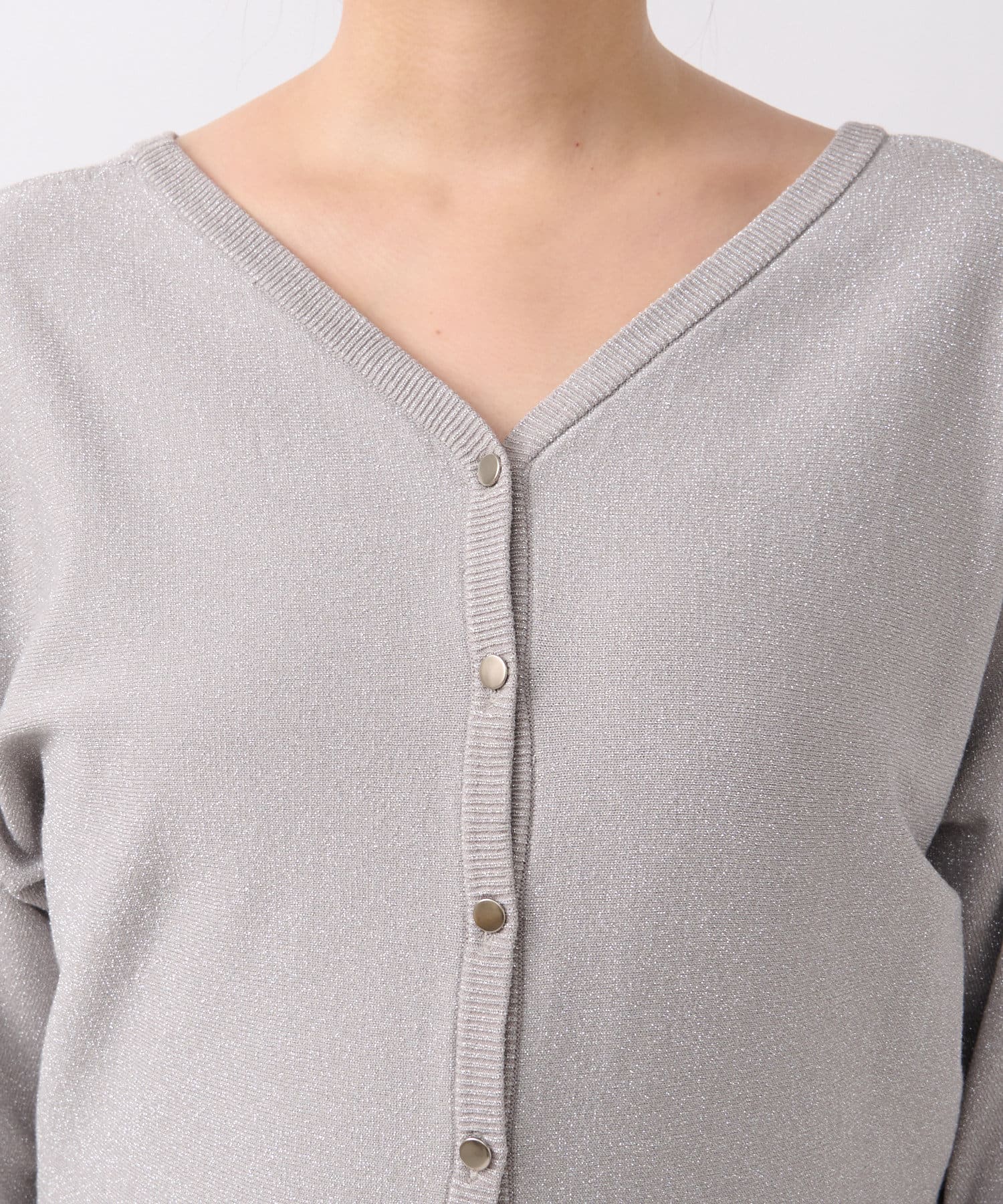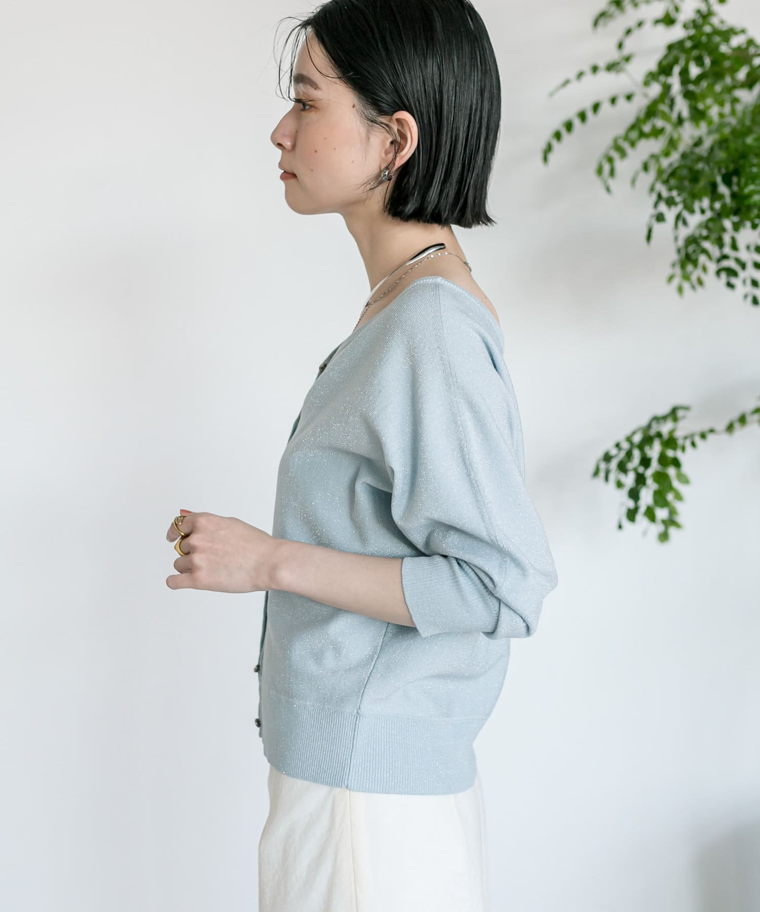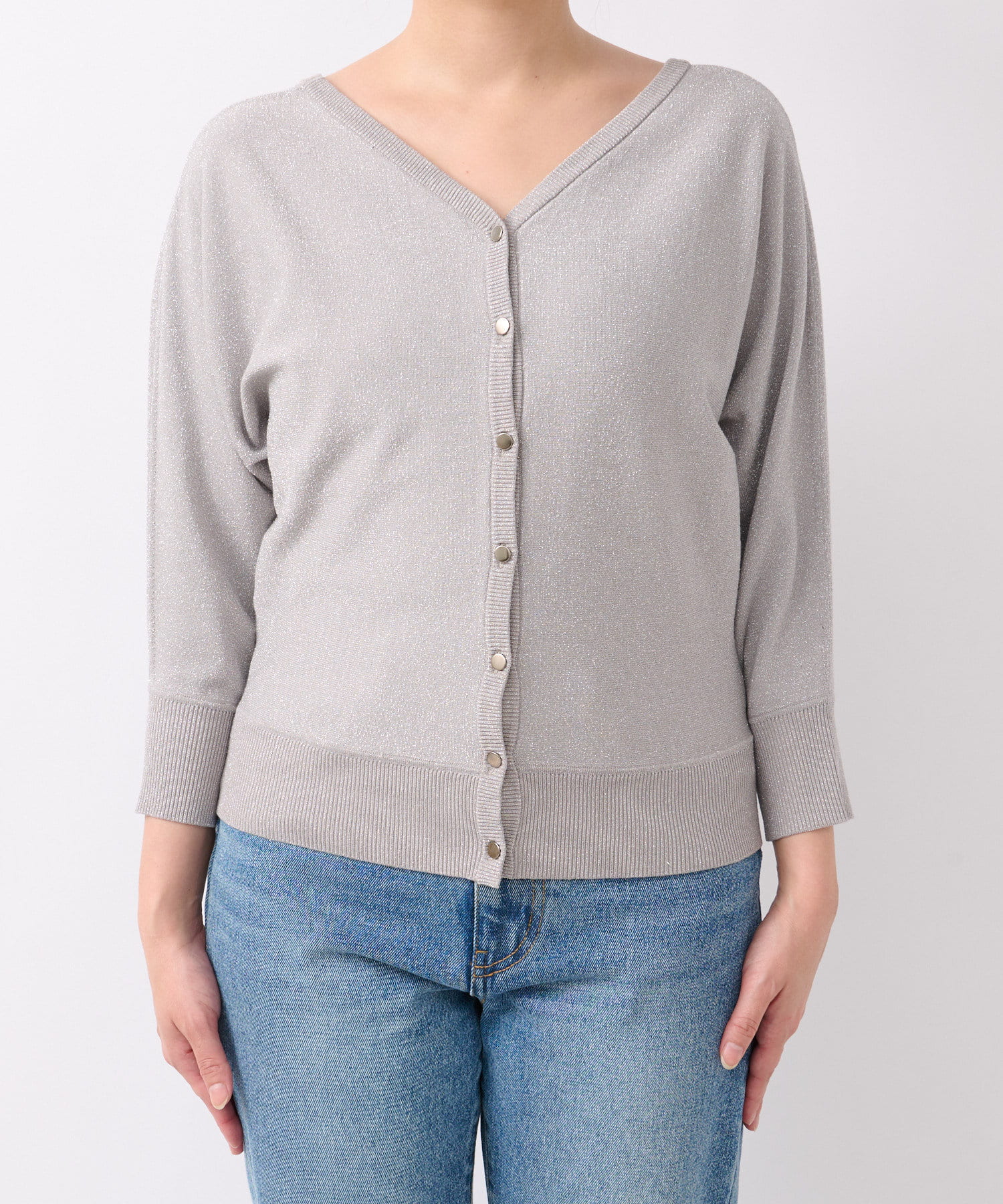 シンプルなデザインですが、ゴールドのボタンやラメ混の素材感が女性らしい華やかさをプラス。