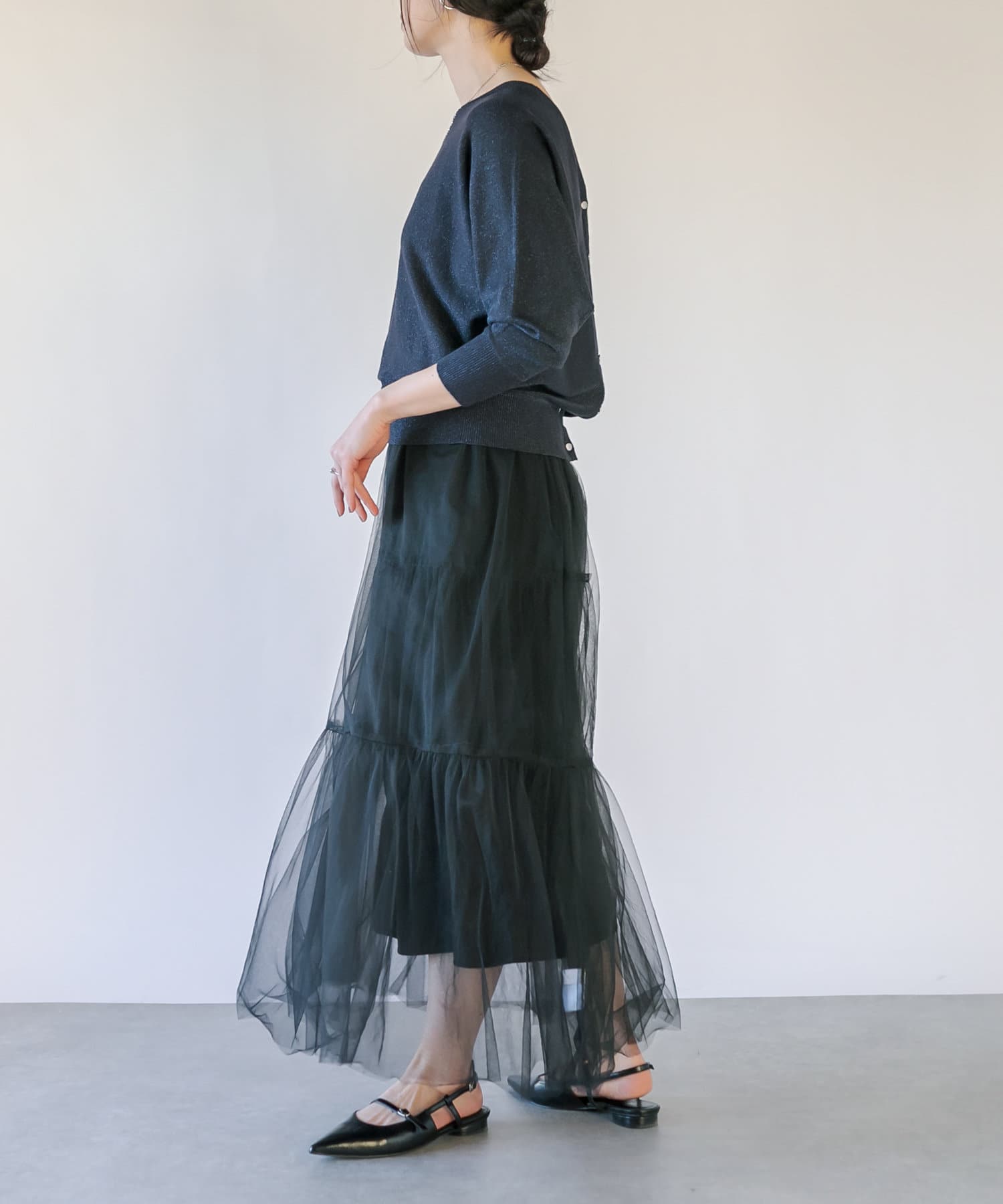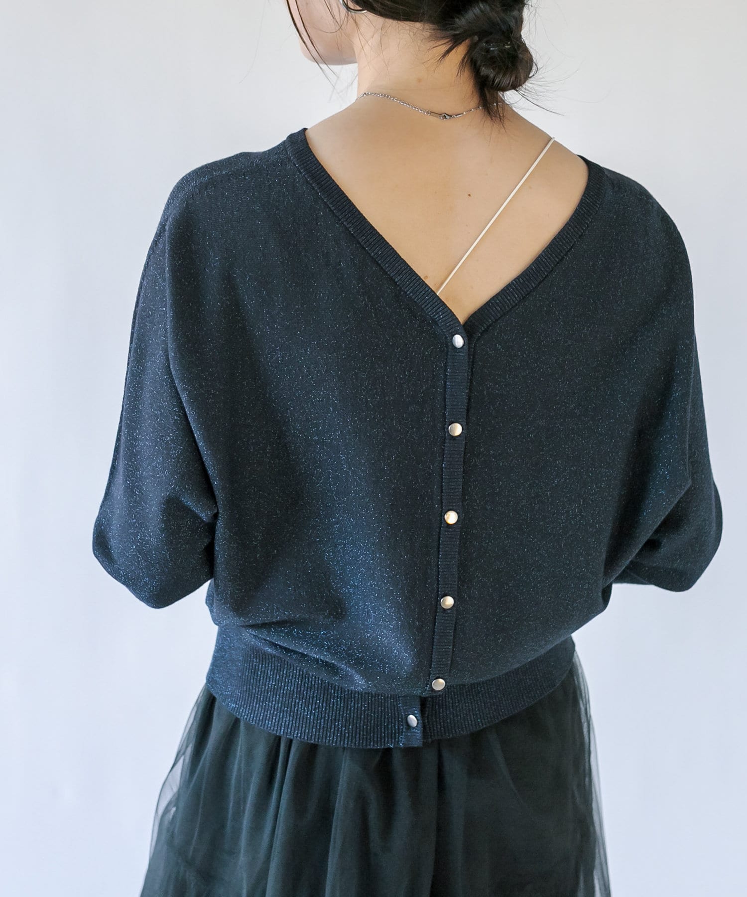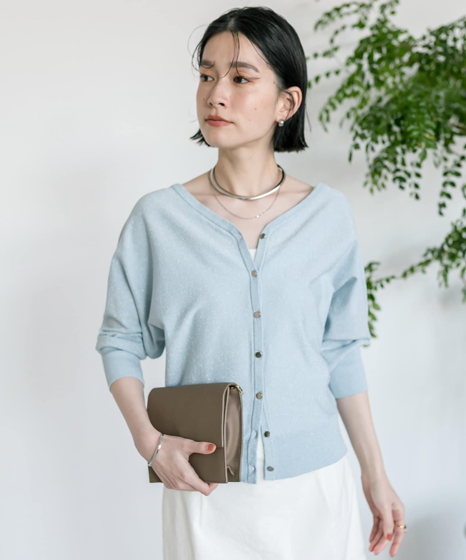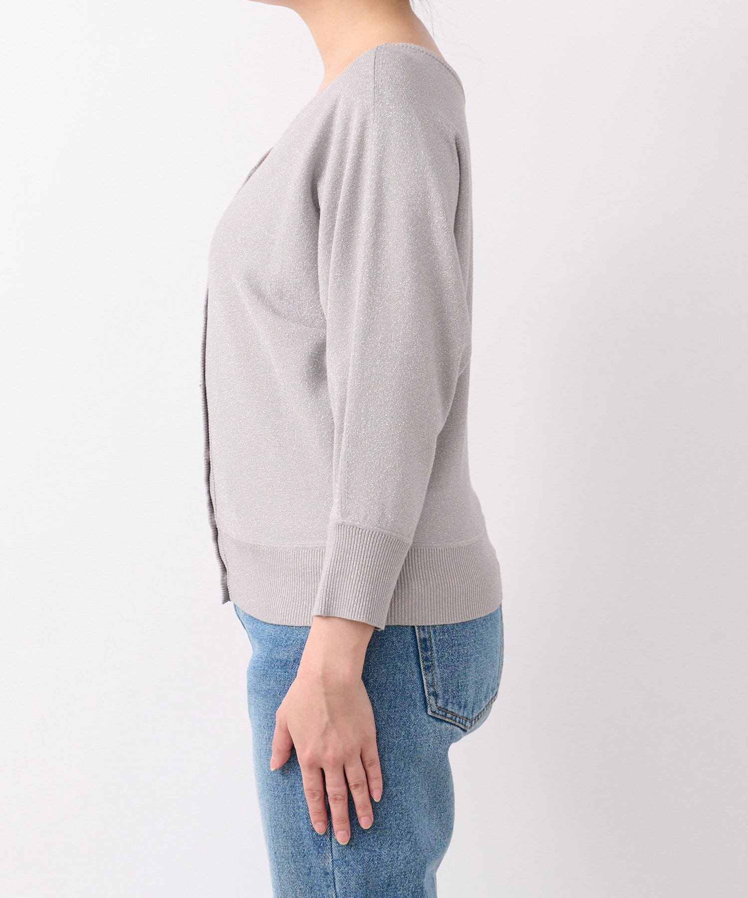 シンプルなデザインですが、ゴールドのボタンやラメ混の素材感が女性らしい華やかさをプラス。