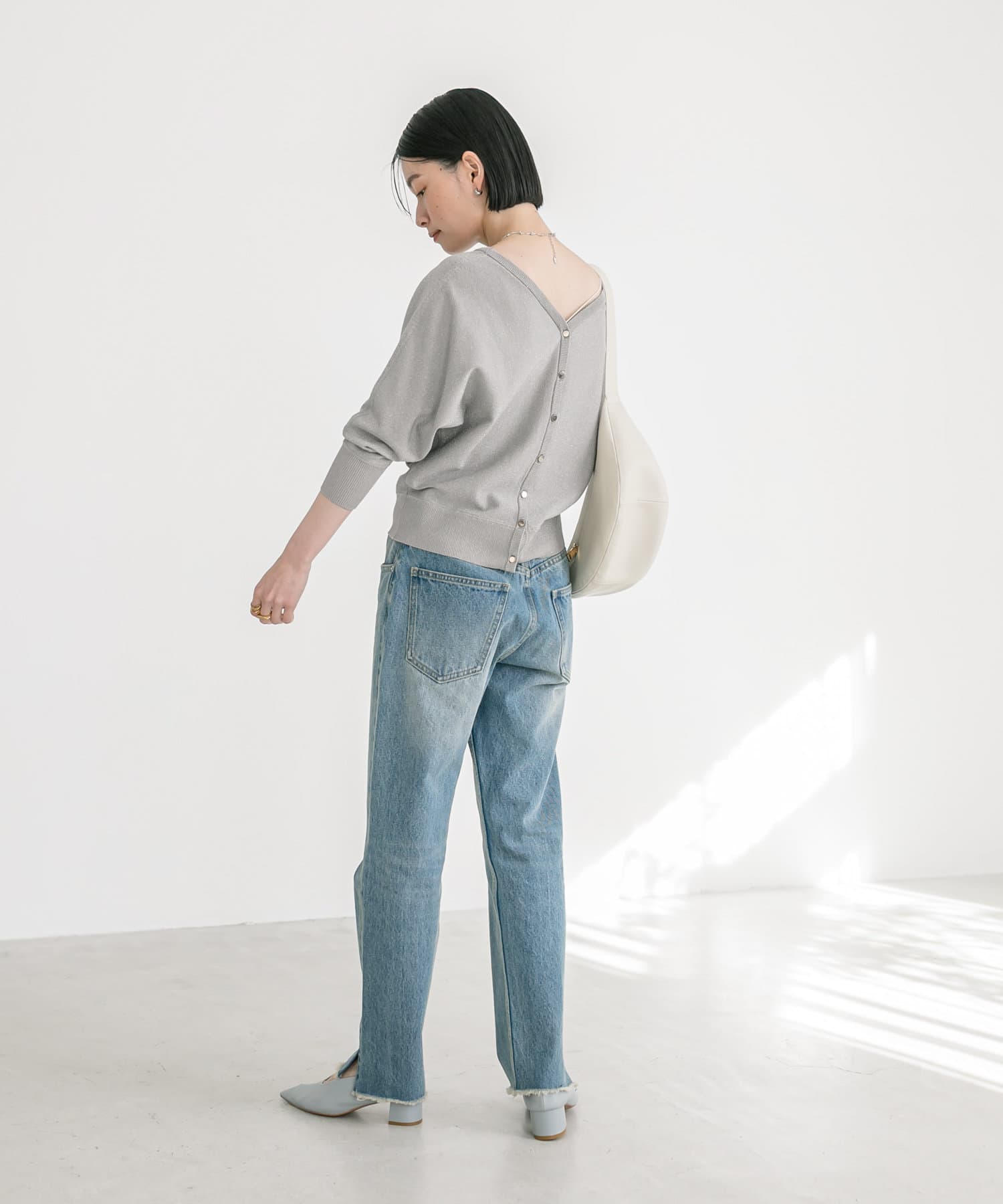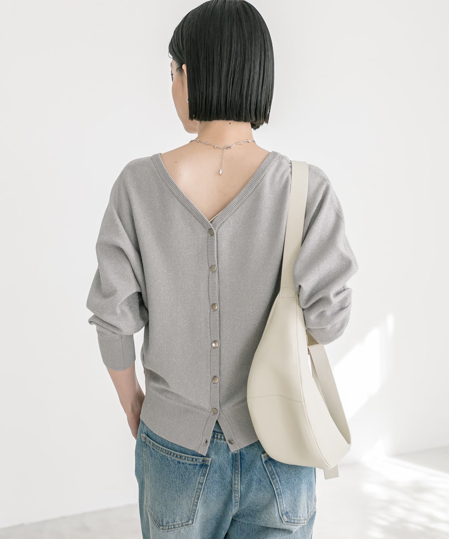 ボタンを前にしてカーディガンとしても、後ろにしてプルオーバーニットとしても着れるアイテムです。
